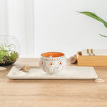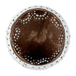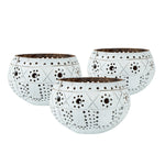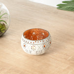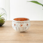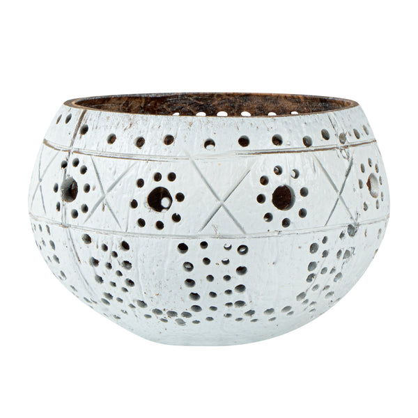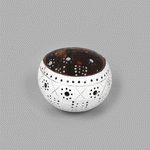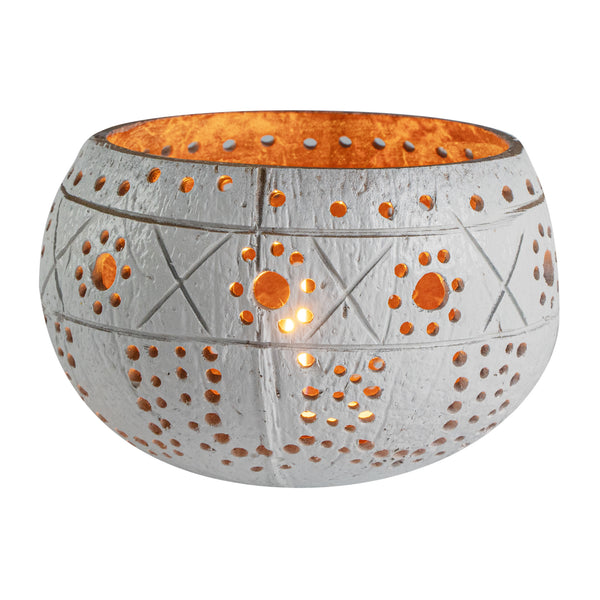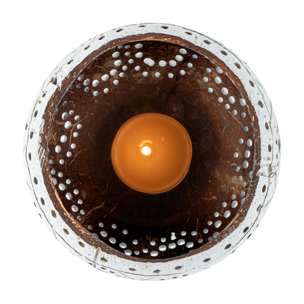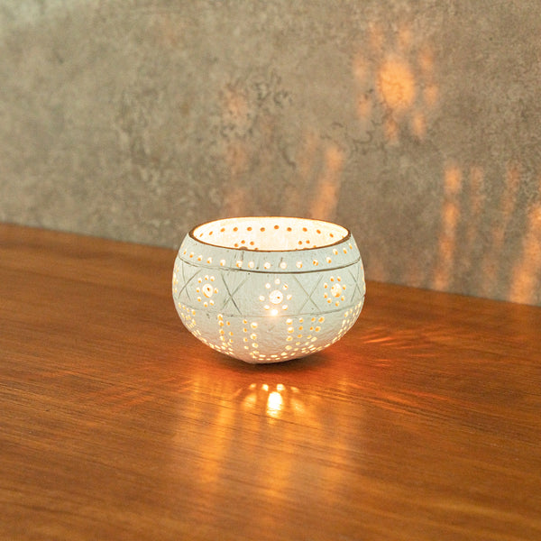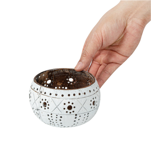 WHITE HANDMADE COCONUT SHELL CANDLE HOLDER - SUN AND LIGHT PATTERN