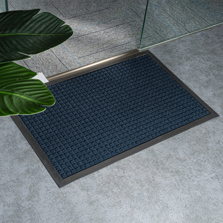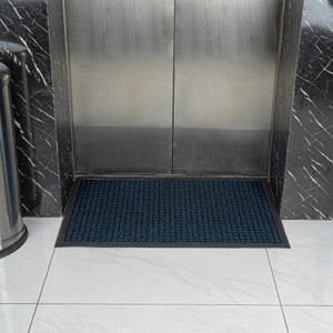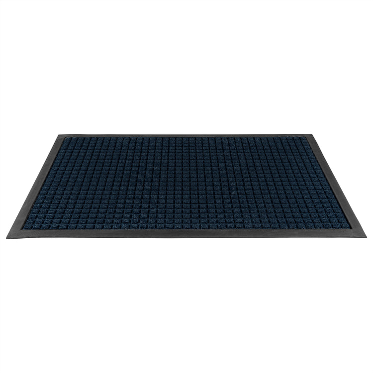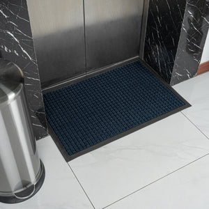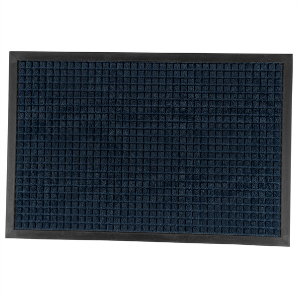 Trap dirt at the door with our Comfy Feet Blue Heavy-Duty Carpet Floor Mat. This indoor mat is made from moisture-resistant polypropylene to effectively capture water to easily maintain your clean floors. The waffle surface of this floor mat keeps grimy dirt in its ridges to keep unsightly dirt off of your floor. Featuring a non-slip surface, this doormat prevents any type of accident. Equipped with a non-skid backing, this outdoor mat is designed to stay in place without the risk of it shifting or slipping. The blue finish of this entryway mat won't fade and keeps your entryway looking flawless. Perfect for businesses or residences, this entrance mat measures 36 inches long by 24 inches wide. Sold in a 1 count box.