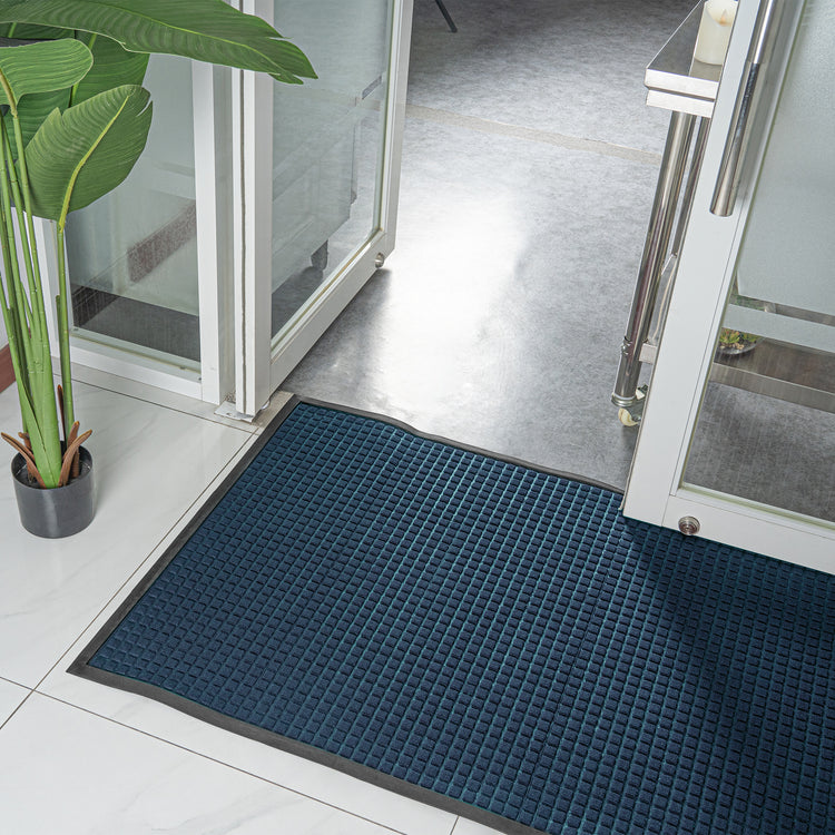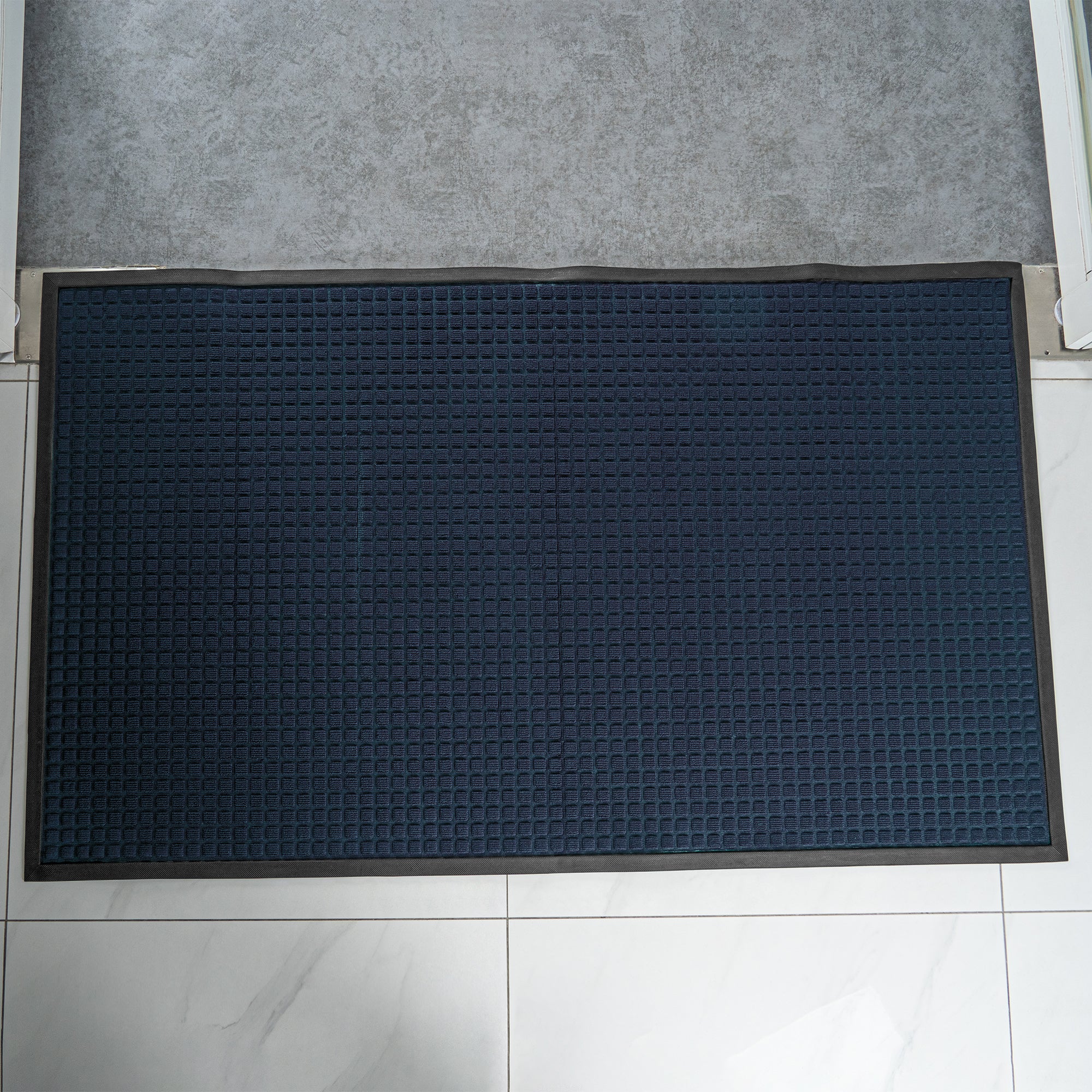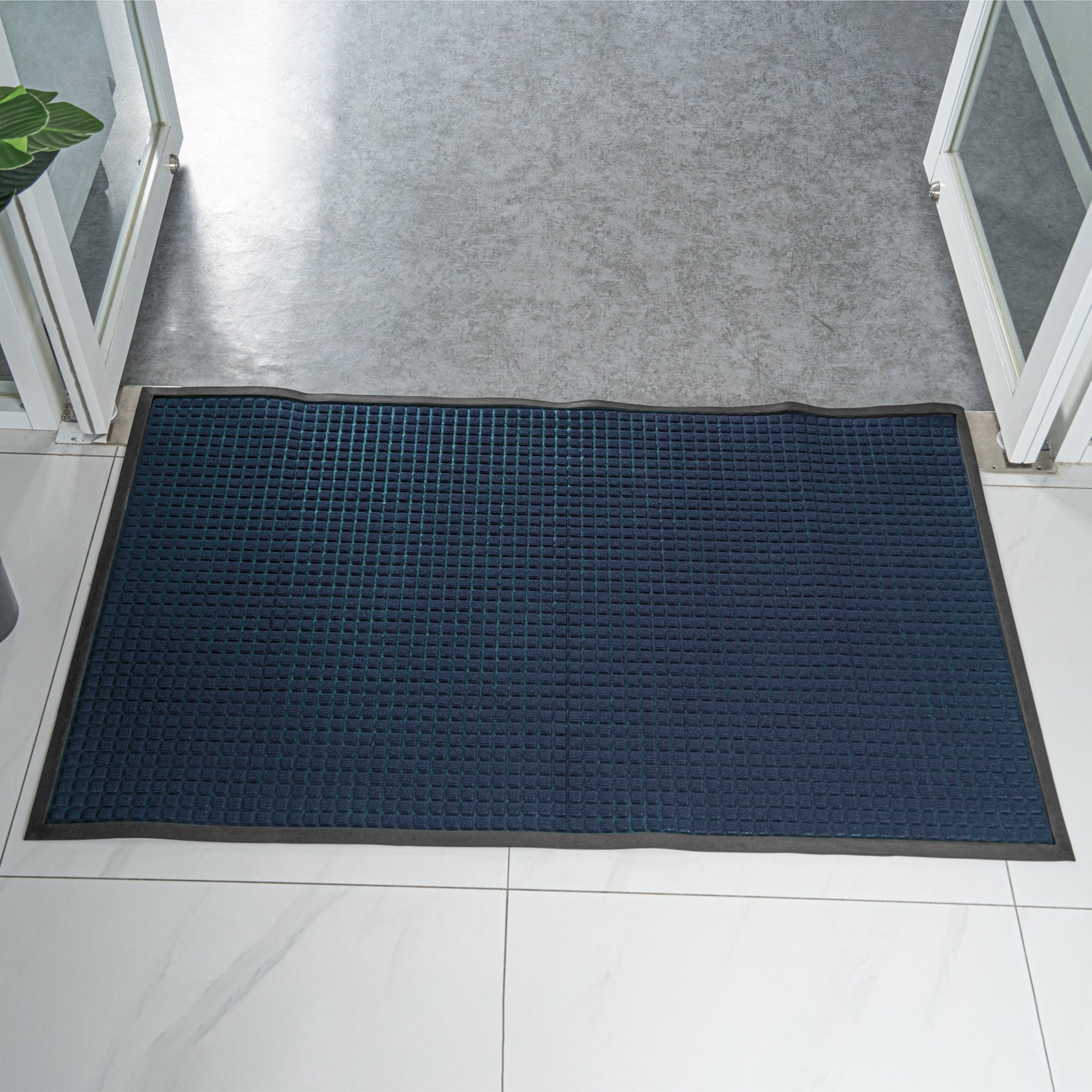 Brighten up your entrance with our Comfy Feet Blue Heavy-Duty Carpet Floor Mat. This blue doormat is crafted from durable polypropylene and can withstand heavy foot traffic, ensuring longevity. With a stain-resistant and moisture-resistant design, this floor mat gives you a spotless and impressive entryway. This indoor mat has a non-slip and non-skid backing to prevent falls in slippery areas. The waffle design of this outdoor mat collects moisture and dirt in its ridges to help keep your floors clean. This entryway mat has a beautiful blue finish that delights anyone who crosses the threshold to your lobby, kitchen, restaurant, or home. Measuring 60 inches long by 36 inches wide, this blue mat is ideal for double-door entrances. Shipped in a 1 count box.
