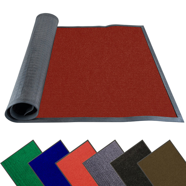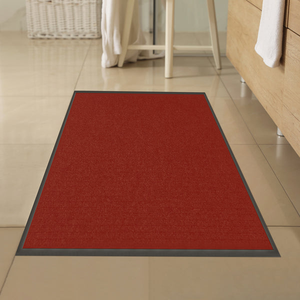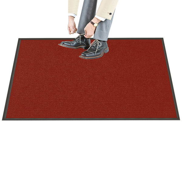 Keep your floors clean with our Comfy Feet Dark Red Carpet Floor Mat. Made with polyester, this doormat is ideal for indoor and outdoor use, as it keeps your entryway free from unsightly stains and spots. Designed with a ribbed surface, this entryway mat effectively removes dirt and moisture from the soles of shoes to protect your floors. This floor mat has a vinyl backing and border to keep it in place and creates a safe environment to reduce the risk of falling hazards for your guests, clients, or employees. The reliable vinyl material of this dark red mat prevents scratches or scuffs your floors. This polyester carpet is easily cleaned with a vacuum or hosed with water. The ruby red finish on this floor mat won't fade and always looks inviting on your doorstep. Measuring 60 inches long and 36 inches wide, this outdoor mat is ideal for wide entryways. Shipped in a 1 count box.