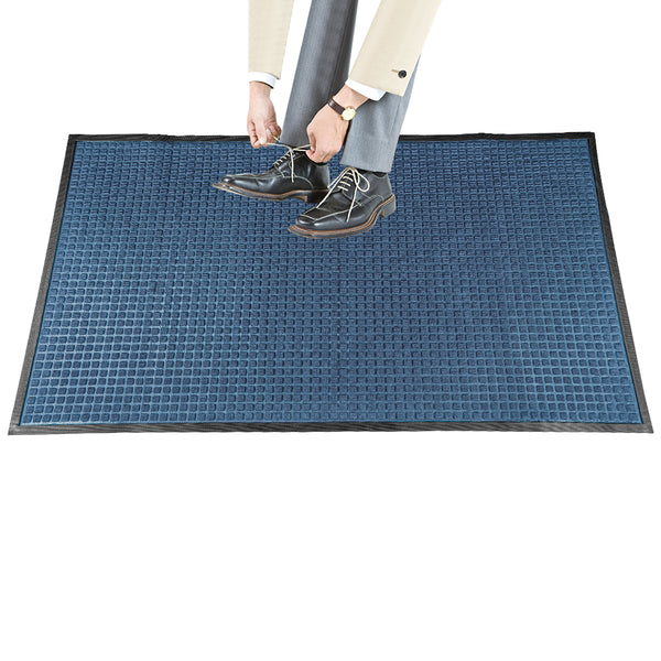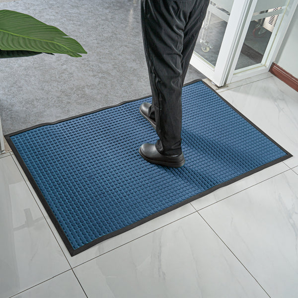 Create a beautiful entrance with our Comfy Feet Light Blue Heavy-Duty Carpet Floor Mat. This light blue doormat is constructed out of durable polypropylene fibers that is perfect for areas with heavy foot traffic. The moisture-resistant and stain-resistant design of this entryway mat resists liquid damage and retains its professional look. This indoor mat is designed with a waffle pattern to trap dirt and soil to prevent floors from getting messy. The light blue finish of this outdoor mat creates a welcoming invitation at the entrance of your restaurant, lobby, home, or kitchen. This floor mat measures 60 inches long by 36 inches wide. Shipped in a 1 count box.