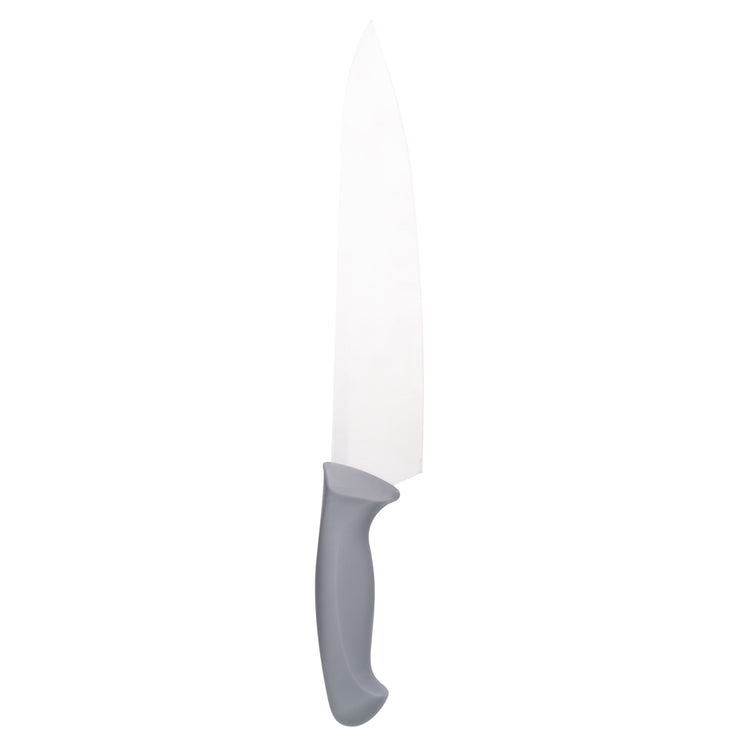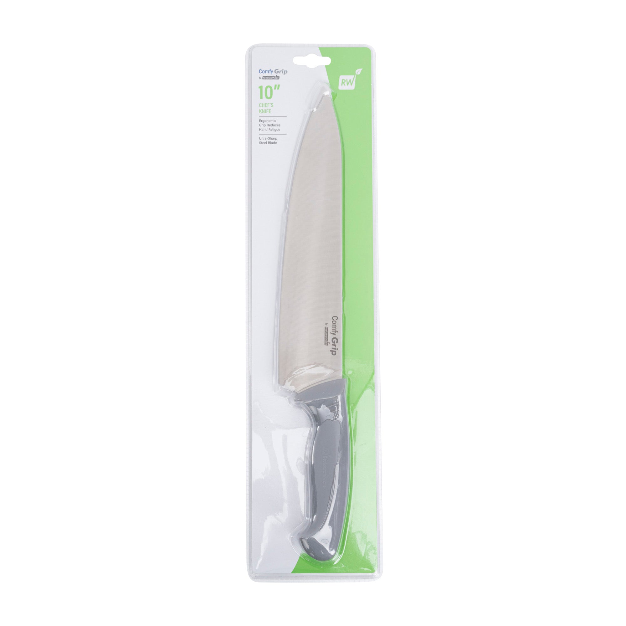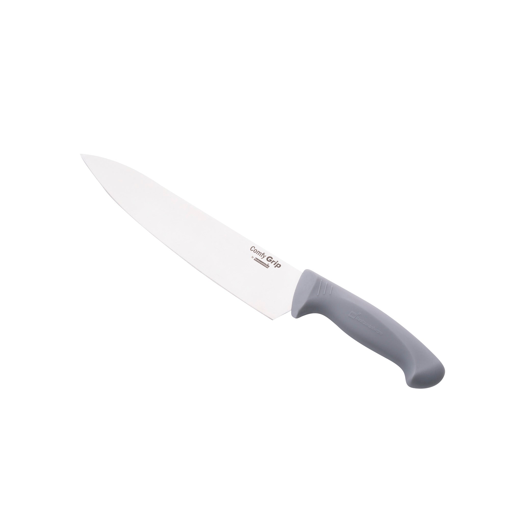 Effortlessly tackle any culinary task with the Comfy Grip Stainless Steel Chef Knife. This chef knife features a 10-inch stainless steel blade that provides versatility for slicing, dicing, mincing, or chopping, making it an essential tool for any kitchen. The ergonomic gray handle ensures a comfortable and secure grip, reducing hand fatigue and enhancing precision during extended use. Crafted from durable stainless steel, this professional chef knife excels in precisely cutting tough ingredients, delivering consistently excellent results. Whether you're a culinary student or a seasoned professional, this stainless steel kitchen knife is designed to withstand the rigorous demands of a busy restaurant environment. With a length of 15.43 inches, this knife is perfect for restaurant kitchens aiming to equip their staff with ergonomic and efficient cutting tools. Enhance your food preparation capabilities today. Sold in a 1 count box.
