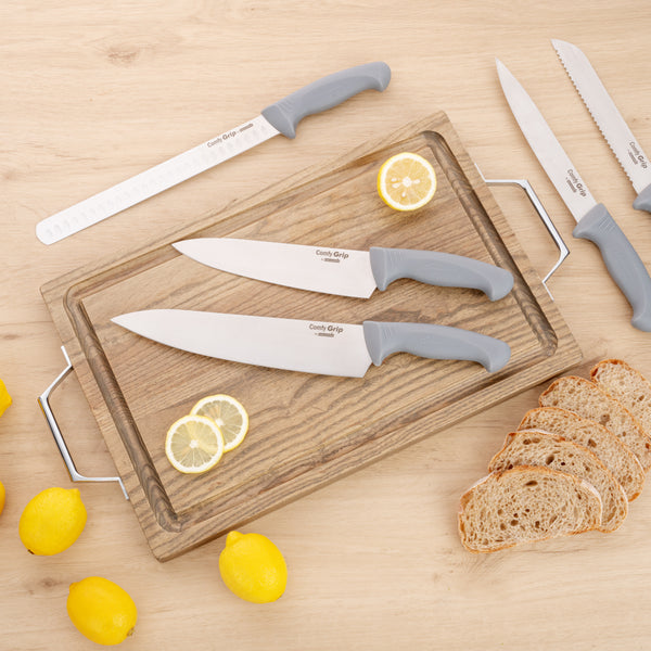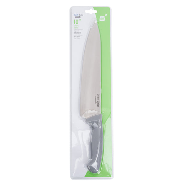 Effortlessly tackle any culinary task with the Comfy Grip Stainless Steel Chef Knife. This chef knife features a 10-inch stainless steel blade that provides versatility for slicing, dicing, mincing, or chopping, making it an essential tool for any kitchen. The ergonomic gray handle ensures a comfortable and secure grip, reducing hand fatigue and enhancing precision during extended use. Crafted from durable stainless steel, this professional chef knife excels in precisely cutting tough ingredients, delivering consistently excellent results. Whether you're a culinary student or a seasoned professional, this stainless steel kitchen knife is designed to withstand the rigorous demands of a busy restaurant environment. With a length of 15.43 inches, this knife is perfect for restaurant kitchens aiming to equip their staff with ergonomic and efficient cutting tools. Enhance your food preparation capabilities today. Sold in a 1 count box.