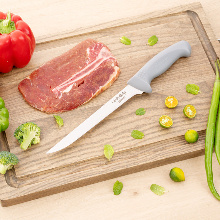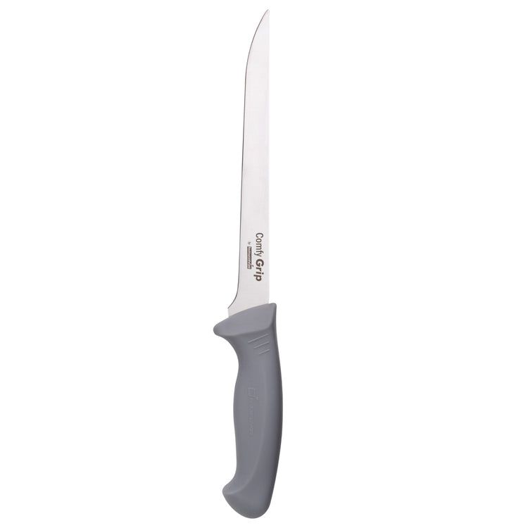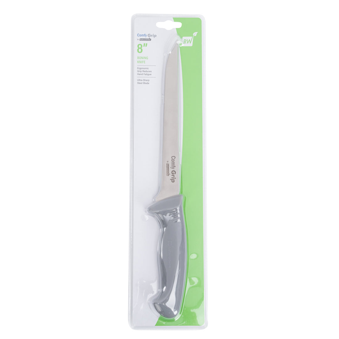 Achieve flawless cuts with the Comfy Grip Stainless Steel Boning Knife. Featuring a durable stainless steel construction, this boning knife offers precision and strength to tackle the toughest meats, ensuring clean cuts and minimal waste in professional kitchens. Its TPE plastic handle provides a non-slip grip, reducing the risk of accidents and enhancing safety during meat cutting tasks. Designed with a narrow blade, this meat cutting knife excels at creating deep cuts and holes, making it ideal for intricate work in butcher shops or catering operations. With a convenient length of 8 inches, this fish filleting knife allows for detailed work with fish, poultry, and meats, essential for chefs focusing on precision cuts. The ergonomic gray handle minimizes hand fatigue, supporting extended use in high-volume environments. Elevate your kitchen's efficiency and reliability with this indispensable tool. Sold in a 1 count box.