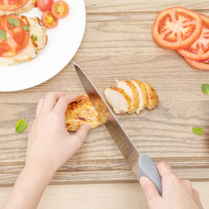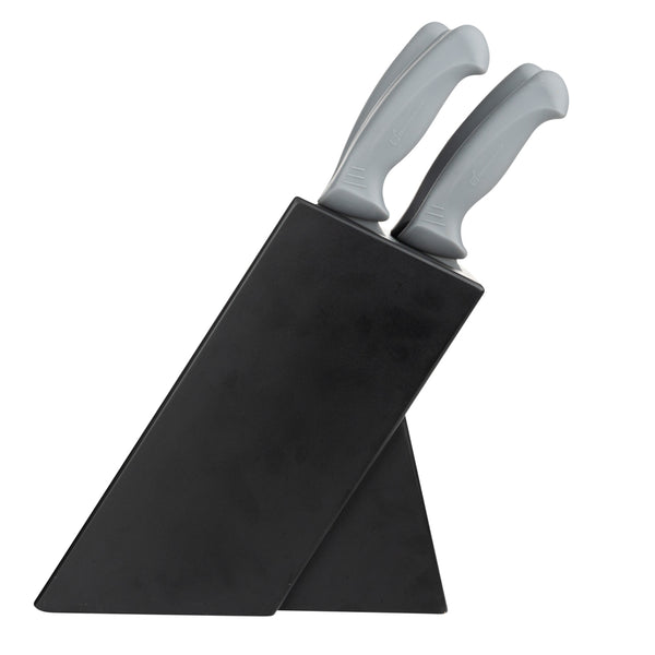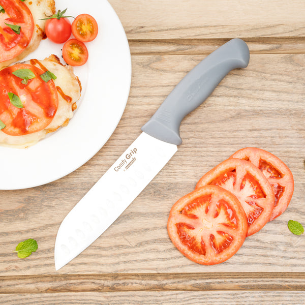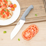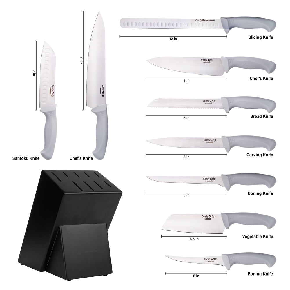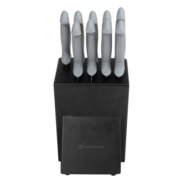 Upgrade your culinary toolkit with precision cutting. The Gray Non-Slip Grip Kitchen Knife Set features stainless steel blades that cut through tough ingredients precisely, enhancing efficiency in any professional kitchen. Designed with chefs in mind, this chef knife set includes TPE plastic handles that provide a secure and comfortable grip, ensuring safety and reducing hand fatigue during long prep sessions. The included knife holder not only organizes but also protects your knives, maintaining their sharpness and extending their longevity. This santoku knife set is housed in an organized storage solution with dimensions of 17 inches in length, 6 inches in width, and 10.5 inches in height, perfect for compact kitchen spaces. Experience the reliability and performance of stainless steel, making it a vital addition to any foodservice establishment. Each order includes 9 Gray Non-Slip Grip Kitchen Knife Set.