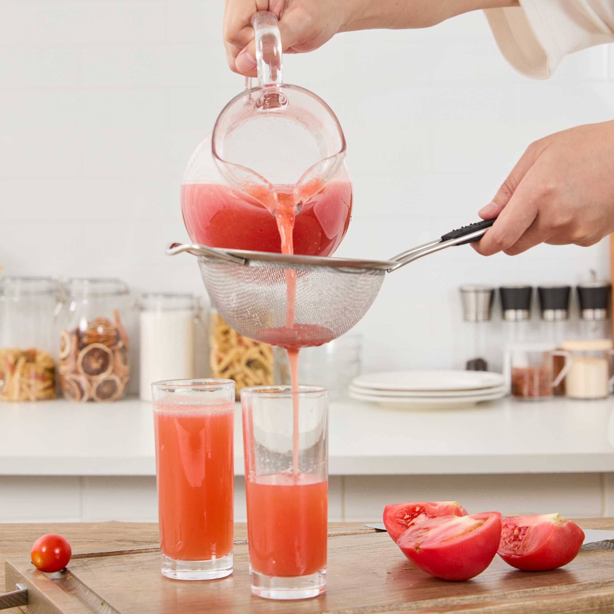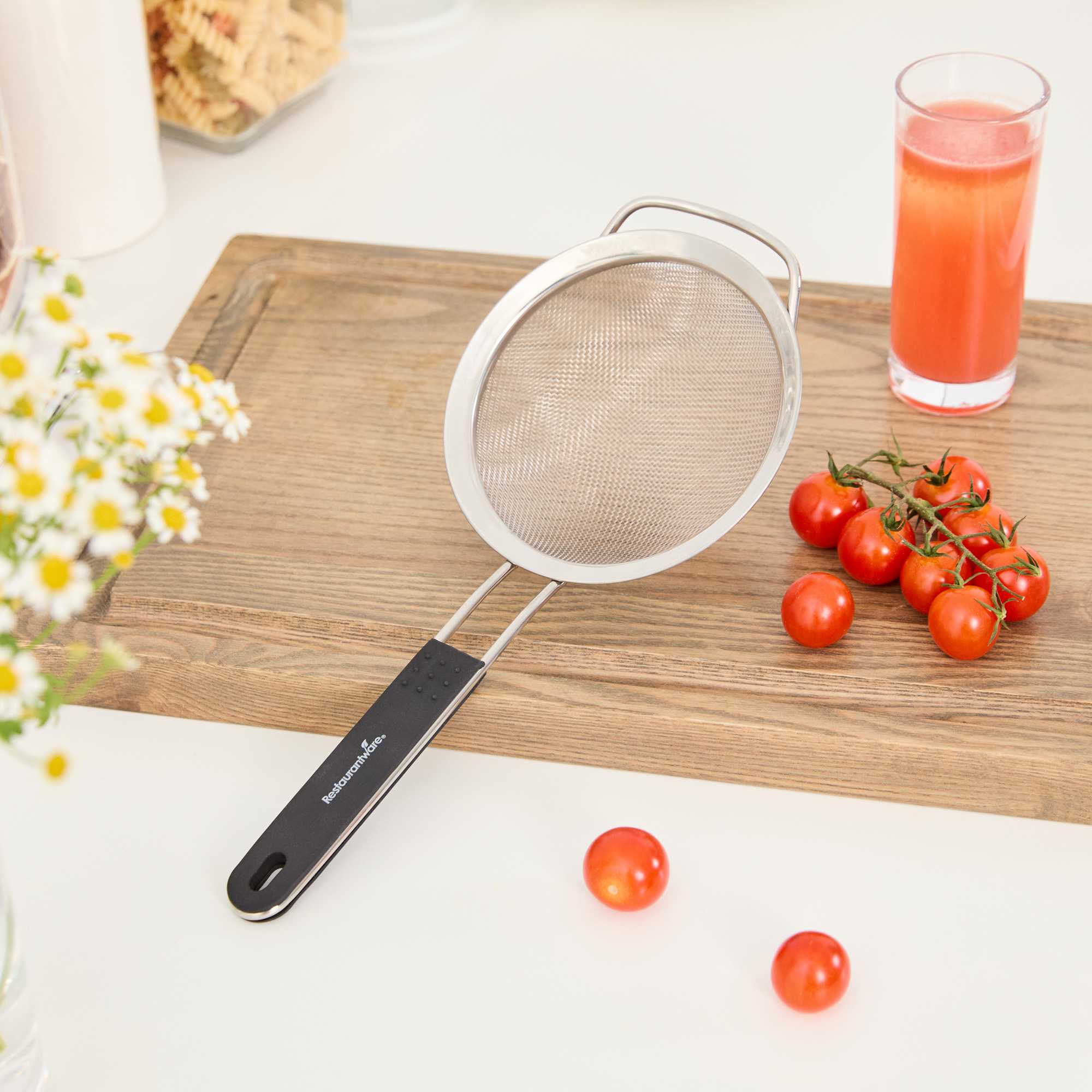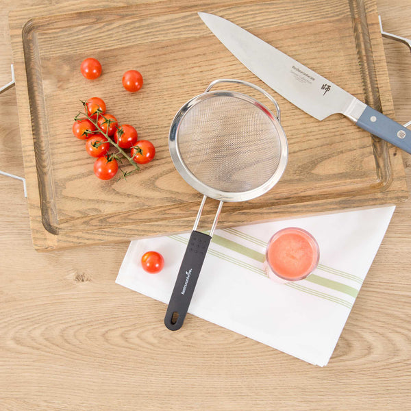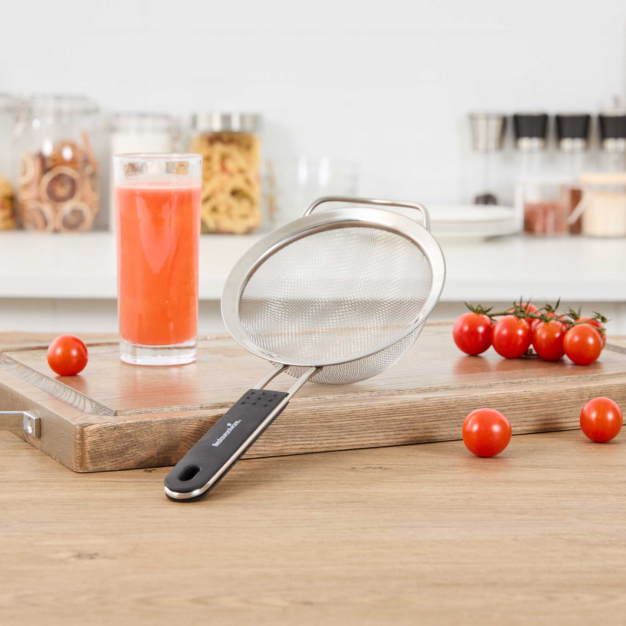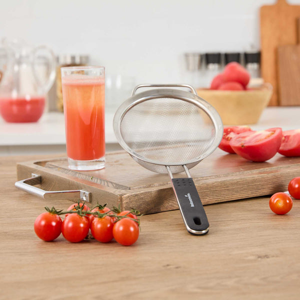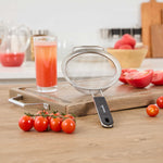 - Extra fine mesh filters out small particles for smooth sauces, broths, and teas