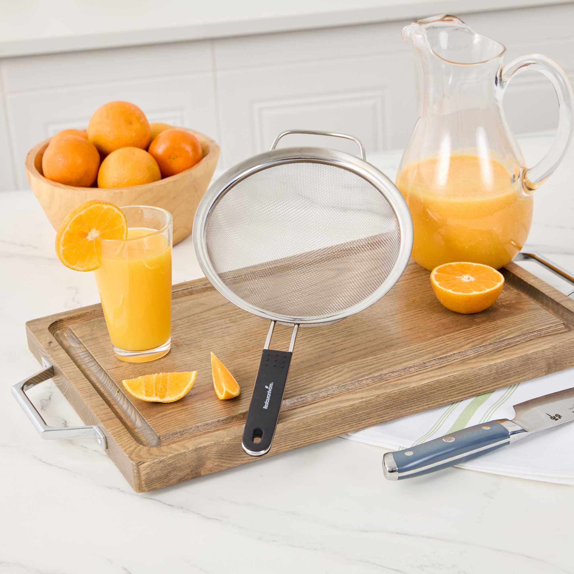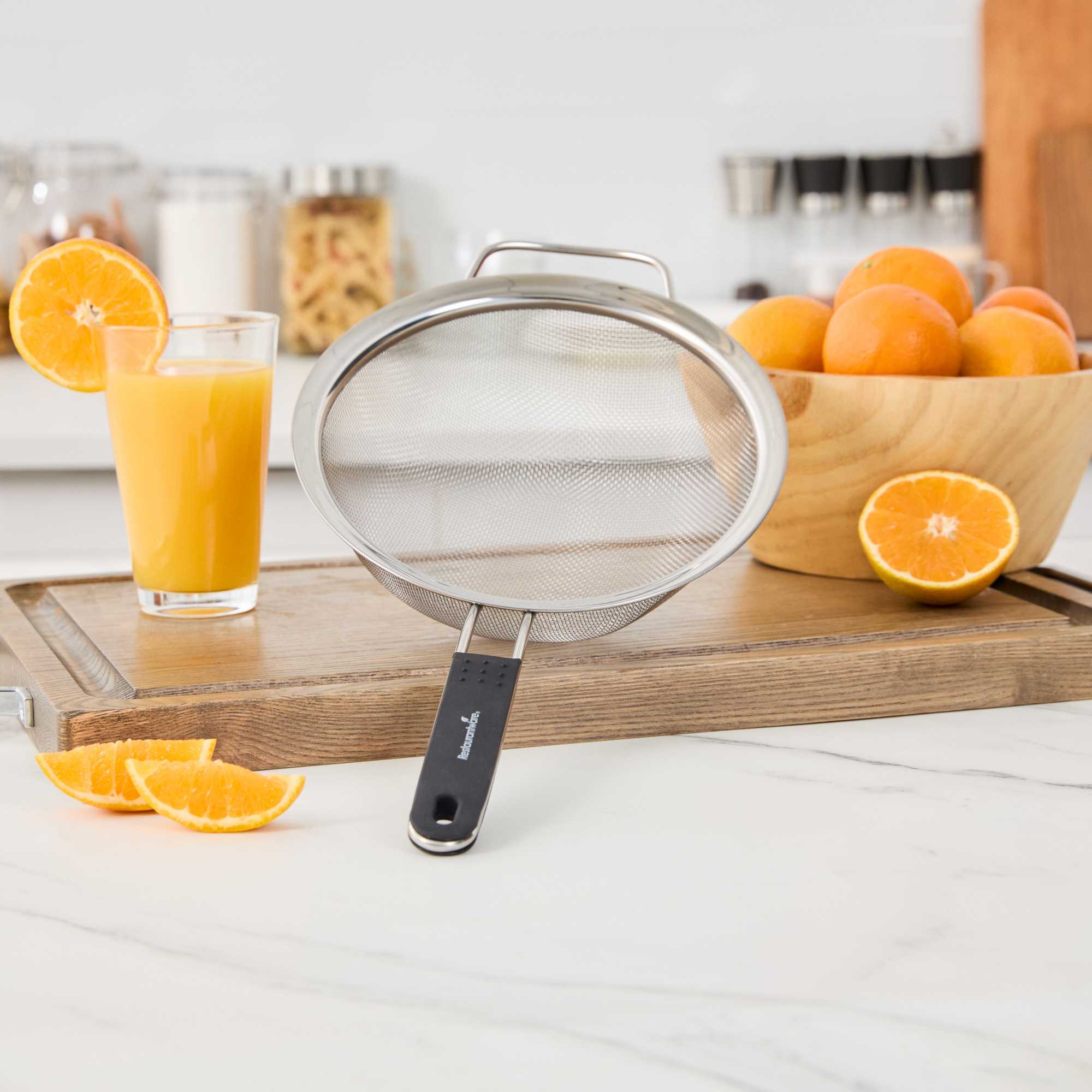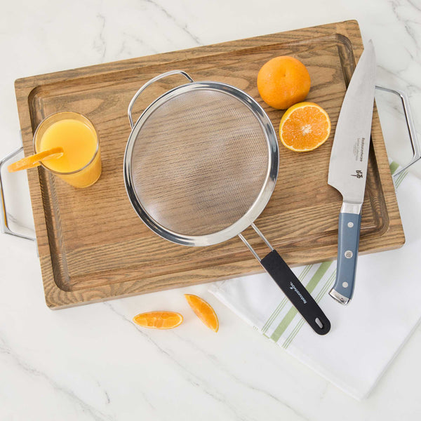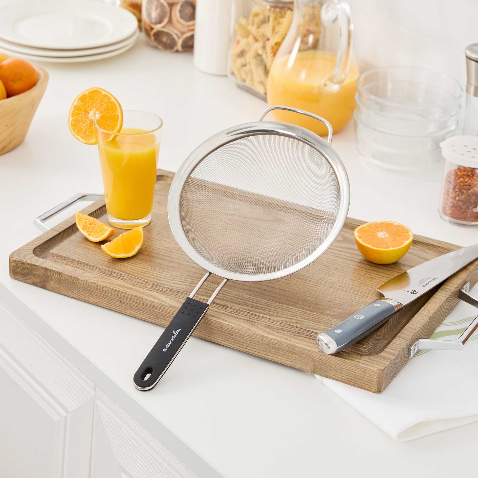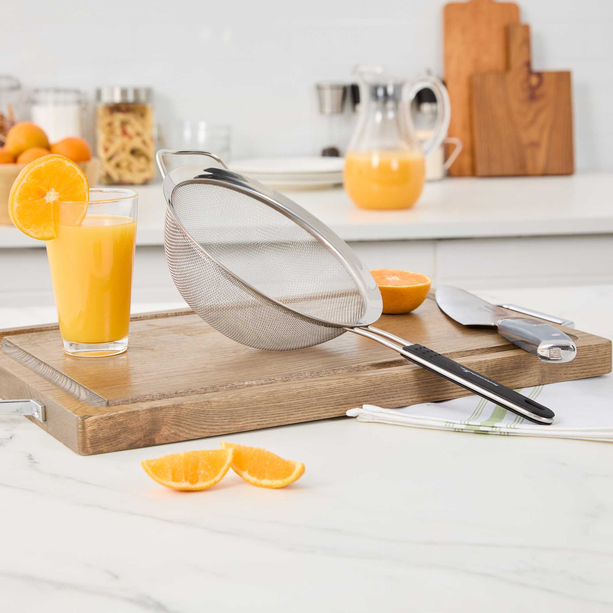 - Extra fine mesh filters out small particles for smooth sauces, broths, and teas