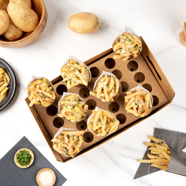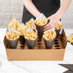 Hold and display your paper cones with our Cone Tek Kraft Paper Cone Holders. Pair these cone holders with our compatible paper food cones to enhance your presentations. These paper cone holders are designed with handles for easy transport, making them ideal for passing out food cones at catered events or confetti cones at a wedding. Equipped to hold 30 cones, these confetti cone holders are perfect for large-scale events. These cone holders are made from sturdy paper to securely hold cones in place without falling over. Designed to be versatile, these cone holder stands can be used to hold charcuterie, waffle cones, or french fry cones. With a kraft finish, these food cone holders provide a rustic feel to your special event. The diameter of each slot on these confetti cone holders measures 1.38 inches. Each paper cone holder with handles measures 14.25 inches long by 8.25 inches wide by 6 inches tall. Sold in a 10 count box. Paper food cones are available and sold separately.