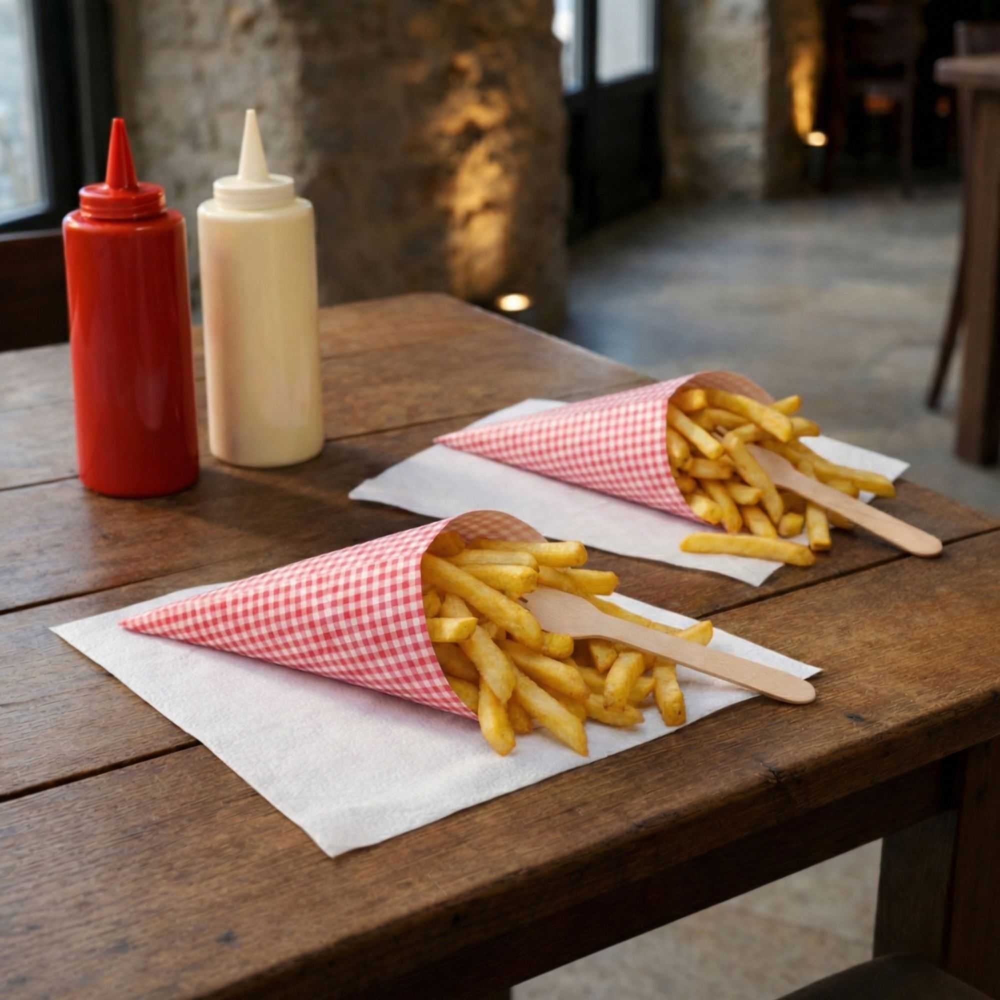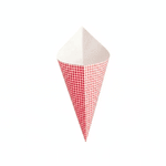 Artfully display mouthwatering french fries using our Cone Tek Paper Food Cones. These food cones have a classic picnic print to perfectly complement the decor at parties, food trucks, or catered events. The wide opening of these french fry cones makes them easy to hold and pass around at events. Crafted with durable heavyweight paper, these paper cones for food maintain their shape when filled with your delicious appetizers. Featuring a grease-resistant lining, these french fry cones provide you with a mess-free way to serve dishes at your establishment. These food cones are conveniently recyclable for a quick and hassle-free cleanup after use. To display your treats, pair these paper cones for food with our collection of cone stands. These food cones measure 11.5 inches long by 5.5 inches wide and are shipped in a 100 count box. Cone stands are available and sold separately.