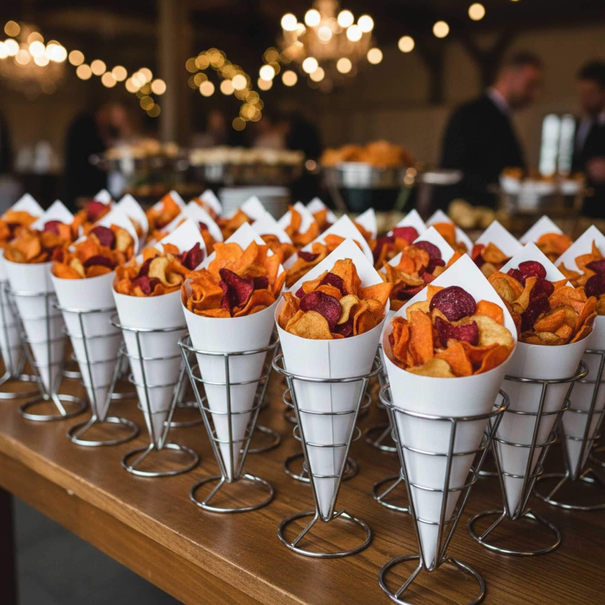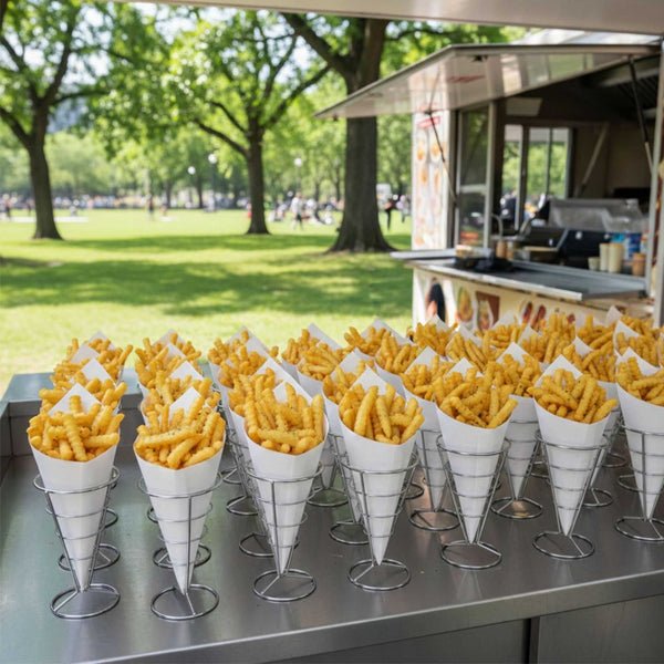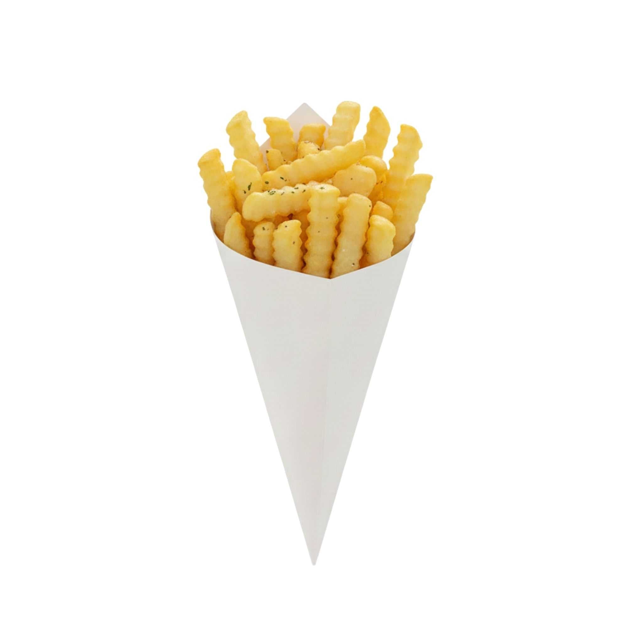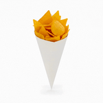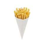 Make it easy to take finger foods on the go with these Cone Tek White Food Cones. Featuring a heavyweight paper construction, these food cones have a sturdy design that can handle the weight of heavy portions without bending. Ideal for use as french fry cones or popcorn cones, these paper cones for food are grease-resistant to prevent any unsightly oily stains. Use them to make your food truck's fare effortlessly portable, or as a mess-free serving solution at parties, weddings, and special events. These recyclable food cones provide an easy and low-maintenance cleanup. Pair these fry cones with our cone stands so customers can comfortably enjoy your snacks. Measuring 9.5 inches in length and 4.5 inches in width, these paper cones have plenty of room for a large portion of your best-selling snacks or appetizers. These white food cones are available in bulk 100 count boxes. Cone stands are available and sold separately.