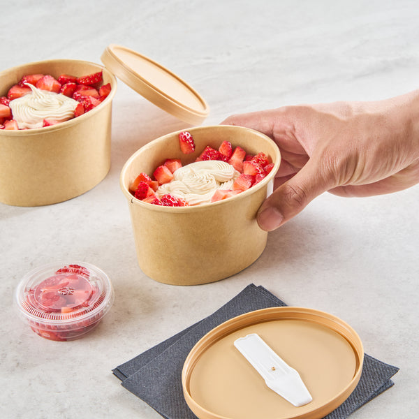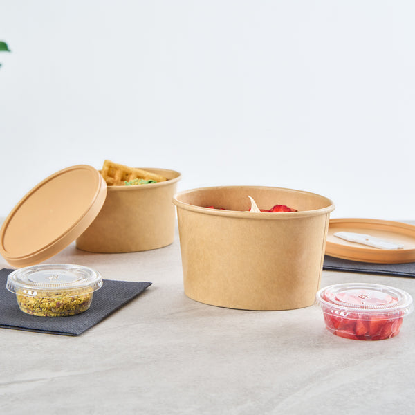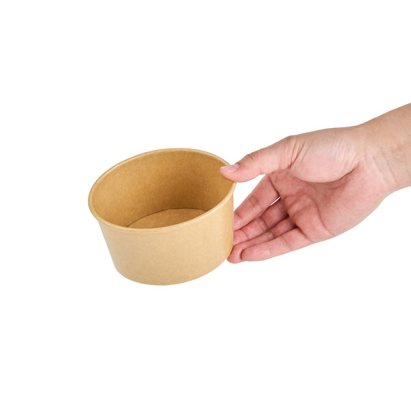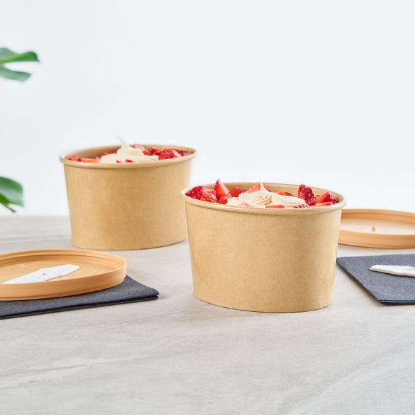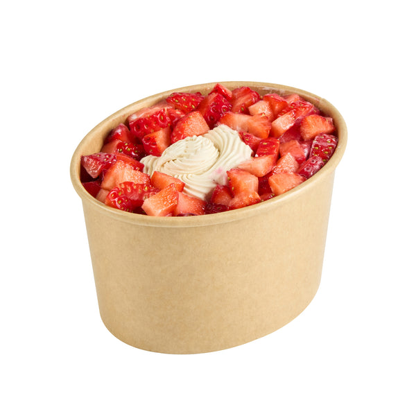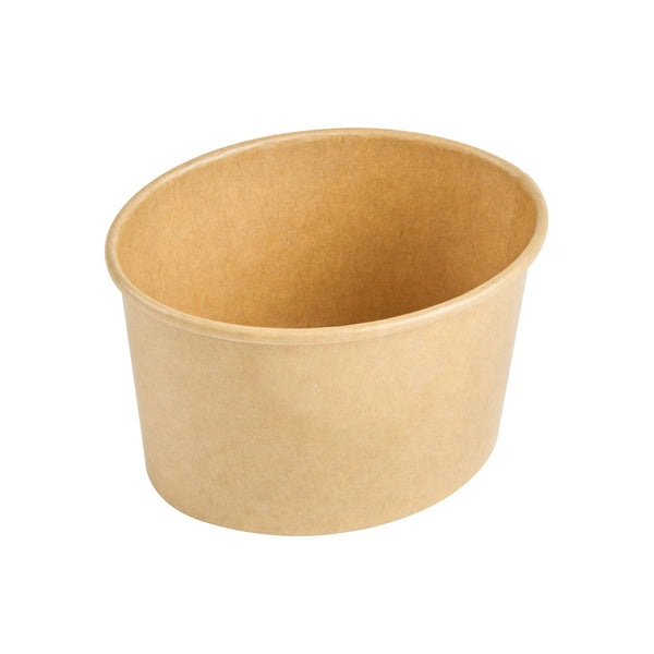 Add a gourmet touch to desserts with our Coppetta 12-ounce Oval Kraft Paper To Go Cups. These oval ice cream cups feature a grease-resistant PE lining to keep oil from seeping through, ensuring a neat food presentation. Crafted from durable paper, these takeaway dessert cups are suitable for a variety of dishes, from soups to frozen yogurts. Eco-conscious customers will appreciate that these kraft paper cups are recyclable, providing an environmentally friendly option for your foodservice needs. Designed with a rolled rim, these to go cups securely hold coordinating lids (SKU: RWA1748BR) for worry-free transport. The natural kraft finish of these disposable cups adds a rustic charm, making them an attractive choice for catering events or food trucks. Additionally, these round ice cream cups are freezer-safe, allowing you to store leftovers effortlessly. Measuring 4.53 inches in length by 3.62 inches in width by 2.68 inches in height, these kraft paper cups have a 12-ounce capacity to accommodate a generous serving size. Sold in a 200 count box.