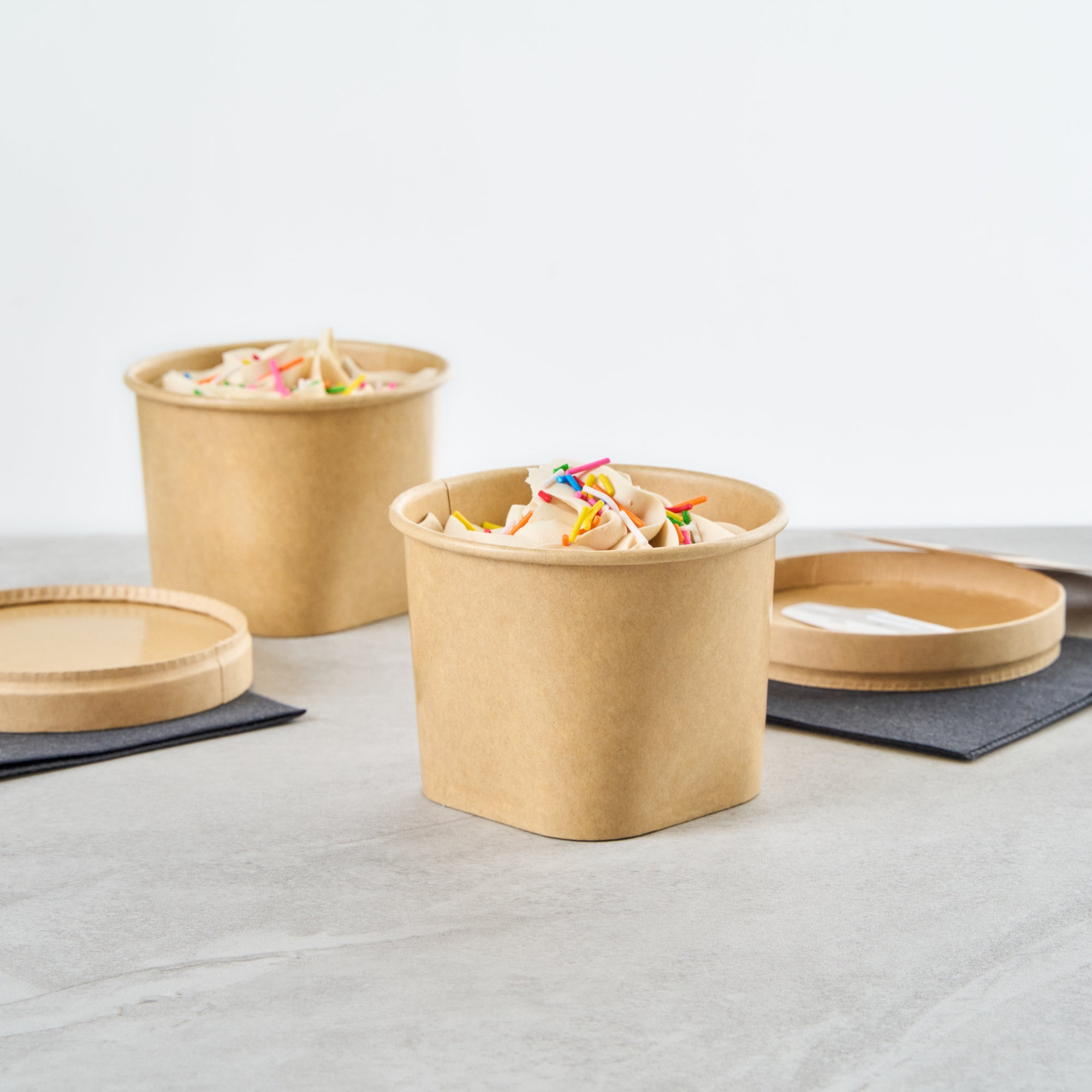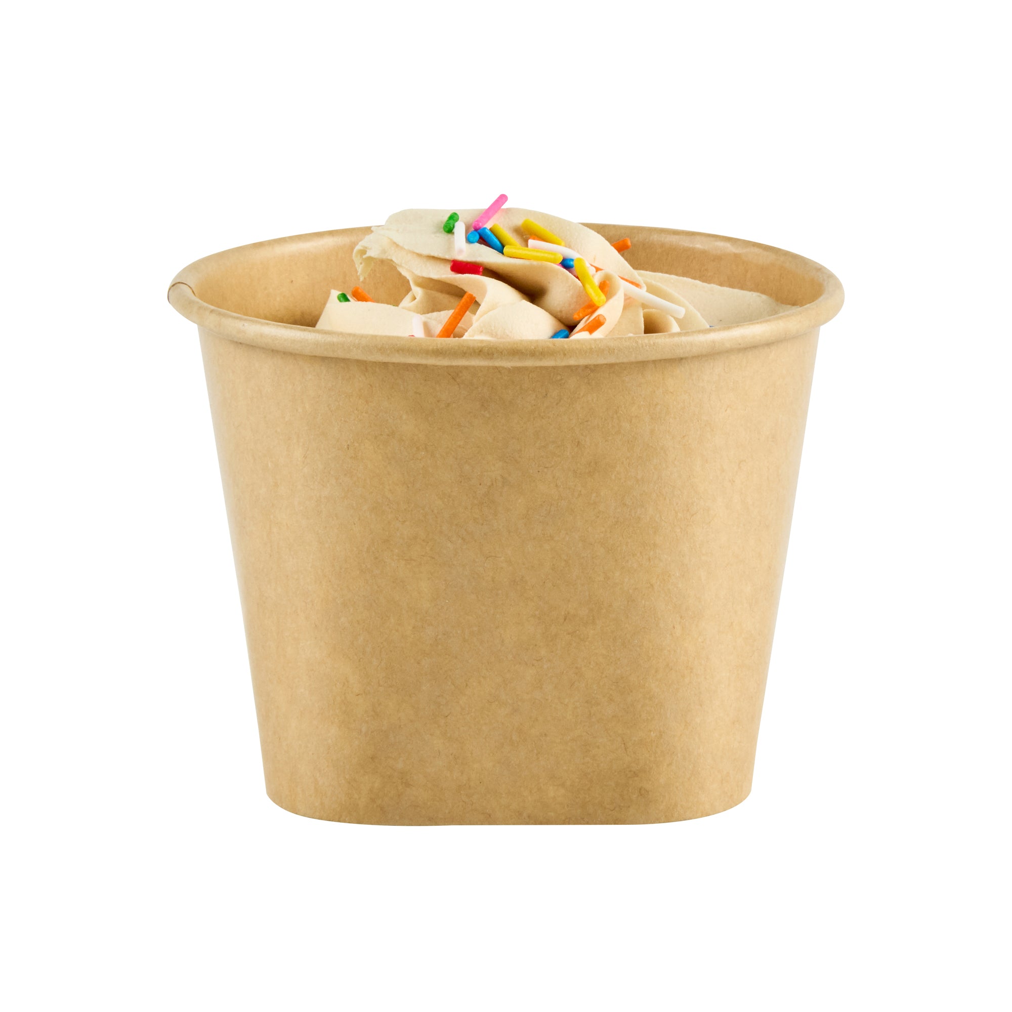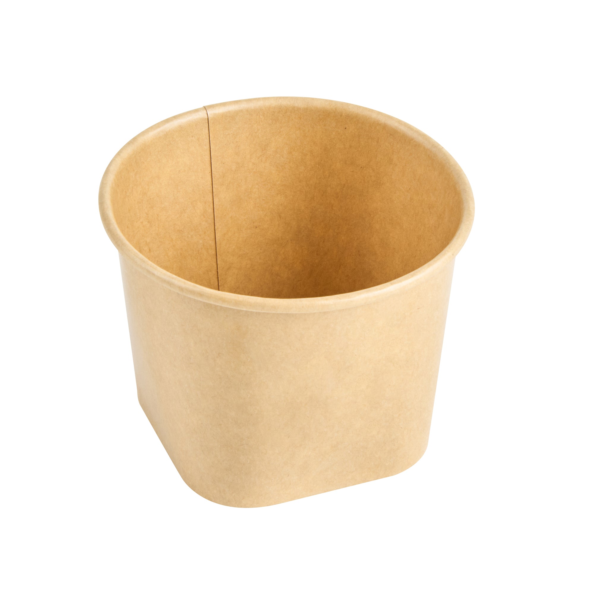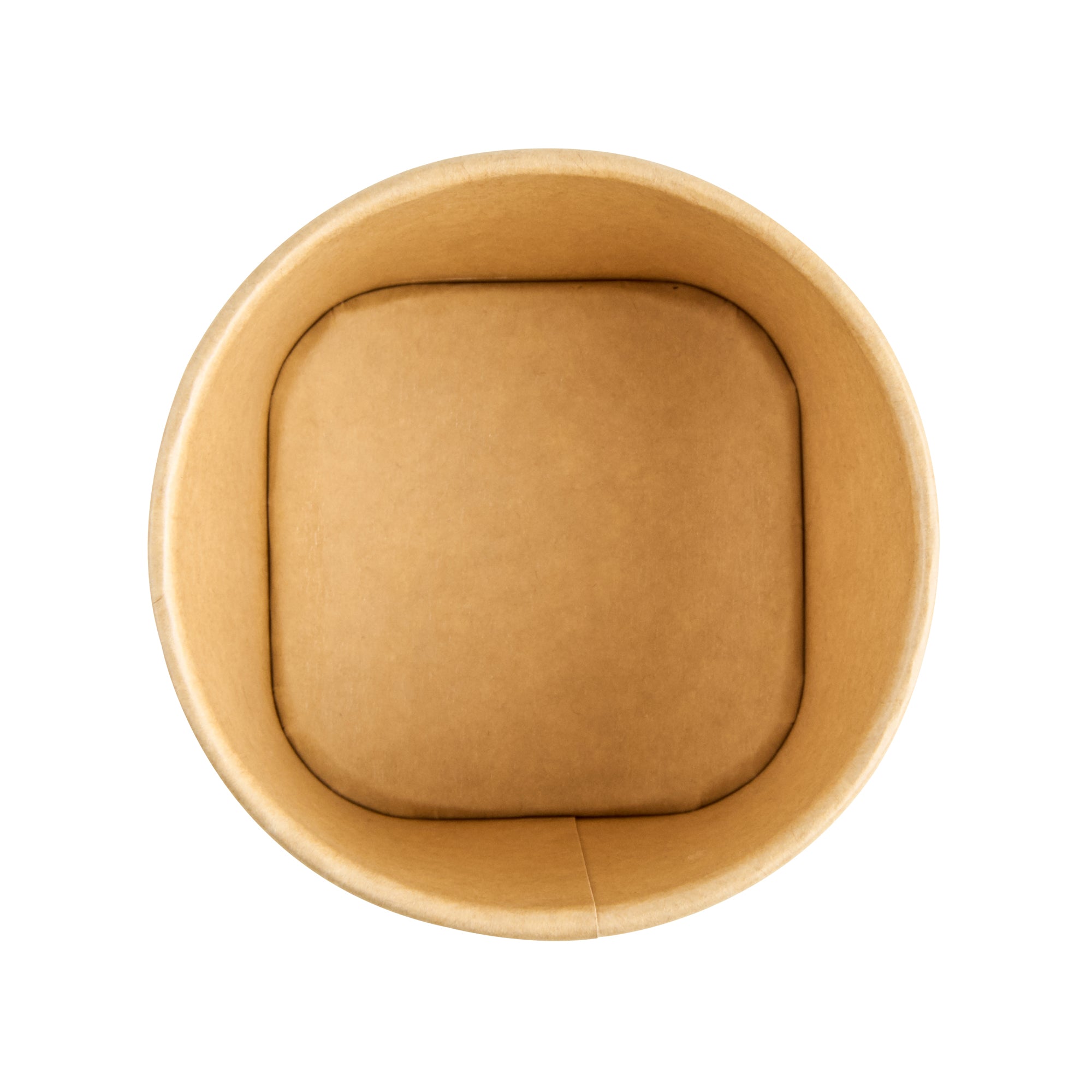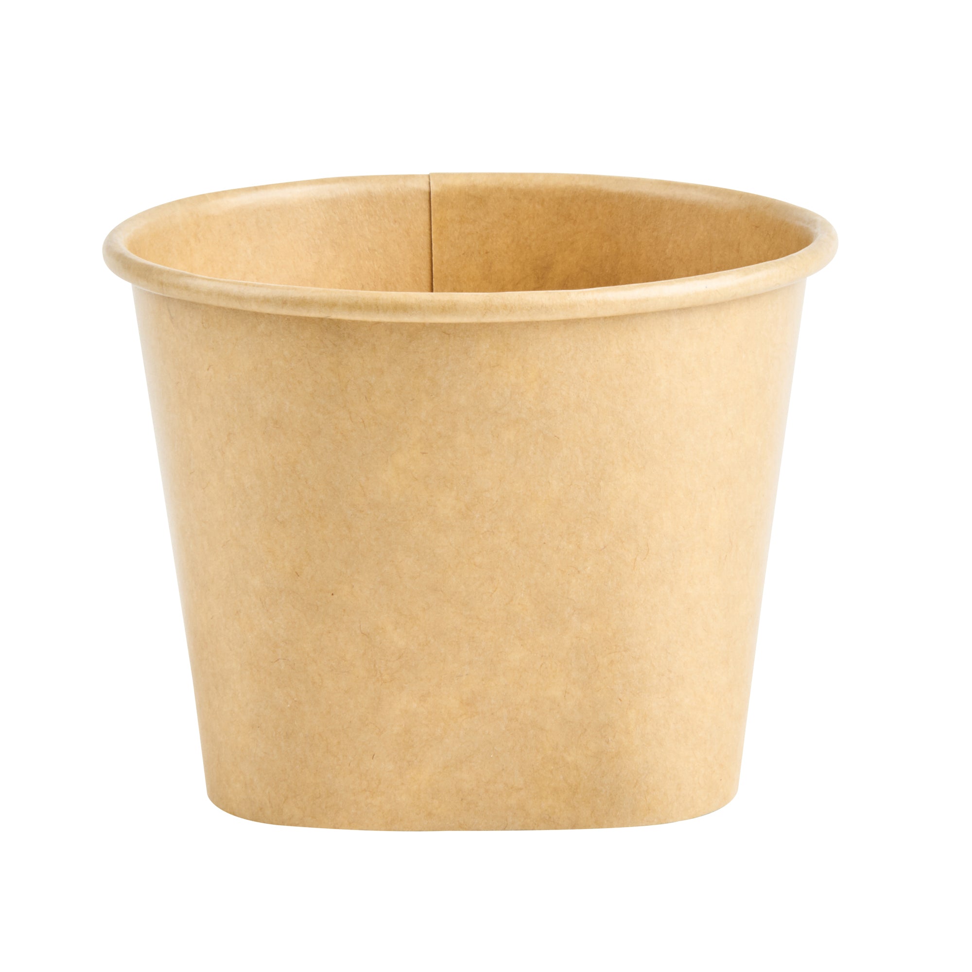 Enhance your foodservice with our Coppetta 12-ounce Round Kraft Paper To Go Cups, perfect for serving a variety of dishes. These takeaway dessert cups feature a grease-resistant PE lining that keeps oil from seeping through, ensuring a neat food presentation. Crafted from durable paper, these cups are suitable for serving both hot and cold foods with ease. The square bottom enhances stability, ensuring the cup stays securely in place during use. The recyclable convenience of these kraft paper cups provides an eco-friendly container for your establishment. Designed with a rolled rim, these to go cups securely hold coordinating lids (SKU: RWA1753BR) to keep your food safe on-the-go. The natural kraft finish of these round ice cream cups adds a rustic charm, ideal for serving soups, frozen yogurts, or fresh fruit salads. These disposable cups are freezer-safe, allowing you to refrigerate leftovers without worry. With a 12-ounce capacity, these kraft paper cups measure 3.82 inches in diameter by 2.87 inches in height. Sold in a 50 count box.