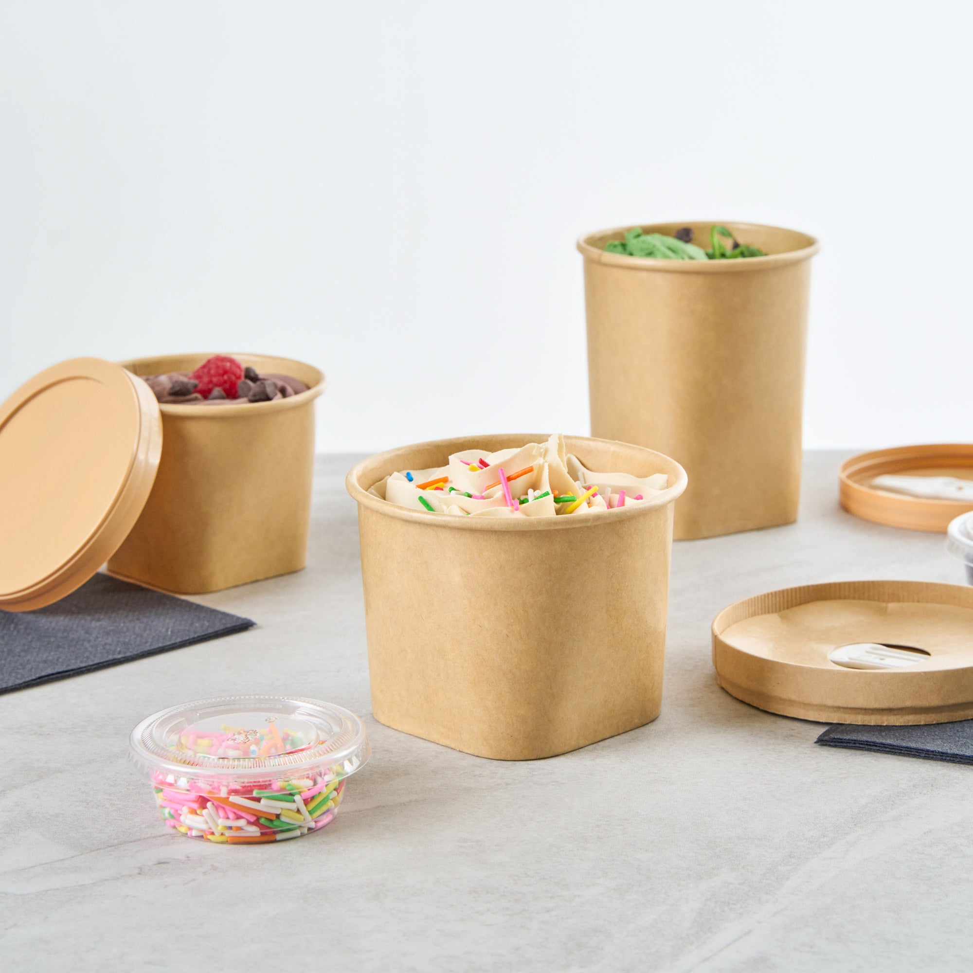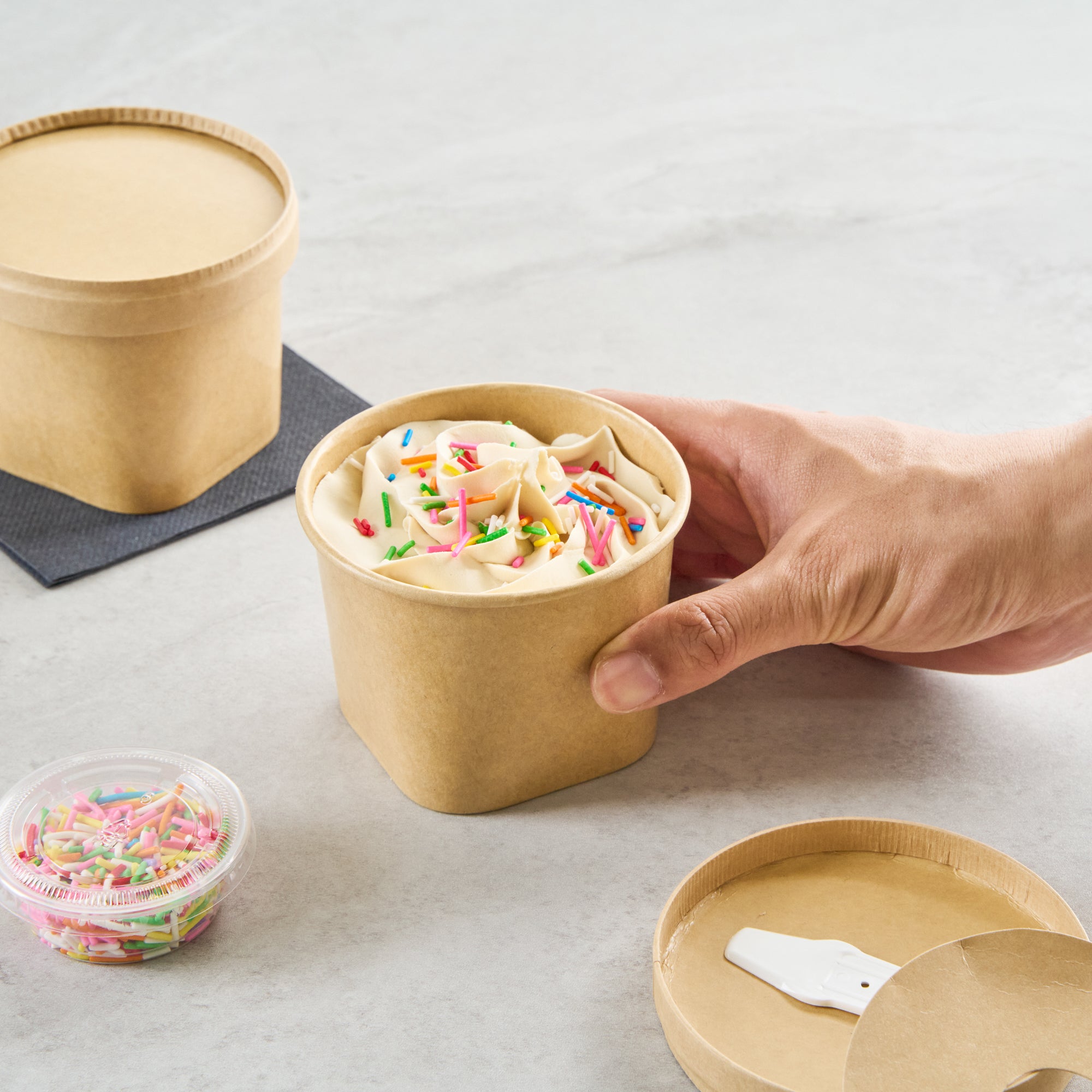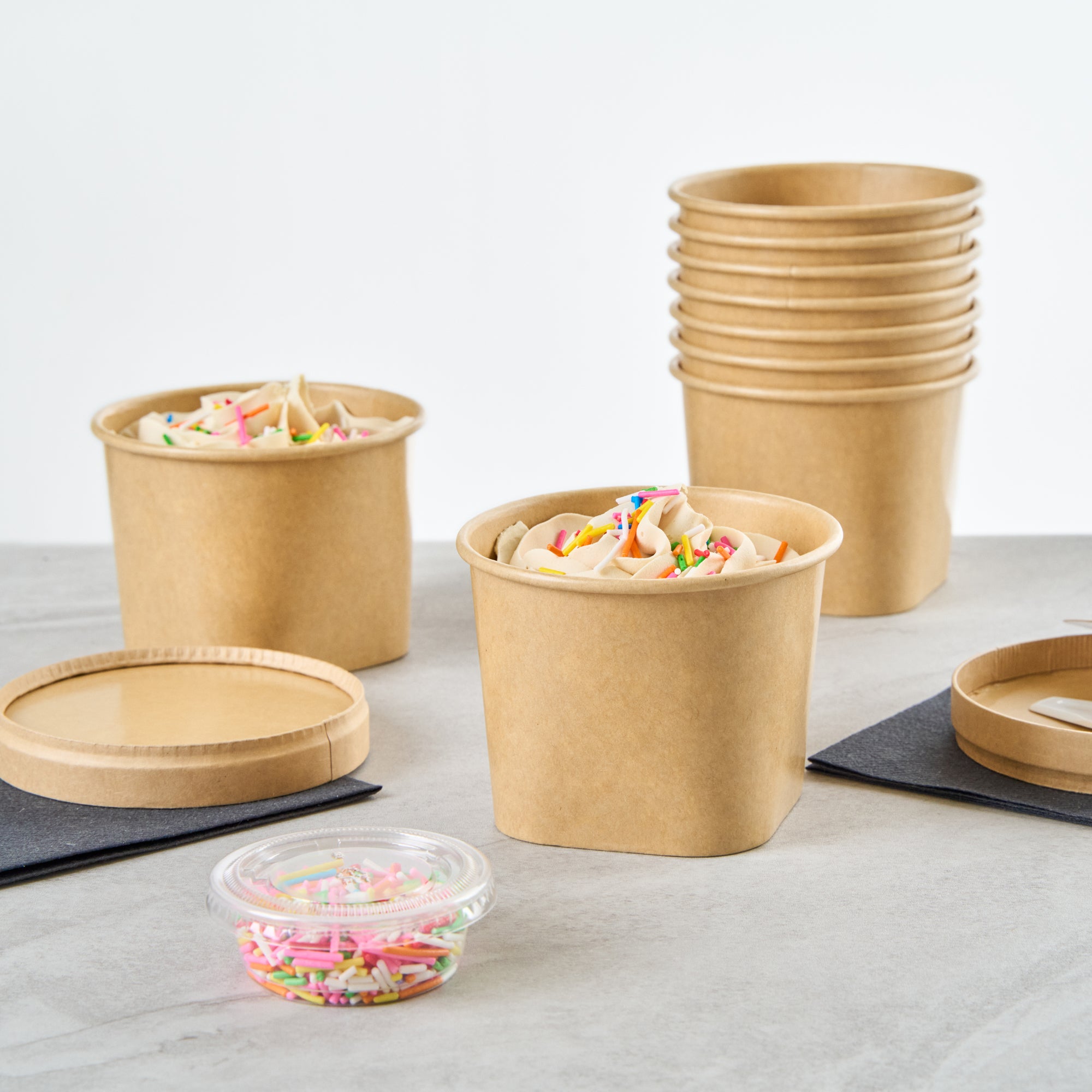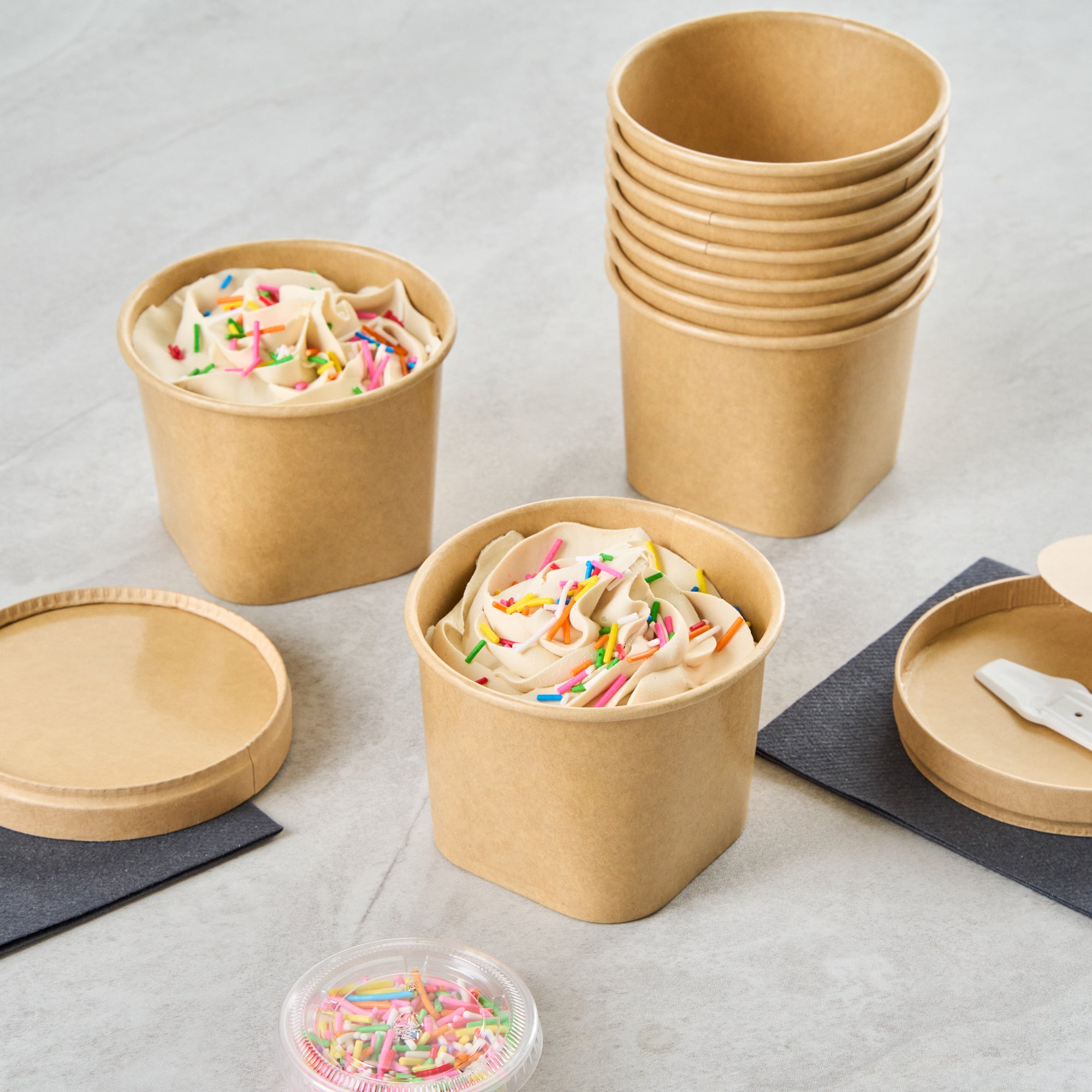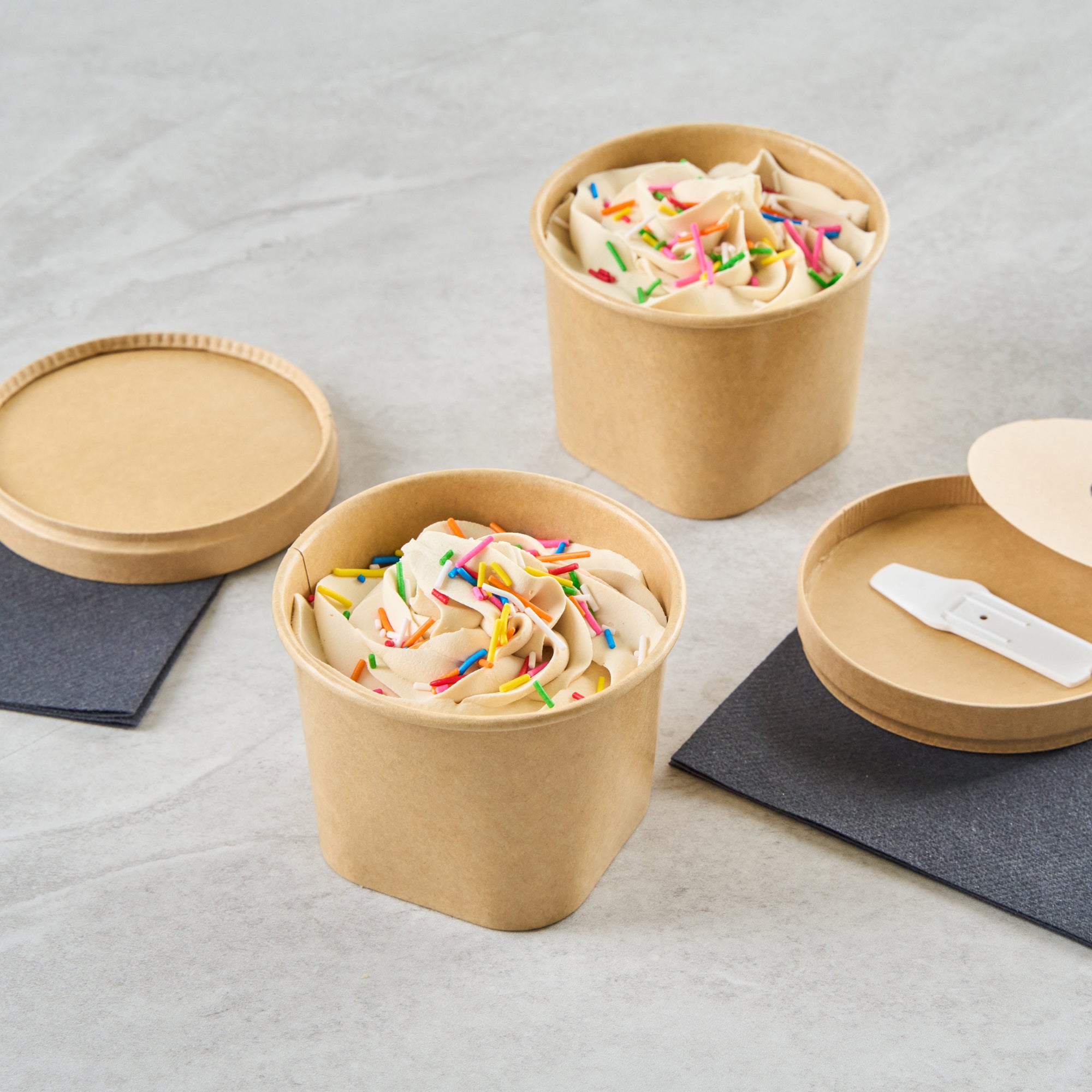 Enhance your foodservice with our Coppetta 12-ounce Round Kraft Paper To Go Cups, perfect for serving a variety of dishes. These takeaway dessert cups feature a grease-resistant PE lining that keeps oil from seeping through, ensuring a neat food presentation. Crafted from durable paper, these cups are suitable for serving both hot and cold foods with ease. The square bottom enhances stability, ensuring the cup stays securely in place during use. The recyclable convenience of these kraft paper cups provides an eco-friendly container for your establishment. Designed with a rolled rim, these to go cups securely hold coordinating lids (SKU: RWA1753BR) to keep your food safe on-the-go. The natural kraft finish of these round ice cream cups adds a rustic charm, ideal for serving soups, frozen yogurts, or fresh fruit salads. These disposable cups are freezer-safe, allowing you to refrigerate leftovers without worry. With a 12-ounce capacity, these kraft paper cups measure 3.82 inches in diameter by 2.87 inches in height. Sold in a 50 count box.