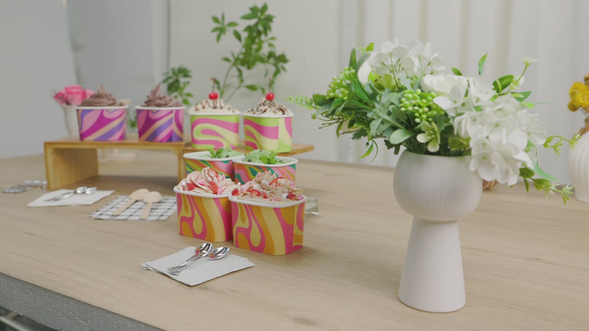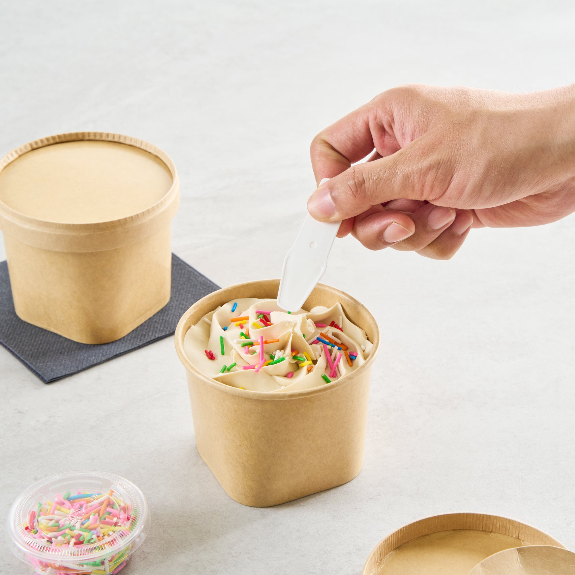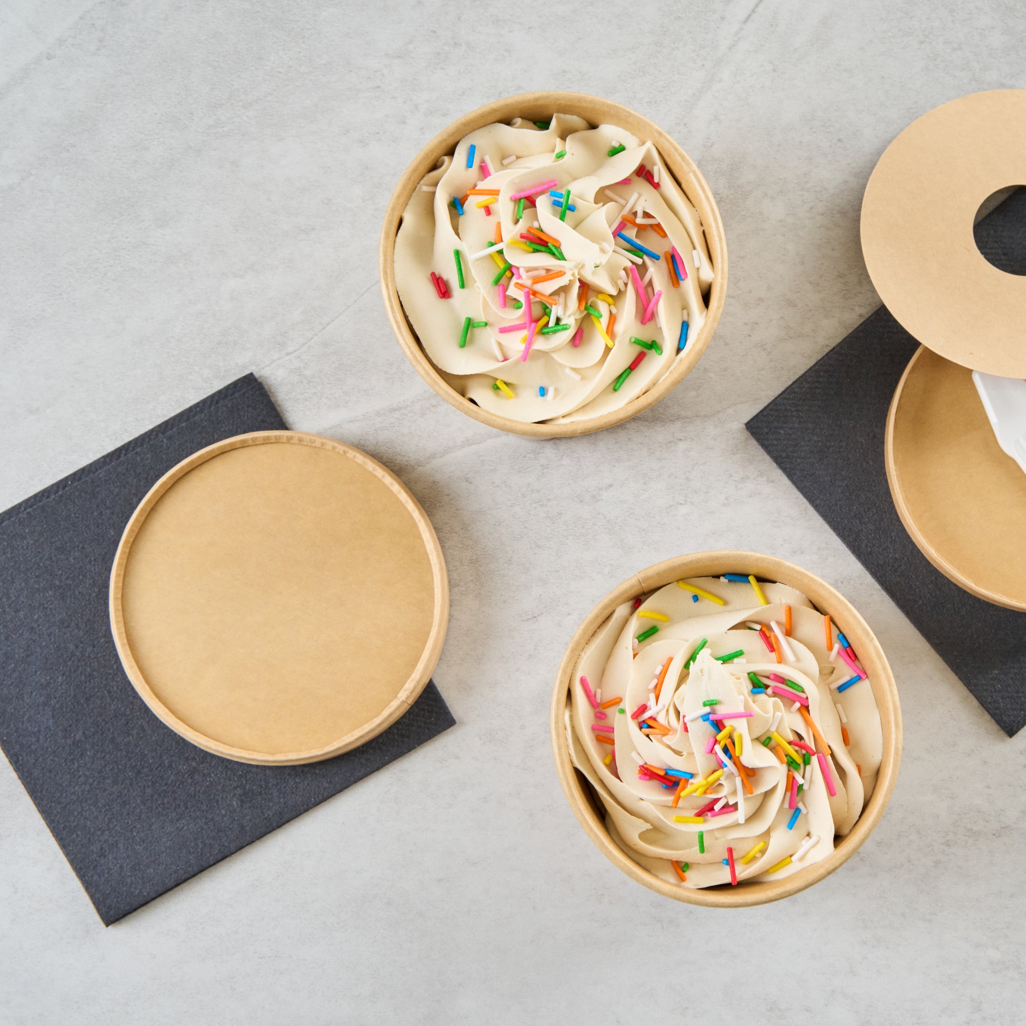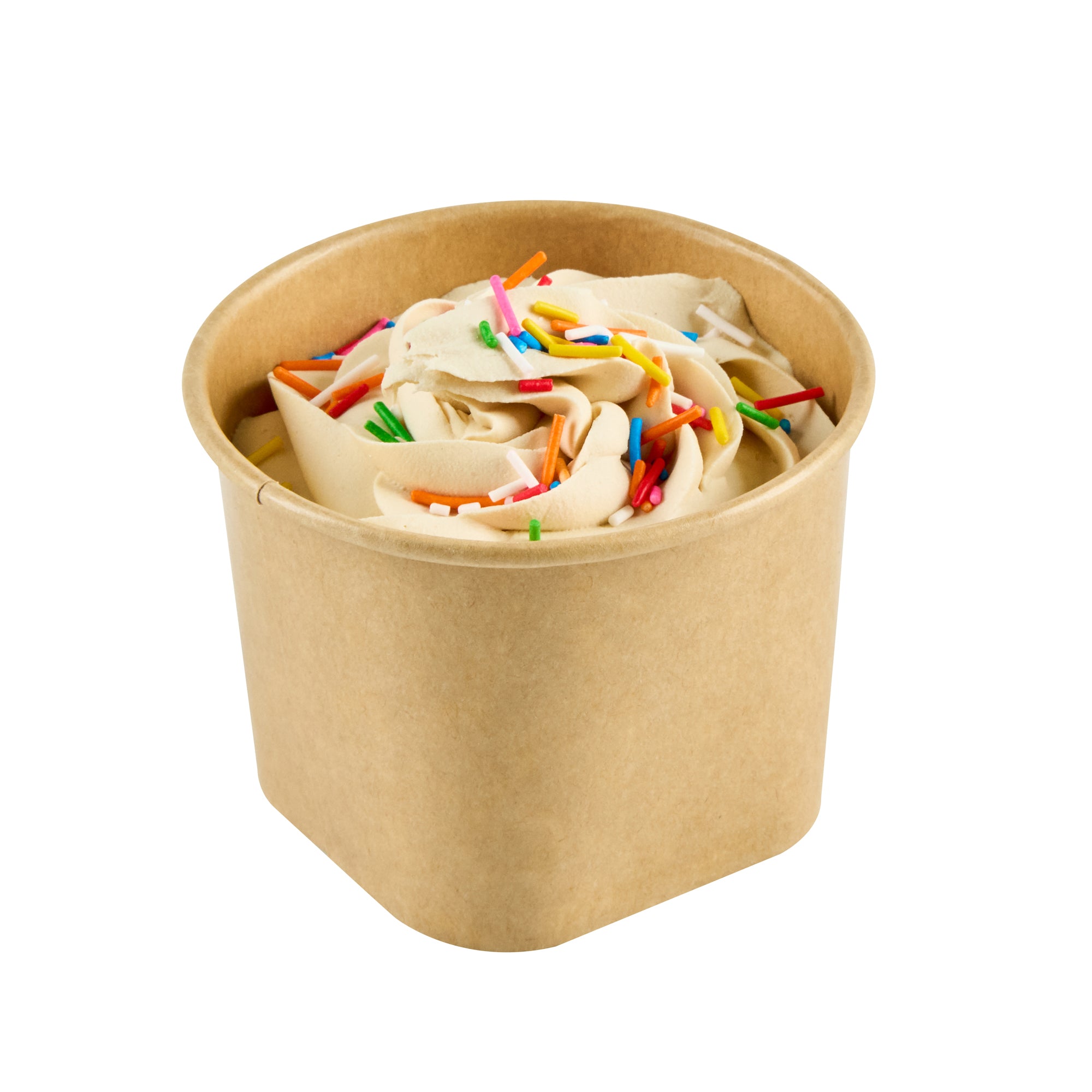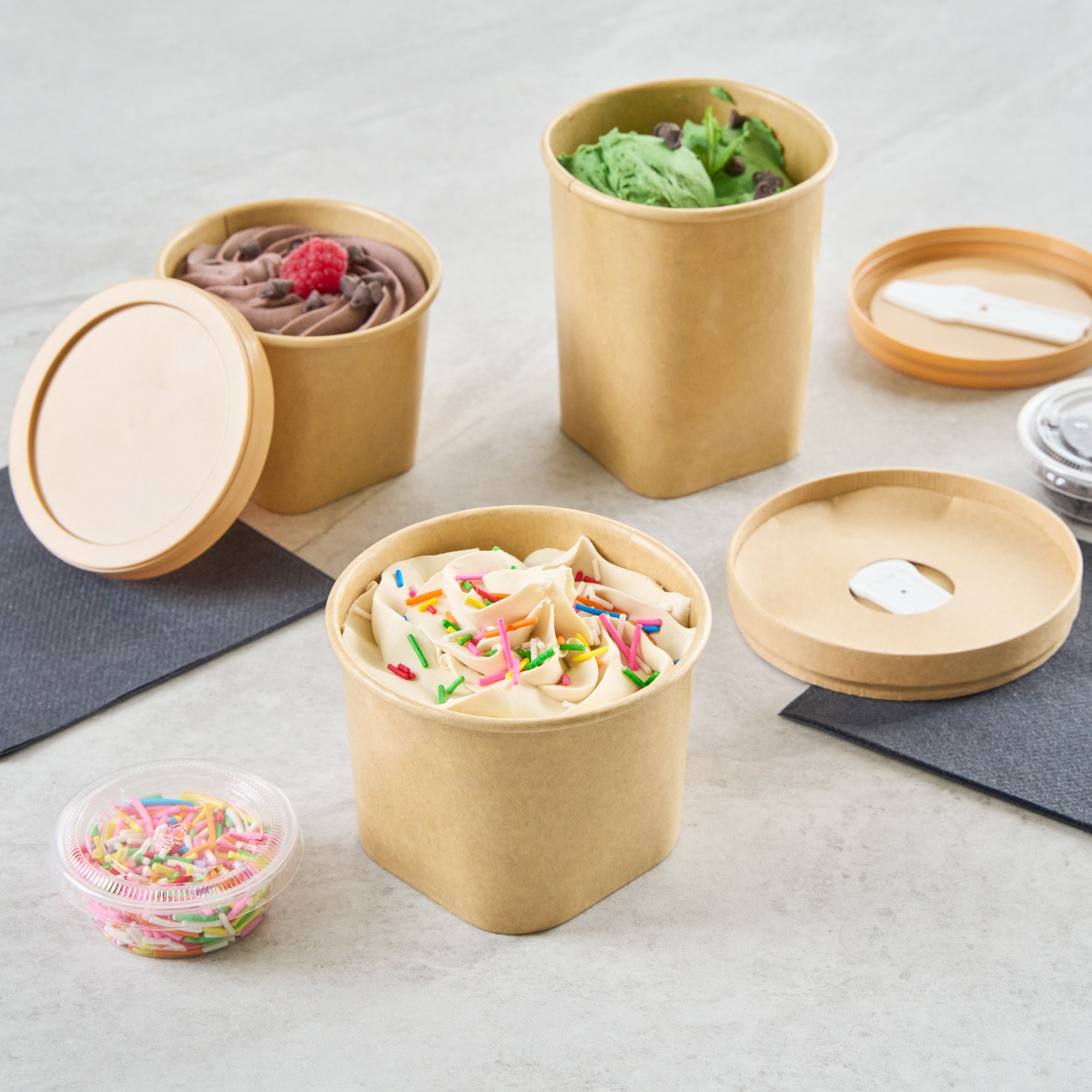 Enhance your foodservice with our Coppetta 12-ounce Round Kraft Paper To Go Cups, perfect for serving a variety of dishes. These takeaway dessert cups feature a grease-resistant PE lining that keeps oil from seeping through, ensuring a neat food presentation. Crafted from durable paper, these cups are suitable for serving both hot and cold foods with ease. The square bottom enhances stability, ensuring the cup stays securely in place during use. The recyclable convenience of these kraft paper cups provides an eco-friendly container for your establishment. Designed with a rolled rim, these to go cups securely hold coordinating lids (SKU: RWA1753BR) to keep your food safe on-the-go. The natural kraft finish of these round ice cream cups adds a rustic charm, ideal for serving soups, frozen yogurts, or fresh fruit salads. These disposable cups are freezer-safe, allowing you to refrigerate leftovers without worry. With a 12-ounce capacity, these kraft paper cups measure 3.82 inches in diameter by 2.87 inches in height. Sold in a 50 count box.