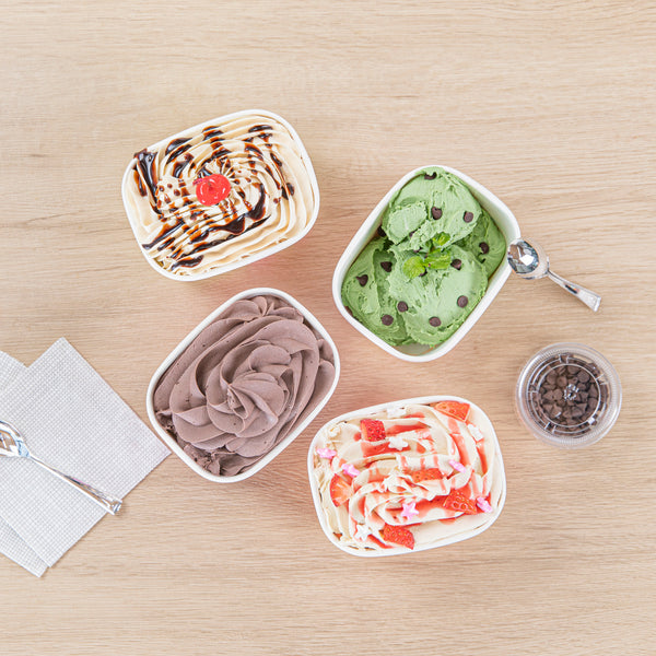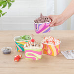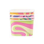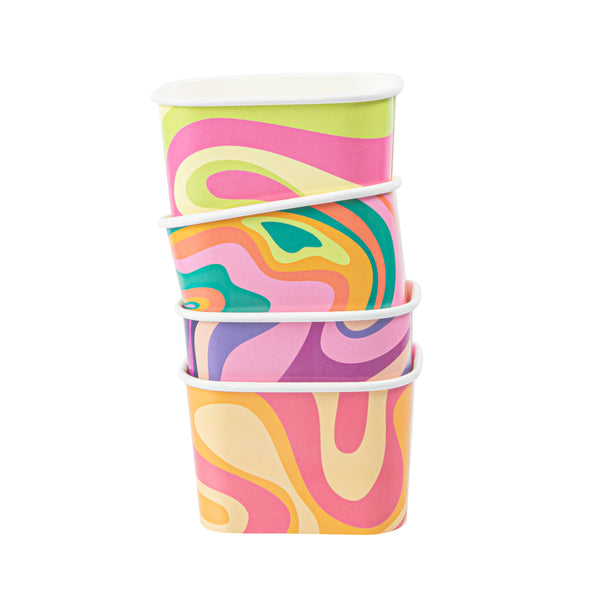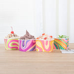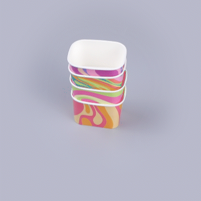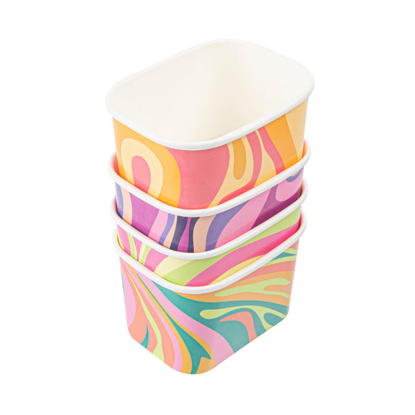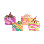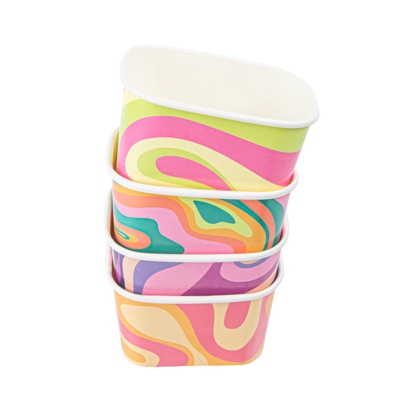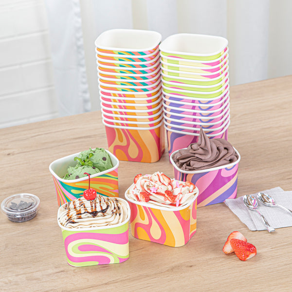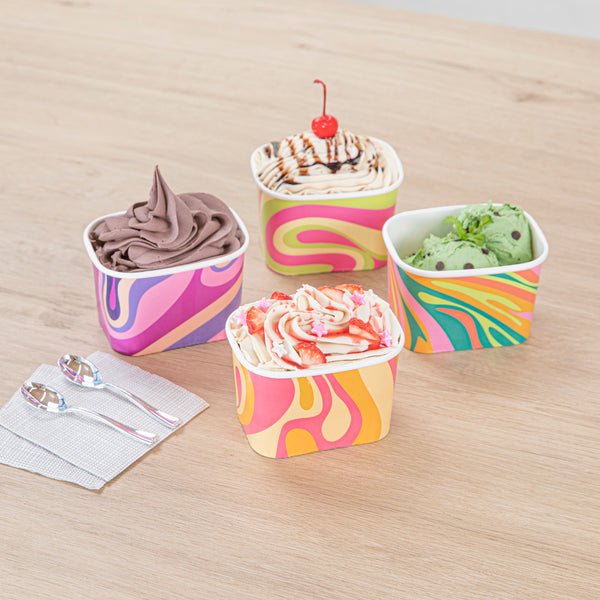Enhance dessert presentations with leak-resistant convenience. The Coppetta Leak-Resistant Disposable Paper Cup is designed with a double coated structure to prevent liquid leakage, ensuring mess-free service and optimal customer satisfaction. Its 12-ounce capacity and sturdy paper construction make it ideal for serving generous portions of ice cream, yogurt, and hot dishes, providing versatility across diverse menu items. The square design with assorted groovy patterns adds a unique and vibrant aesthetic, setting your offerings apart and appealing to customers. This disposable paper cup is grease-resistant, maintaining the presentation of oily foods while also supporting eco-friendly initiatives by being recyclable. Measuring 4.25 inches in length, this ice cream to go cup is perfect for ice cream parlors, frozen yogurt shops, cafés, and bakeries looking to streamline operations with stylish, reliable packaging. Each order includes 200 Coppetta Leak-Resistant Disposable Paper Cup.