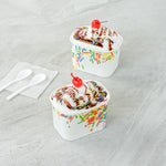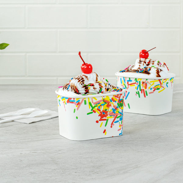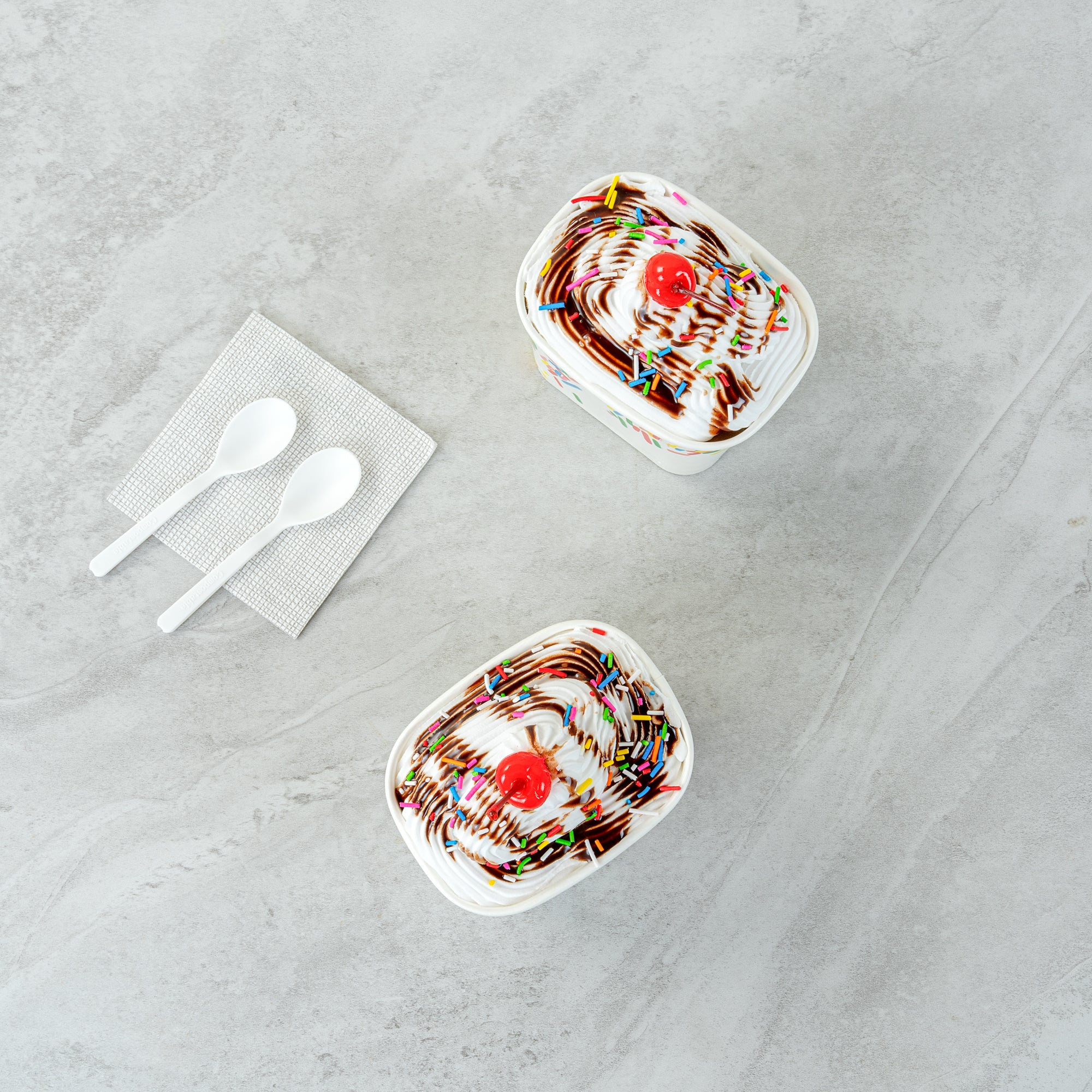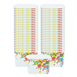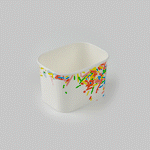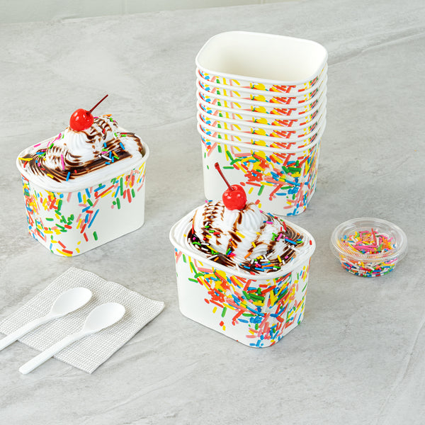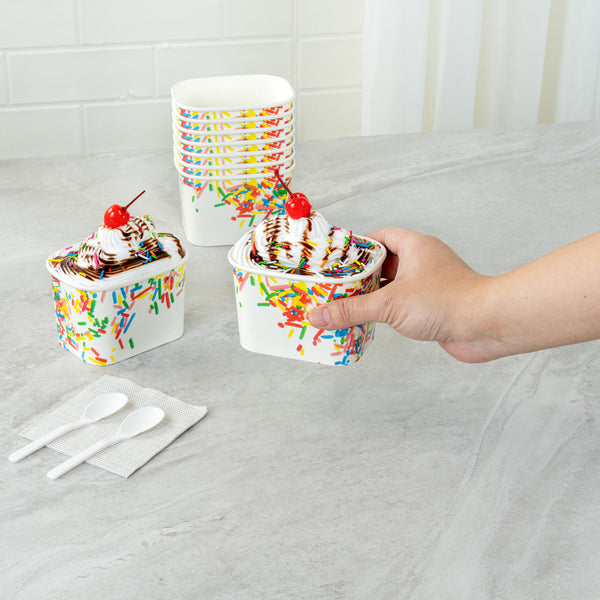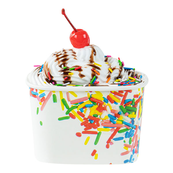 Enhance your dessert presentation with leak-resistant convenience. The Coppetta Leak-Resistant Ice Cream Cup combines a double coated design with a waterproof coating to ensure liquids stay contained, making it the perfect disposable ice cream cup for busy parlors and cafes. Its 12-ounce capacity is ideal for serving generous portions of ice cream, frozen yogurt, or hot foods like soups and pasta, showcasing its versatility as a hot food friendly container. The classic sprinkles pattern adds a playful touch to any frozen yogurt cup, appealing to customers and elevating your dessert offerings. With the freezer-safe feature, you can confidently store ice cream and frozen desserts without compromising quality. Made from durable paper, this square dessert cup measures 4.21 inches in length and maintains its shape. Each order includes 200 Coppetta Leak-Resistant Ice Cream Cup.
