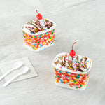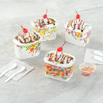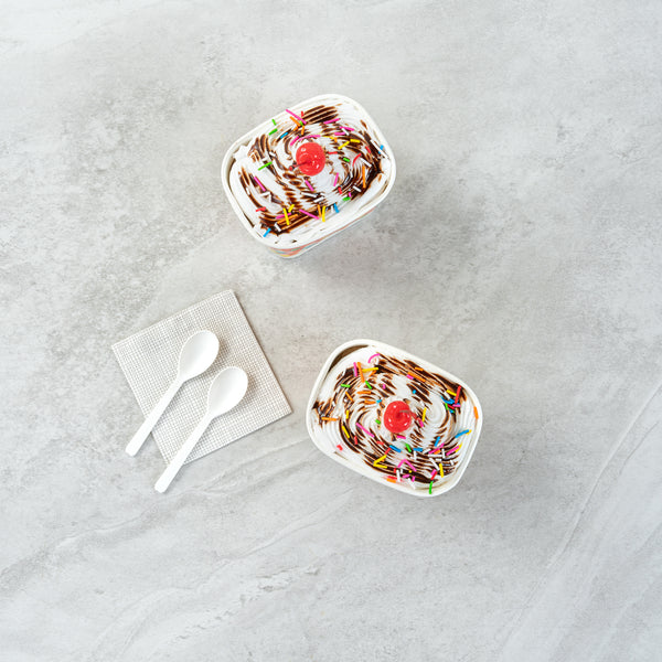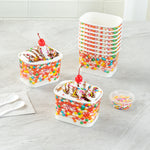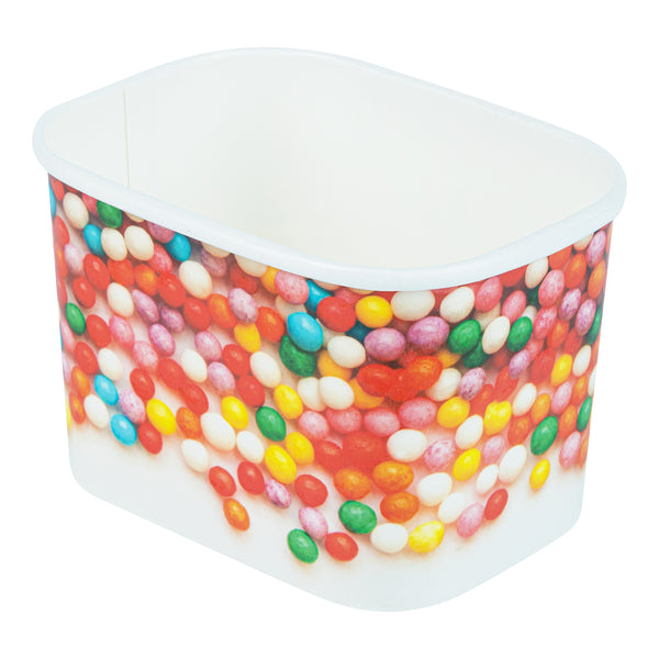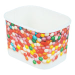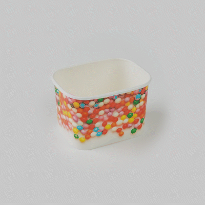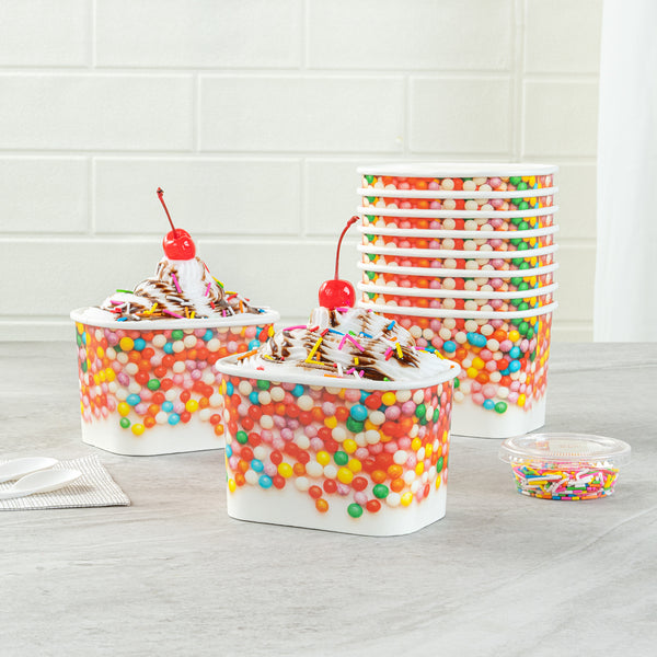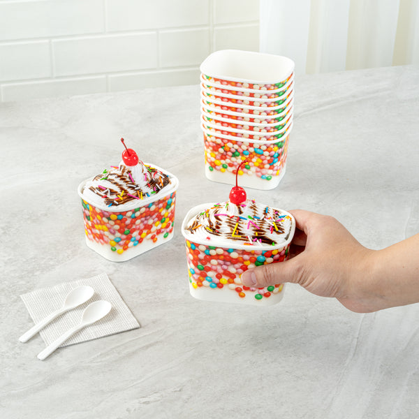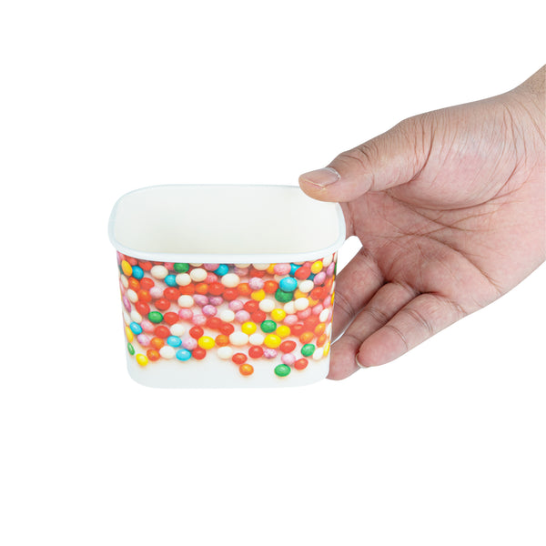 Ensure versatile service with our Coppetta Leakproof 12 oz Paper To Go Cup. This disposable ice cream cup features a 12-ounce capacity and durable paper construction, making it ideal for serving generous portions of ice cream, frozen yogurt, or other cold desserts. The sturdy double coating prevents liquid leakage, providing a reliable serving experience for both hot and cold menu items. Its grease-resistant design maintains the pristine presentation of snacks and cakes, while the square shape with a playful round sprinkles pattern enhances the visual appeal of your offerings. Measuring 4.2 inches in length, 3.2 inches in width, and 2.7 inches in height, these hot and cold paper cups provide ample space for a variety of delicious treats. Plus, they are recyclable, supporting eco-friendly practices in your foodservice operation. Elevate your dessert presentation with this versatile 12 oz paper to go cup. Each order includes 200 Coppetta Leakproof 12 oz Paper To Go Cup.