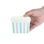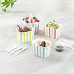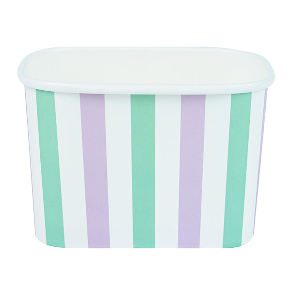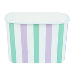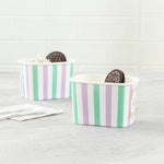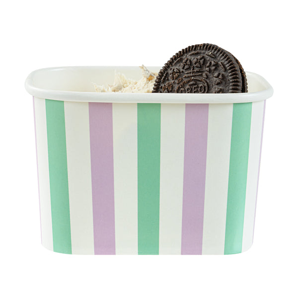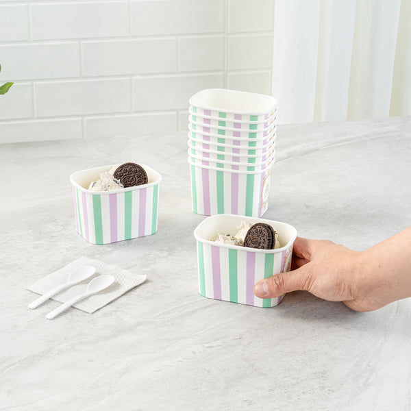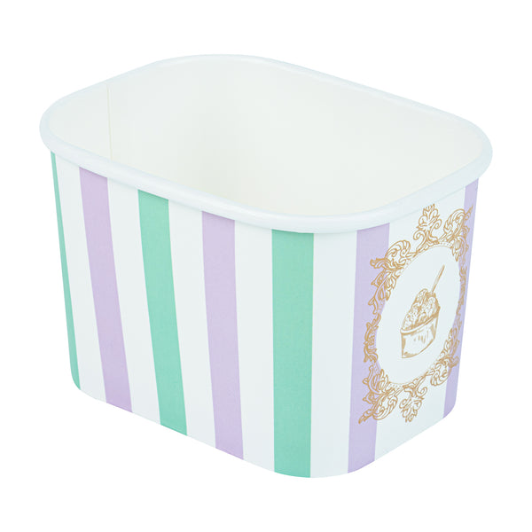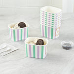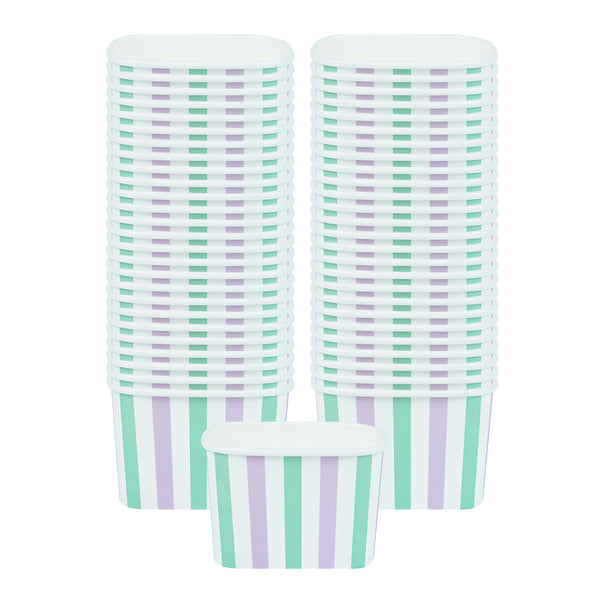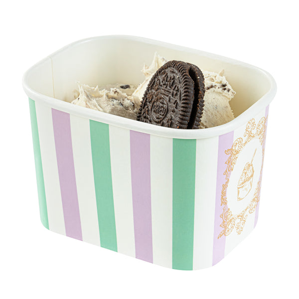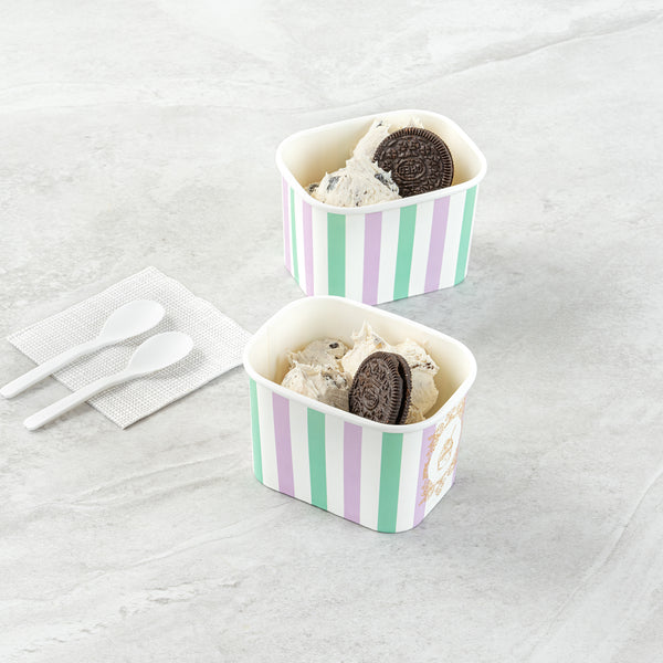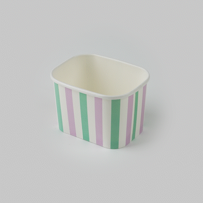 Elevate your food presentation with our Coppetta 12-ounce Square Purple And Blue Stripe Paper To Go Cups, a stylish solution for serving frozen treats. Designed with a grease-resistant PE lining, these takeaway dessert cups prevent oil from seeping through, ensuring a neat and appealing presentation. The durable paper construction of these square ice cream cups is perfect for both hot and cold foods, providing versatility for any menu item. Featuring recyclable convenience, these frozen yogurt paper cups offer an eco-friendly option for foodservice establishments aiming to reduce waste. With a securely rolled rim, these to go cups pair effortlessly with coordinating lids (SKU: RWA1736W) for easy transportation. The eye-catching purple and blue stripe pattern adds an upscale touch to these disposable cups, enhancing your culinary creations. These freezer-safe cups are ideal for storing leftovers, maintaining freshness and flavor. Measuring 4.21 inches in length by 3.23 inches in width by 2.68 inches in height, this 12-ounce capacity allows for generous servings of your favorite desserts. Sold in a 200 count box.