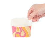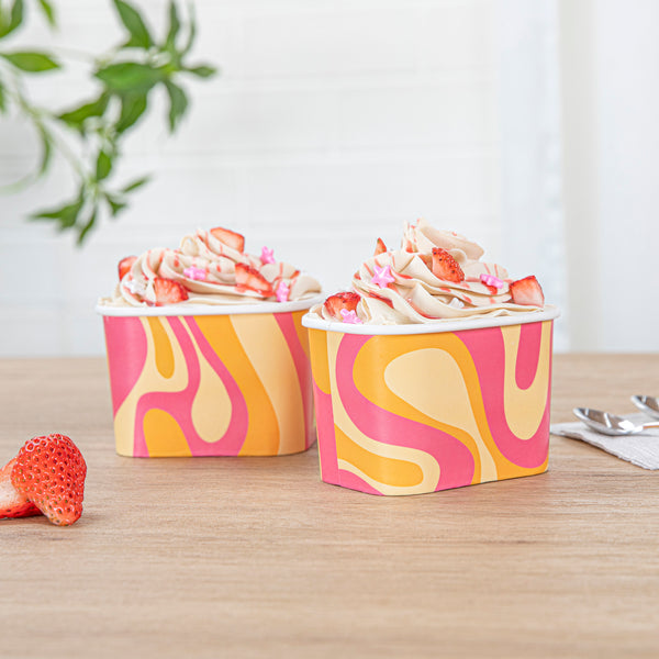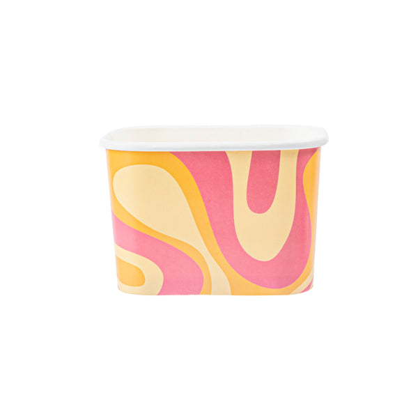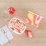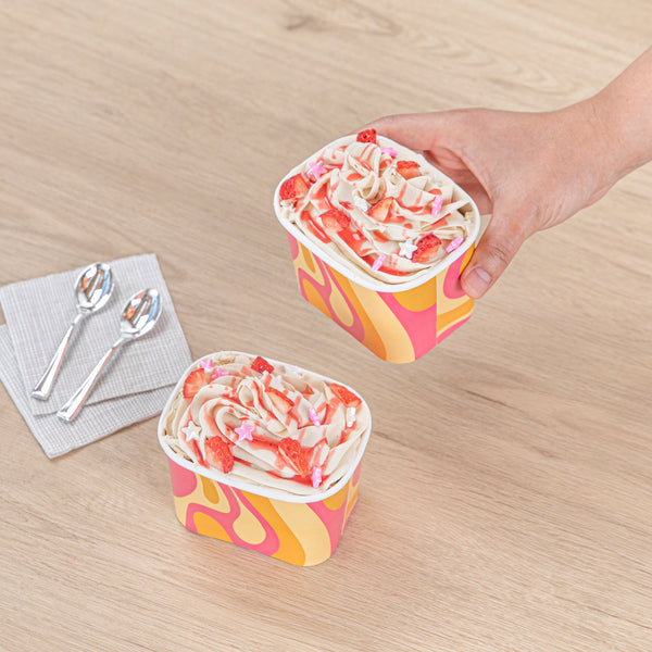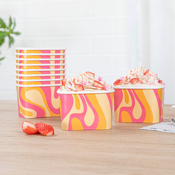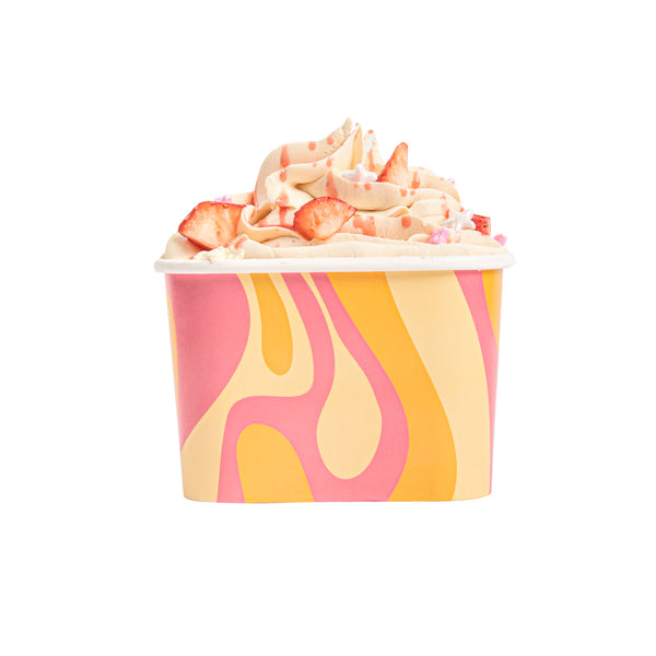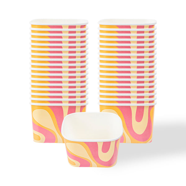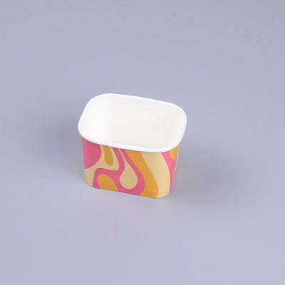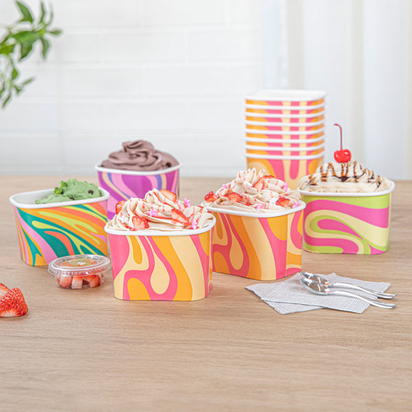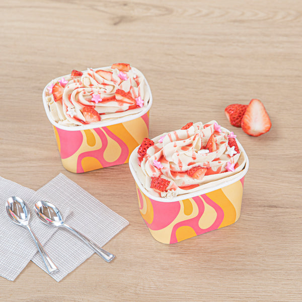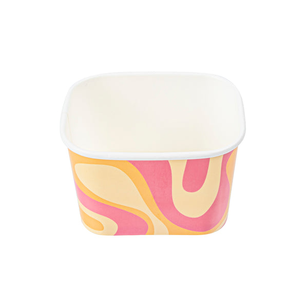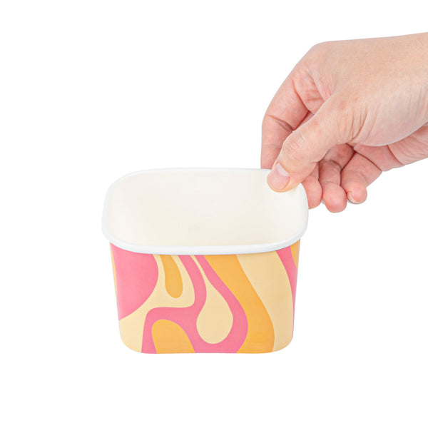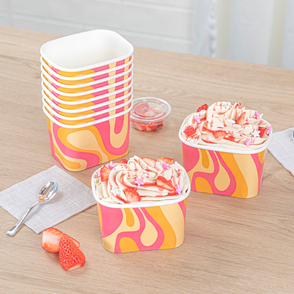 Ensure your desserts stay secure with leak-resistant packaging. The Coppetta Leak-Resistant Paper To Go Cup offers a 12-ounce capacity, ideal for generous servings of ice cream or frozen yogurt. Its double-coated design ensures a leak-free experience, making it a reliable choice for cafes and dessert shops looking for a sturdy disposable ice cream cup that maintains presentation and quality. Designed to be freezer-safe, this cup helps maintain dessert freshness, while its hot food-friendly feature allows for versatile use with soups or pastas. The square shape, adorned with a vibrant tropical twist pattern, enhances presentation, offering a visually appealing addition to any dessert lineup. Measuring 4.25 inches by 3.25 inches by 2.75 inches, these paper cups are compact for easy storage and handling. Simplify your cleanup process with this recyclable and disposable solution, perfect for foodservice operations. Each order includes 200 Coppetta Leak-Resistant Paper To Go Cups.