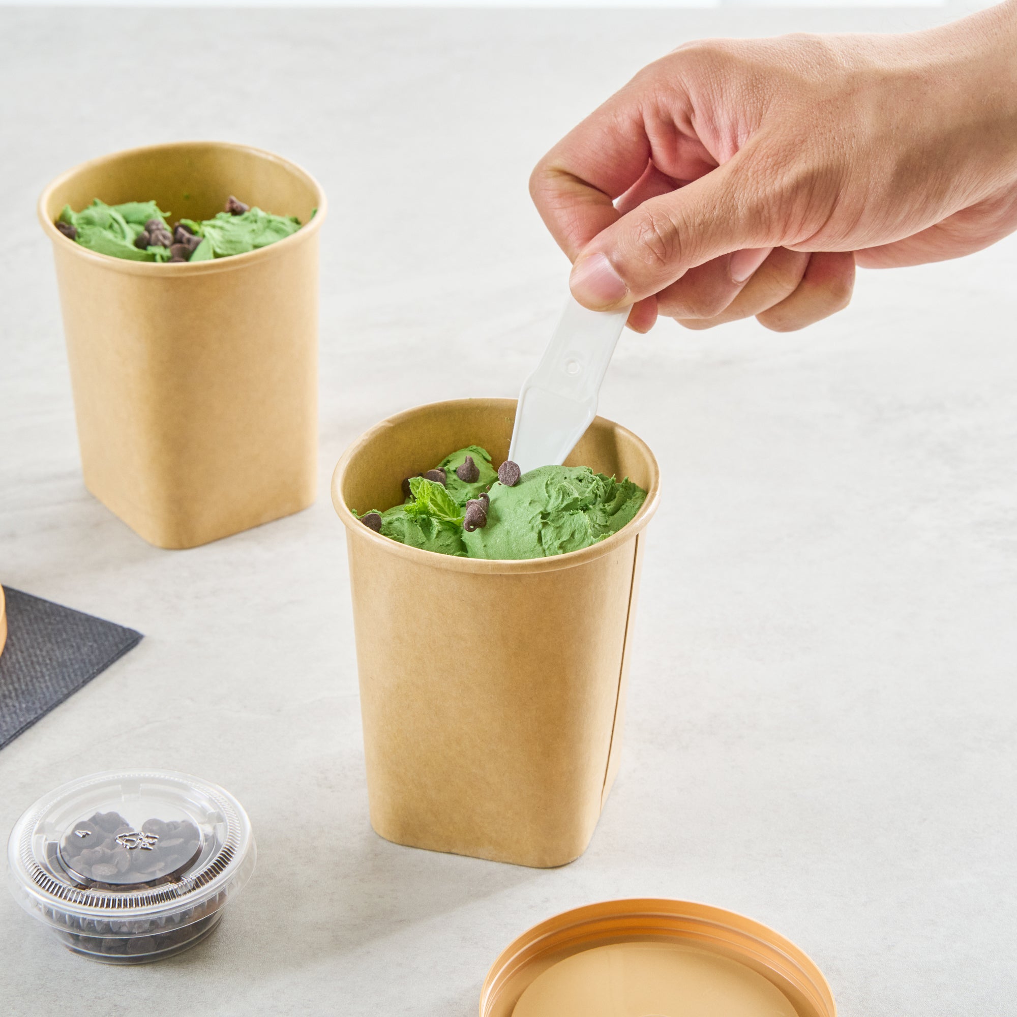 Add a touch of sophistication to your desserts with our Coppetta 13-ounce Round Kraft Paper To Go Cups. These round ice cream cups feature a grease-resistant PE lining that keeps oil from seeping through, ensuring a neat and appealing display of your culinary creations. Crafted from durable paper, these takeaway dessert cups are perfect for serving both hot and cold foods, providing versatility in your menu offerings. The recyclable convenience of these kraft paper cups makes them an eco-friendly choice for any establishment looking to minimize environmental impact. The square bottom enhances stability, ensuring the cup stays securely in place during use. With a rolled rim, these to go cups securely hold coordinating lids (SKU: RWA1752BR), making them ideal for transporting food on the go. The natural kraft finish adds a rustic charm to these disposable cups, making them perfect for serving soups, frozen yogurts, or fresh fruit salads with style. These round ice cream cups are freezer-safe, allowing you to easily refrigerate leftovers while ensuring food remains fresh. With a capacity of 13 ounces and measuring 3.39 inches in diameter by 3.94 inches in height, these cups are both practical and stylish. Sold in a 200 count box.