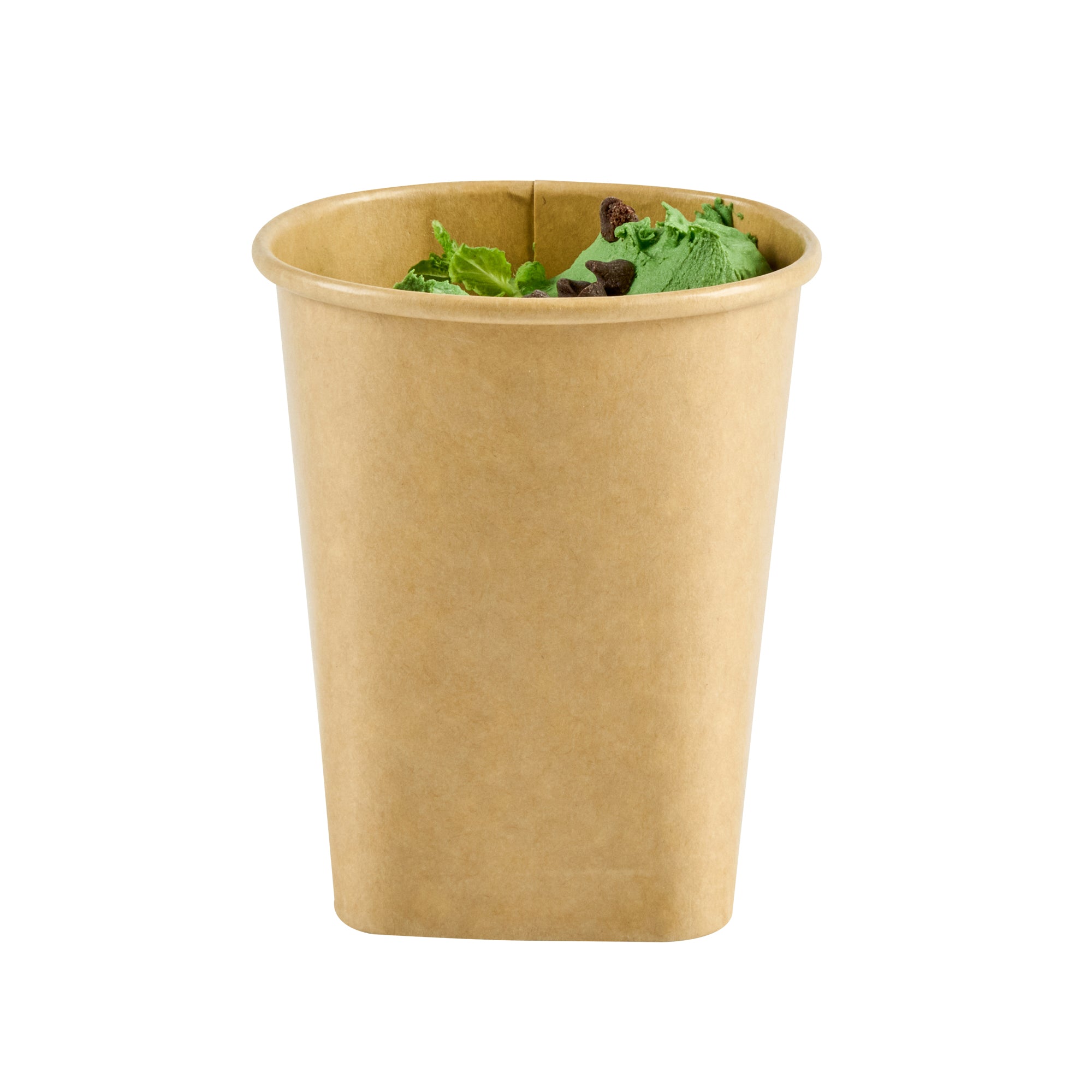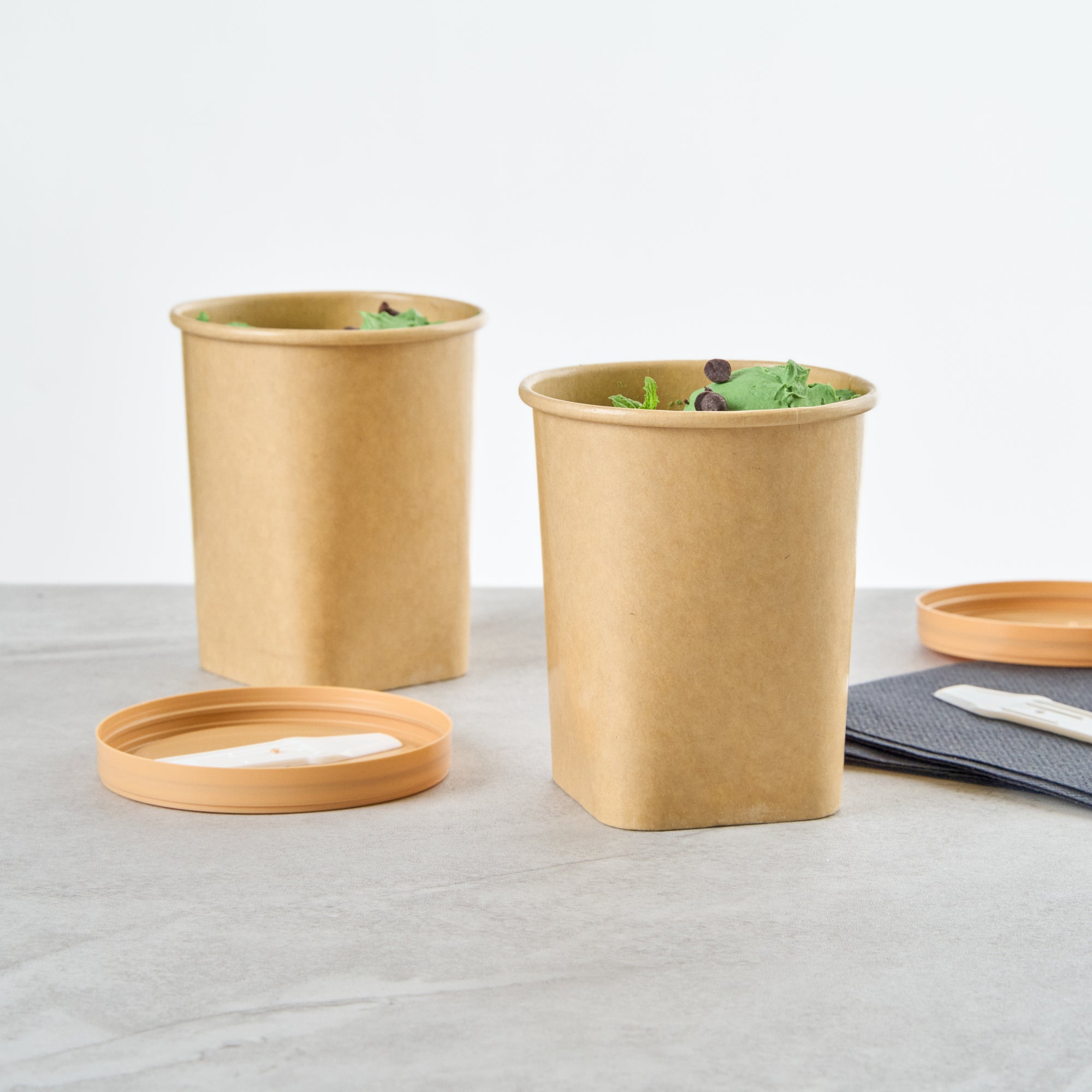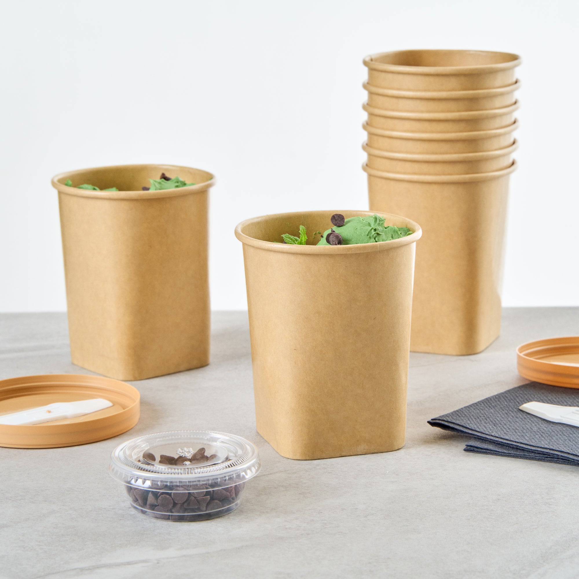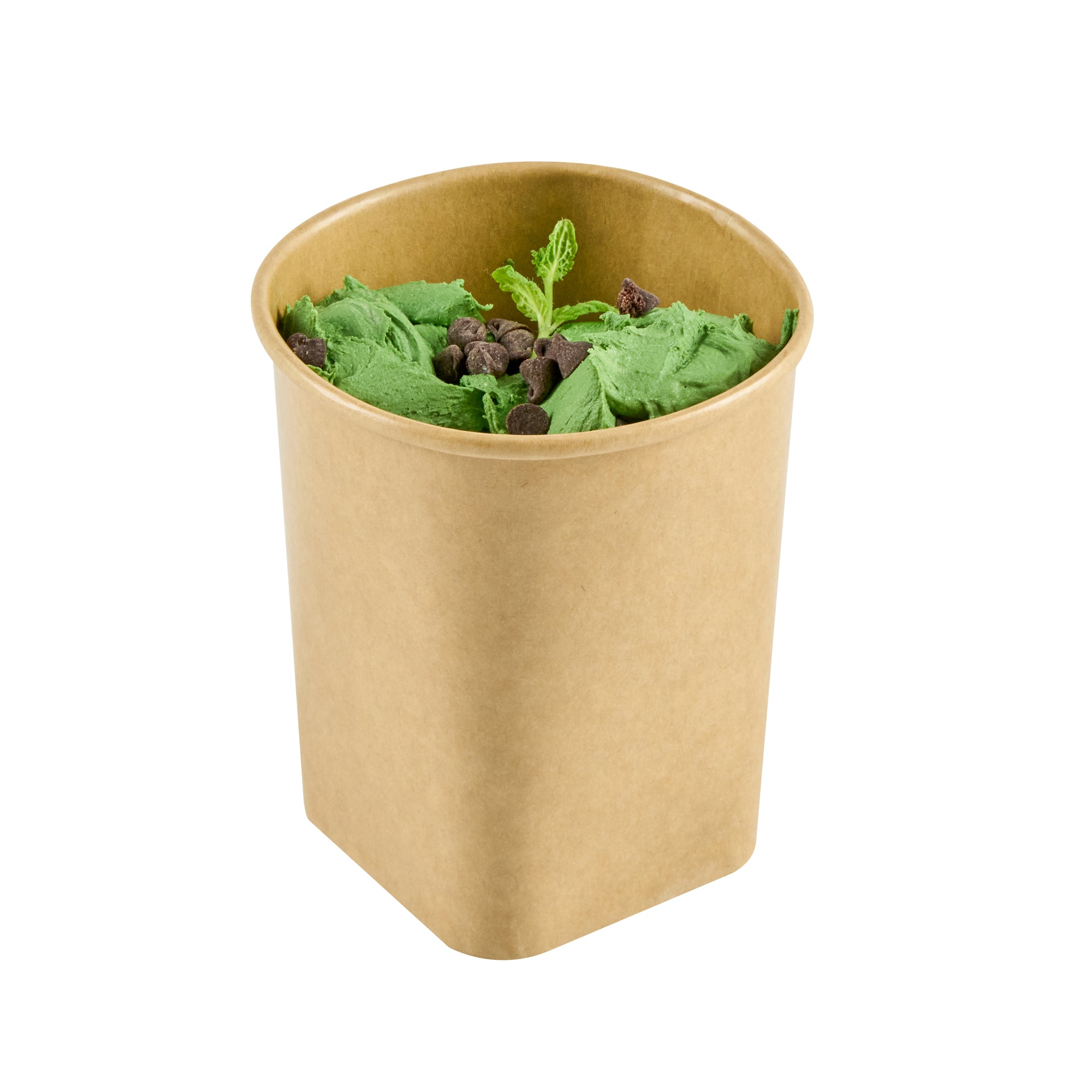 Add a touch of sophistication to your desserts with our Coppetta 13-ounce Round Kraft Paper To Go Cups. These round ice cream cups feature a grease-resistant PE lining that keeps oil from seeping through, ensuring a neat and appealing display of your culinary creations. Crafted from durable paper, these takeaway dessert cups are perfect for serving both hot and cold foods, providing versatility in your menu offerings. The recyclable convenience of these kraft paper cups makes them an eco-friendly choice for any establishment looking to minimize environmental impact. The square bottom enhances stability, ensuring the cup stays securely in place during use. With a rolled rim, these to go cups securely hold coordinating lids (SKU: RWA1752BR), making them ideal for transporting food on the go. The natural kraft finish adds a rustic charm to these disposable cups, making them perfect for serving soups, frozen yogurts, or fresh fruit salads with style. These round ice cream cups are freezer-safe, allowing you to easily refrigerate leftovers while ensuring food remains fresh. With a capacity of 13 ounces and measuring 3.39 inches in diameter by 3.94 inches in height, these cups are both practical and stylish. Sold in a 50 count box.