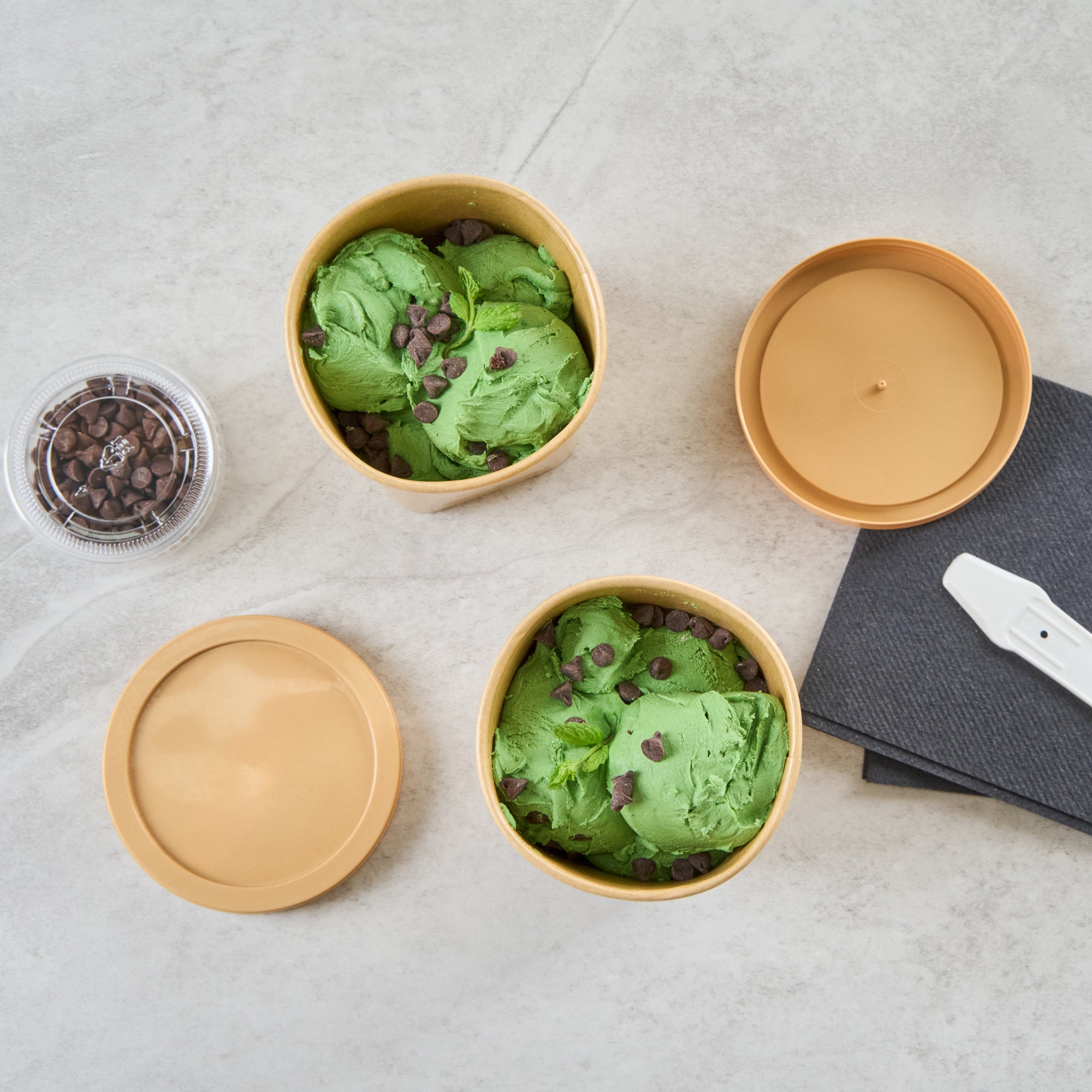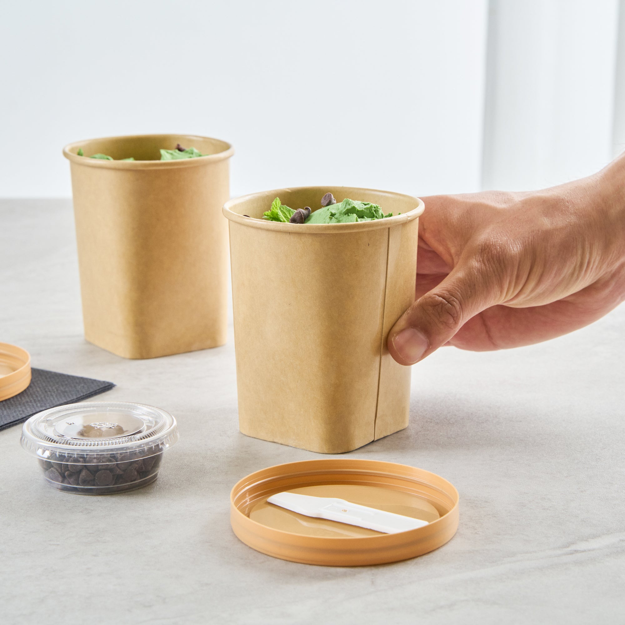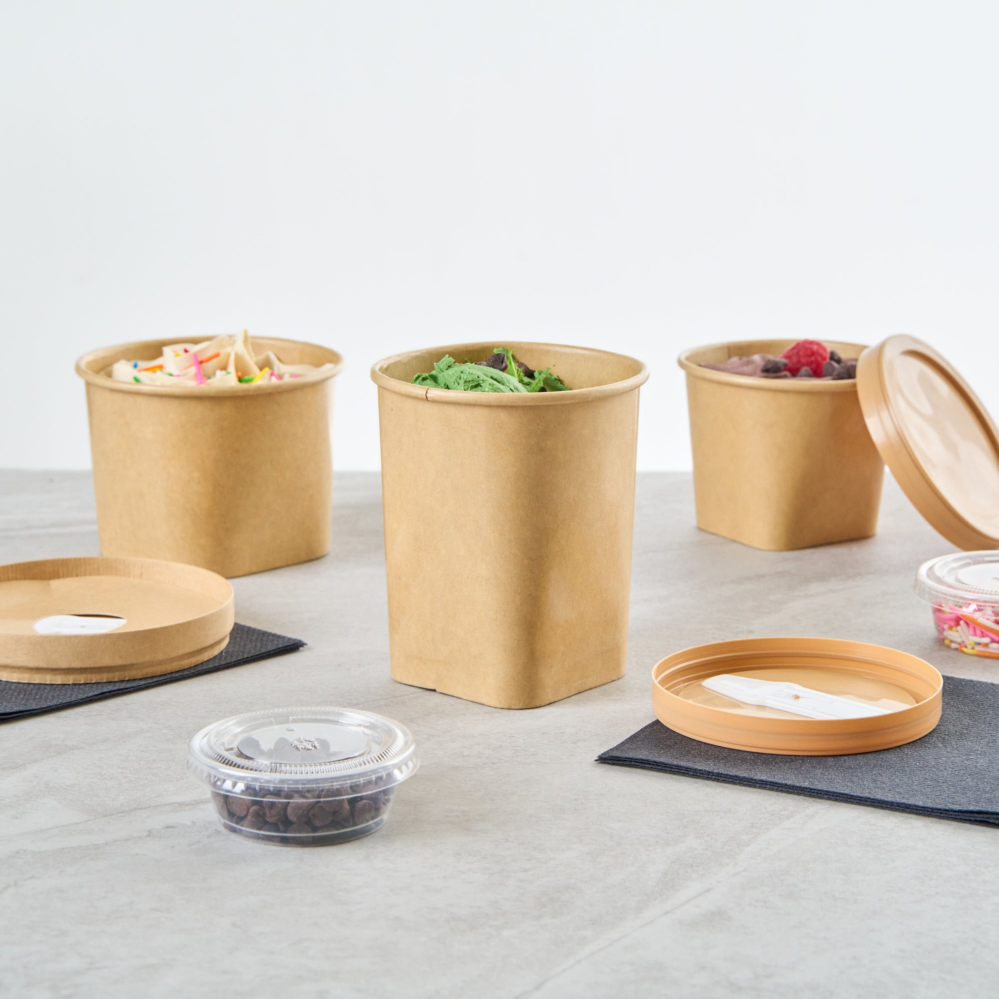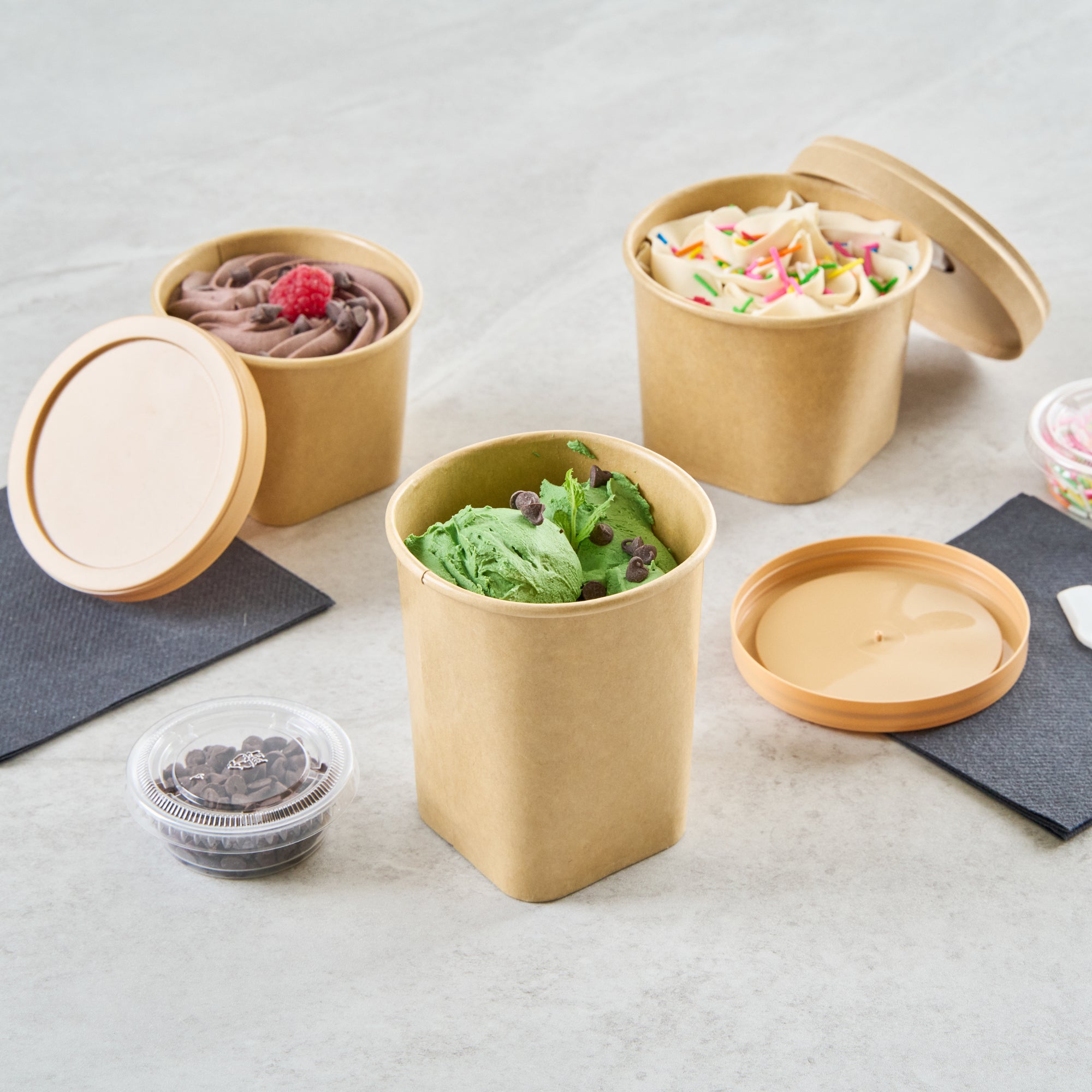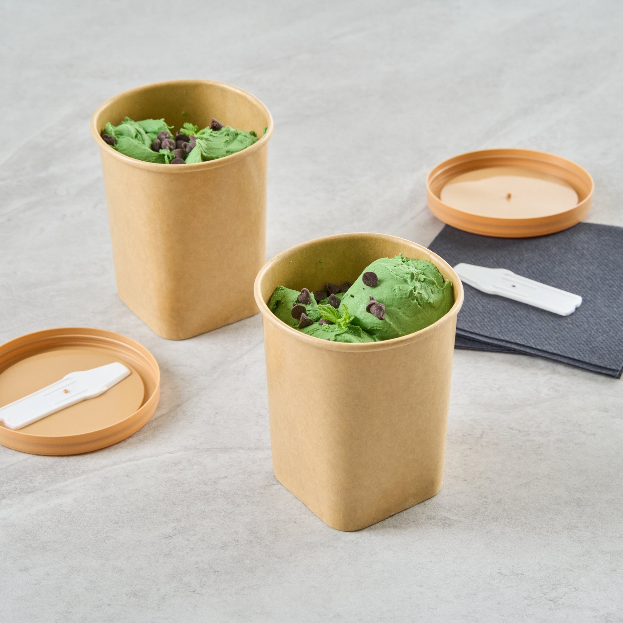 Add a touch of sophistication to your desserts with our Coppetta 13-ounce Round Kraft Paper To Go Cups. These round ice cream cups feature a grease-resistant PE lining that keeps oil from seeping through, ensuring a neat and appealing display of your culinary creations. Crafted from durable paper, these takeaway dessert cups are perfect for serving both hot and cold foods, providing versatility in your menu offerings. The recyclable convenience of these kraft paper cups makes them an eco-friendly choice for any establishment looking to minimize environmental impact. The square bottom enhances stability, ensuring the cup stays securely in place during use. With a rolled rim, these to go cups securely hold coordinating lids (SKU: RWA1752BR), making them ideal for transporting food on the go. The natural kraft finish adds a rustic charm to these disposable cups, making them perfect for serving soups, frozen yogurts, or fresh fruit salads with style. These round ice cream cups are freezer-safe, allowing you to easily refrigerate leftovers while ensuring food remains fresh. With a capacity of 13 ounces and measuring 3.39 inches in diameter by 3.94 inches in height, these cups are both practical and stylish. Sold in a 50 count box.
