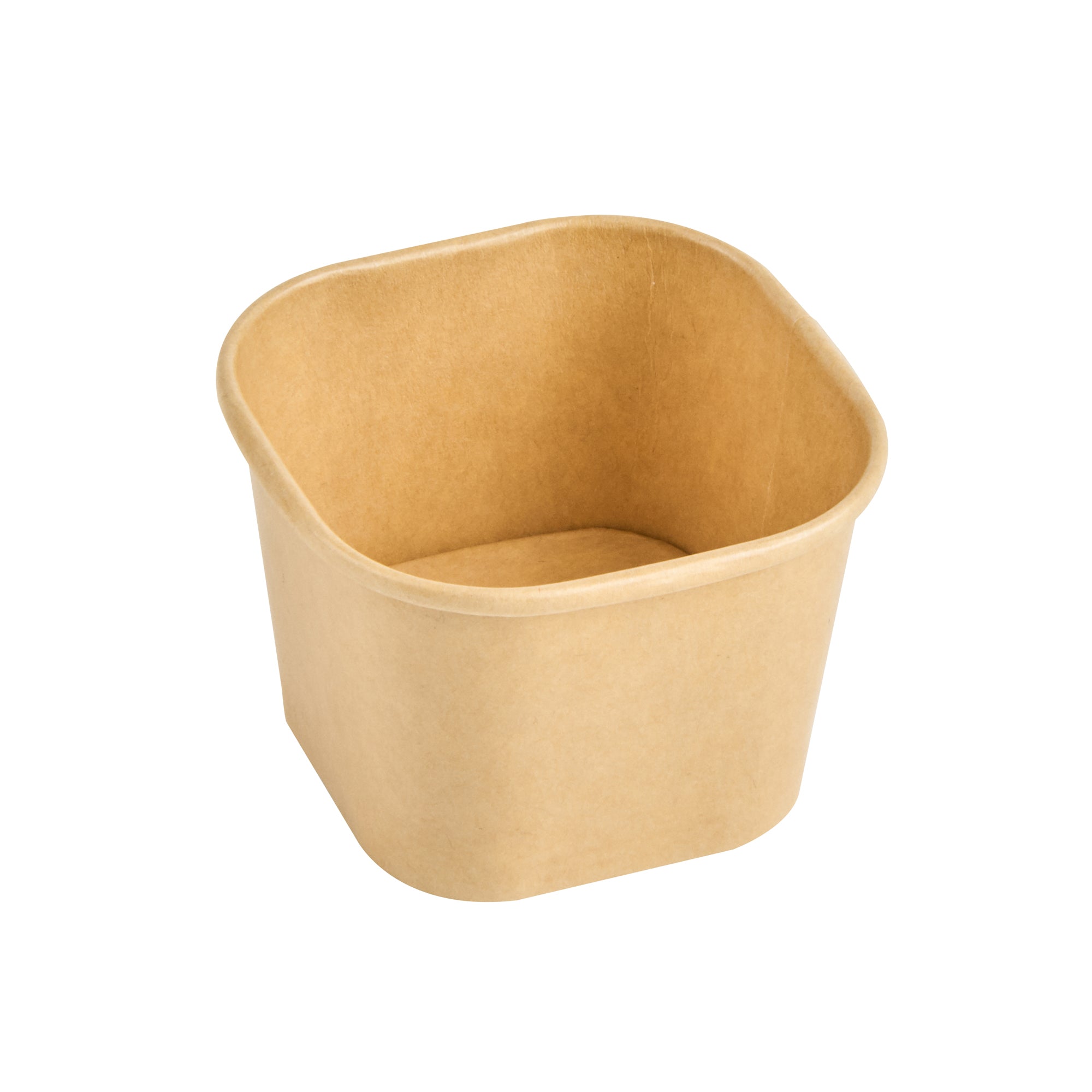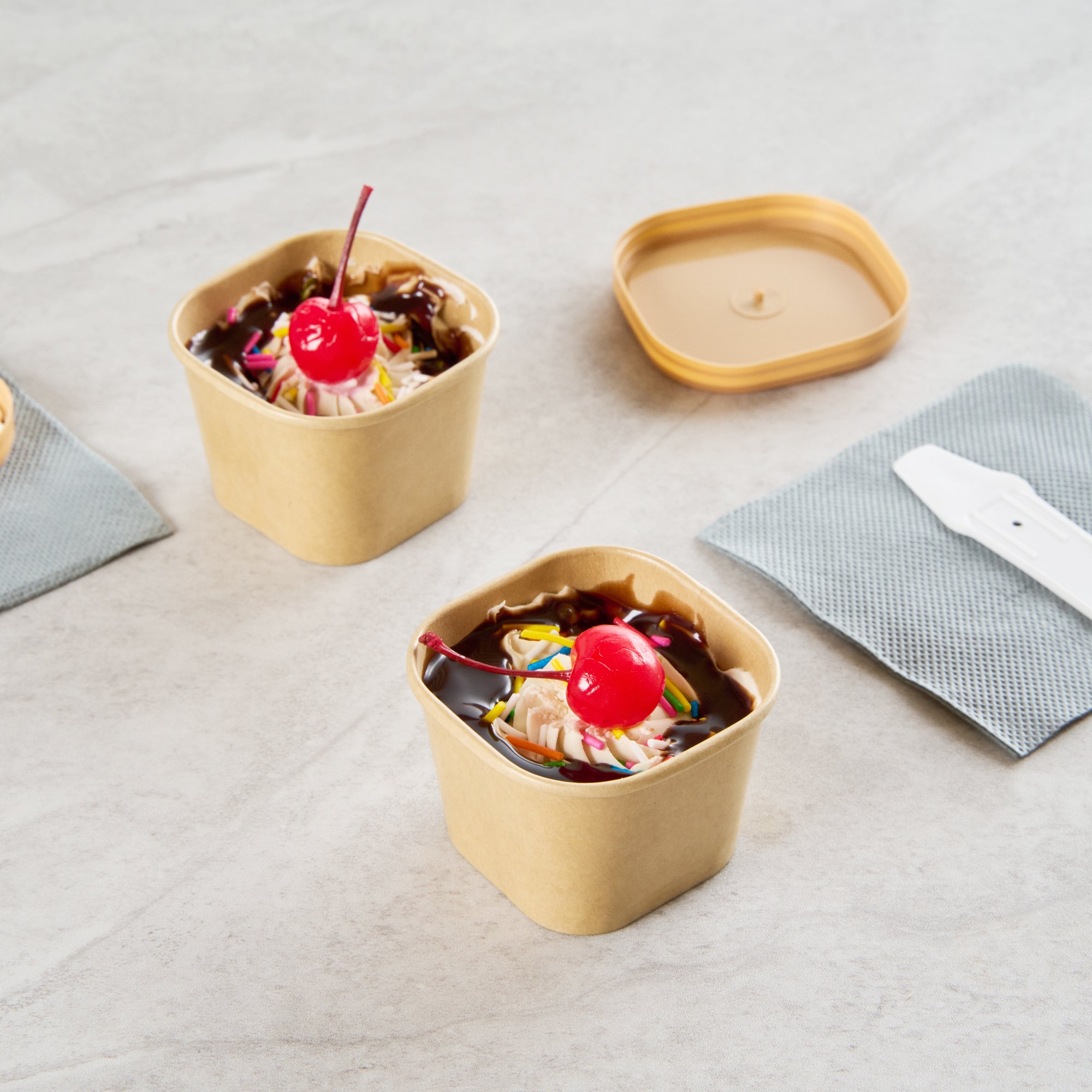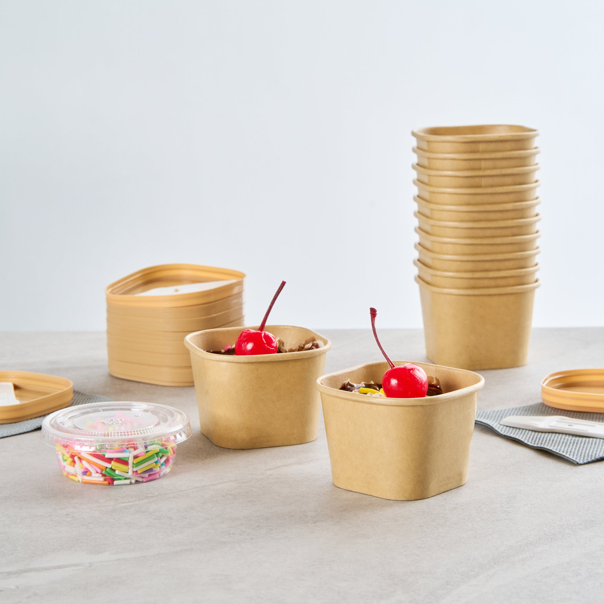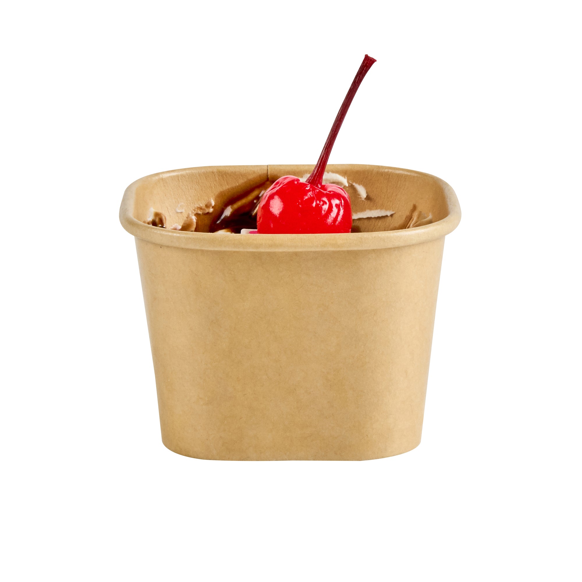 Elevate your food presentation with our Coppetta 3-ounce Square Kraft Paper To Go Cups. These takeaway dessert cups feature a grease-resistant PE lining that keeps oil from seeping through, ensuring a neat and appetizing display. Made from durable paper, these kraft paper cups are perfect for serving both hot and cold foods. The recyclable material of these disposable cups provides an eco-friendly solution for your foodservice needs. With a rolled rim, these square ice cream cups securely hold coordinating lids (SKU: RWA1740BR) for convenient on-the-go use. The natural kraft finish adds a rustic charm, making these to go cups an excellent choice for soups, frozen yogurts, or fresh fruit salads. Freezer-safe, these kraft paper cups allow you to refrigerate leftovers without compromising quality. Each cup has a capacity of 3.04 ounces and measures 2.5 inches in length and width by 1.75 inches in height. Sold in a 200 count box.