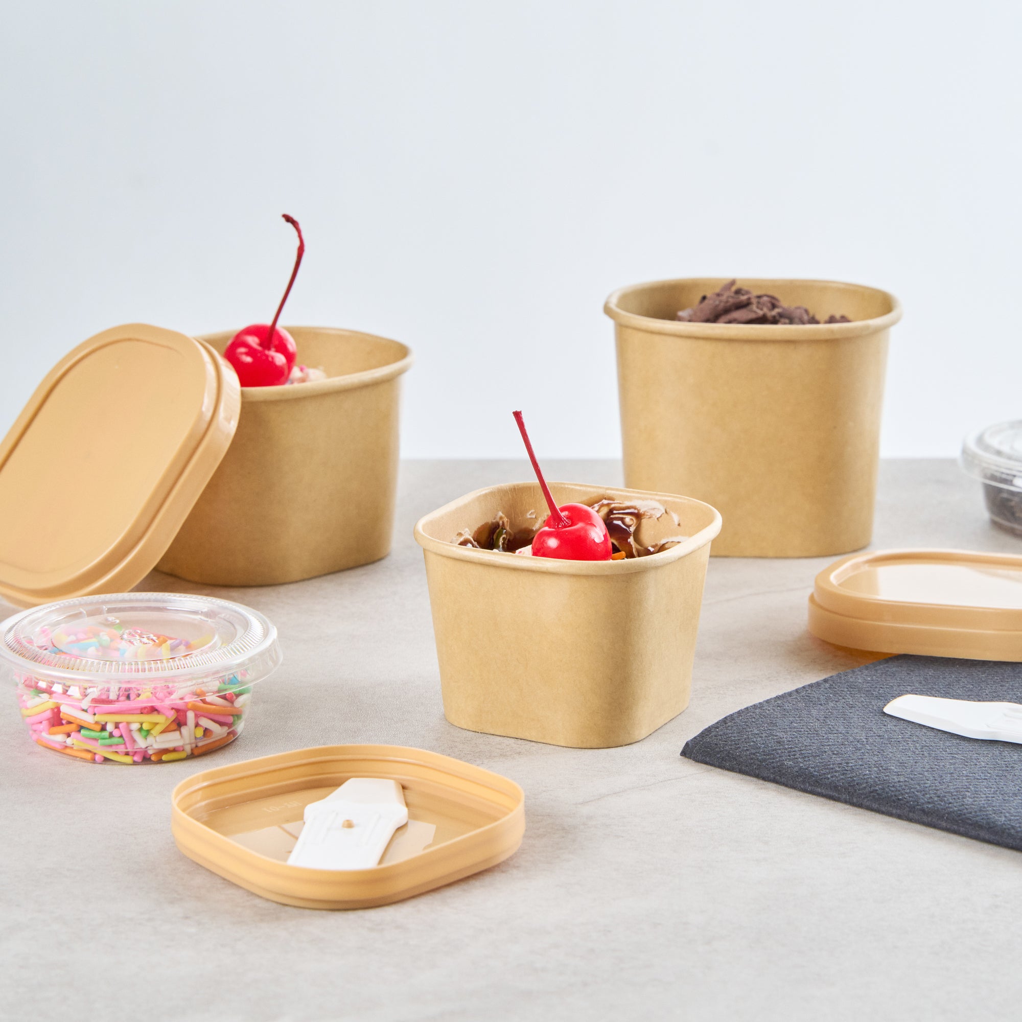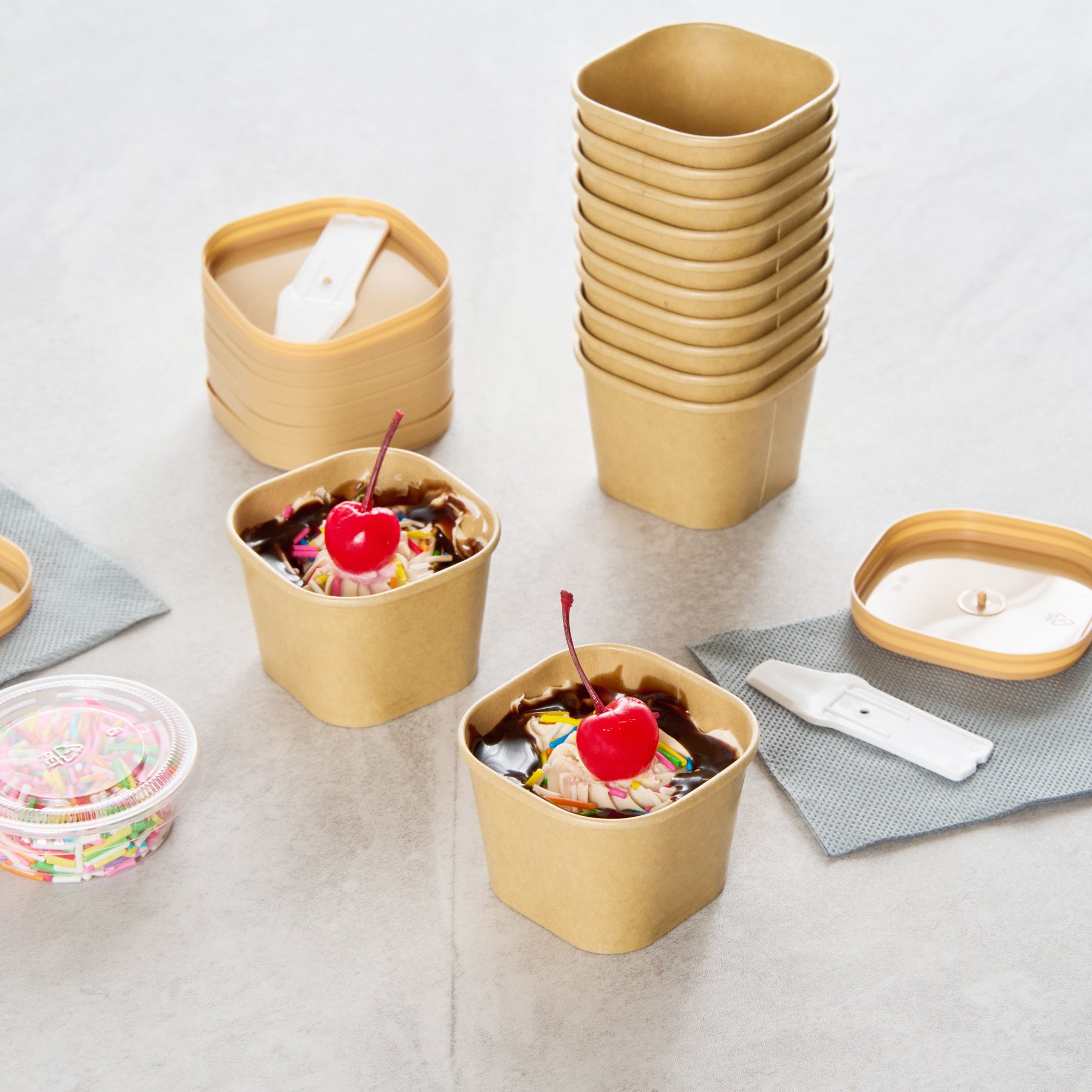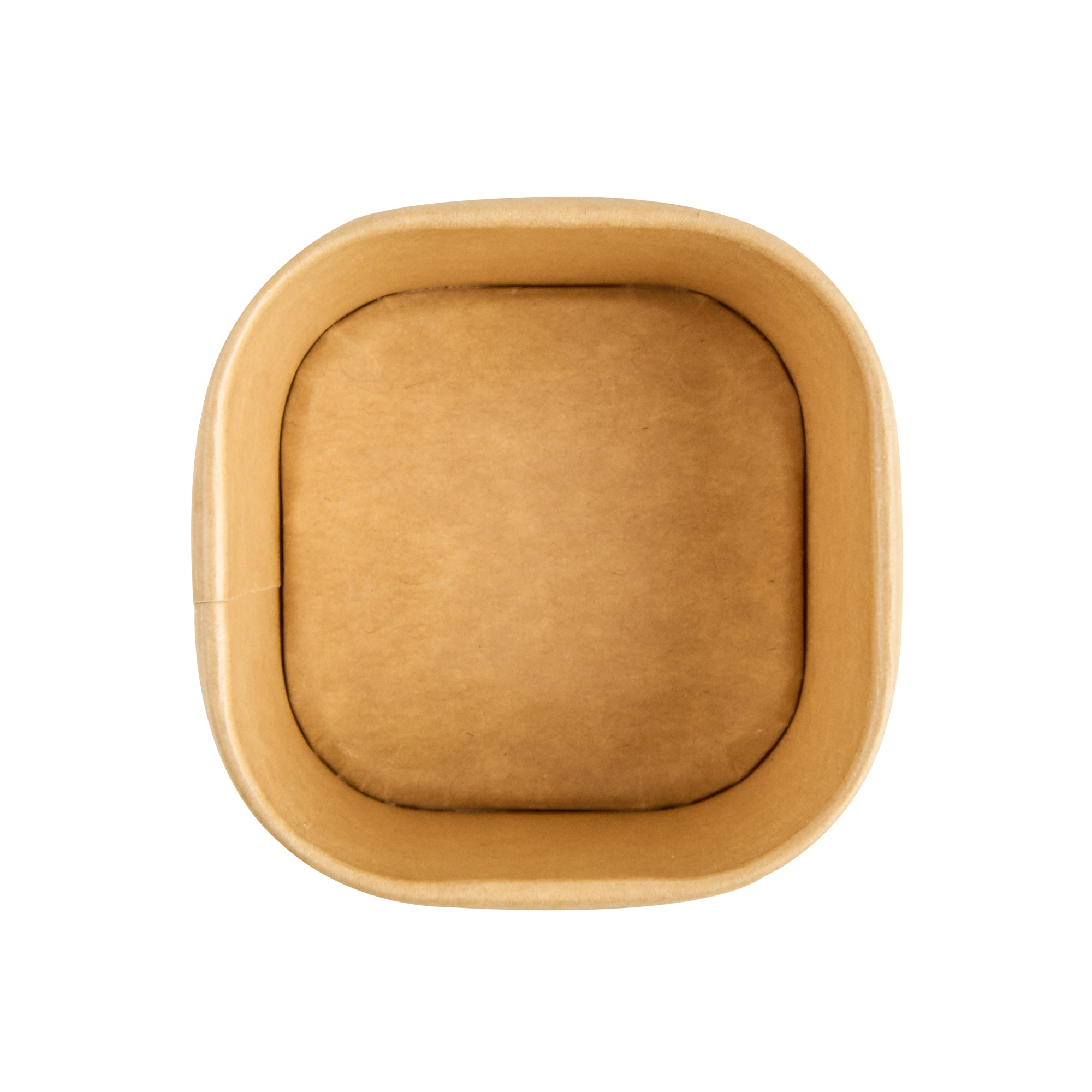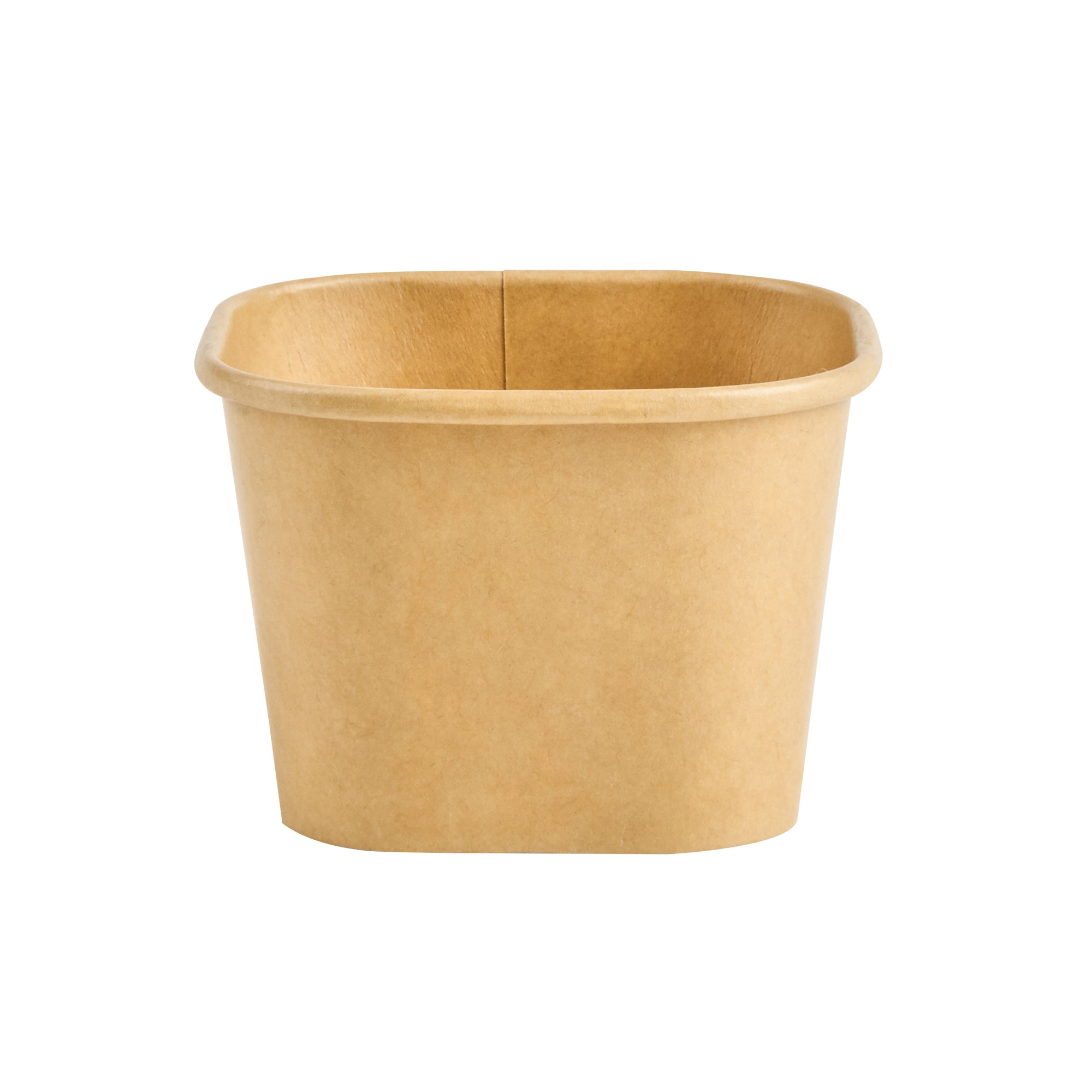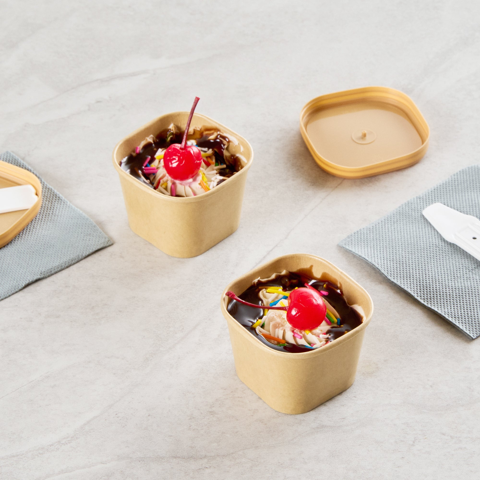 Elevate your food presentation with our Coppetta 3-ounce Square Kraft Paper To Go Cups. These takeaway dessert cups feature a grease-resistant PE lining that keeps oil from seeping through, ensuring a neat and appetizing display. Made from durable paper, these kraft paper cups are perfect for serving both hot and cold foods. The recyclable material of these disposable cups provides an eco-friendly solution for your foodservice needs. With a rolled rim, these square ice cream cups securely hold coordinating lids (SKU: RWA1740BR) for convenient on-the-go use. The natural kraft finish adds a rustic charm, making these to go cups an excellent choice for soups, frozen yogurts, or fresh fruit salads. Freezer-safe, these kraft paper cups allow you to refrigerate leftovers without compromising quality. Each cup has a capacity of 3.04 ounces and measures 2.5 inches in length and width by 1.75 inches in height. Sold in a 200 count box.