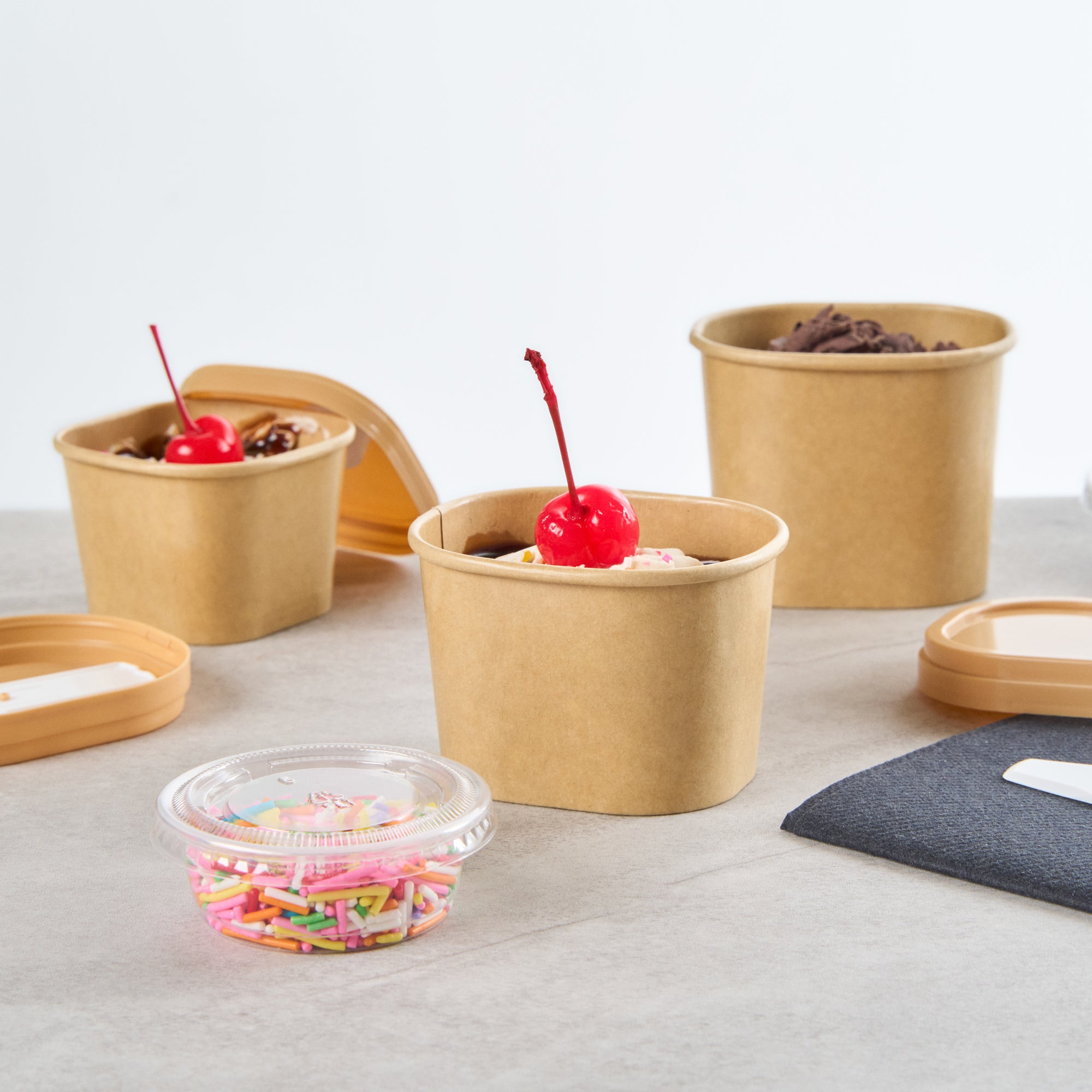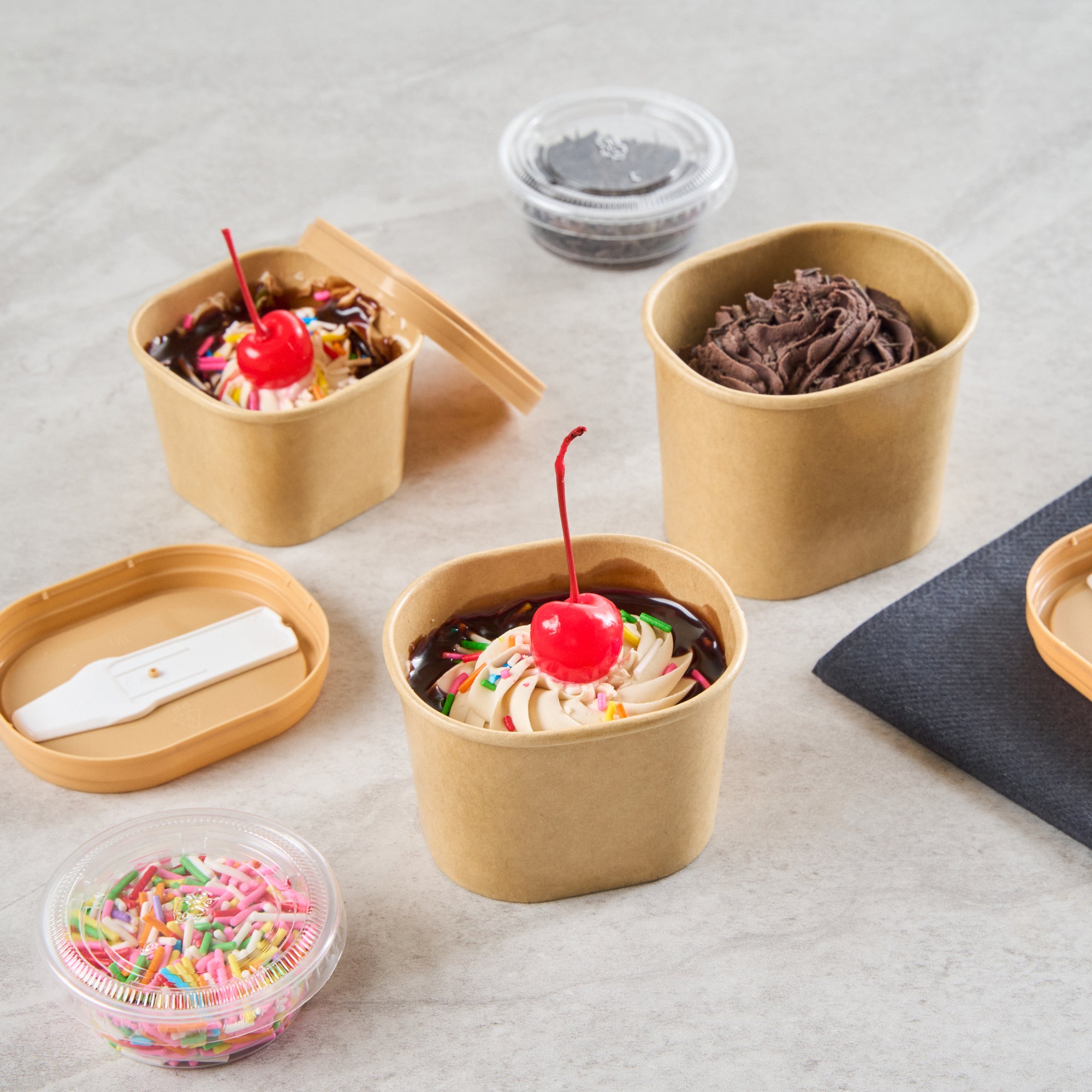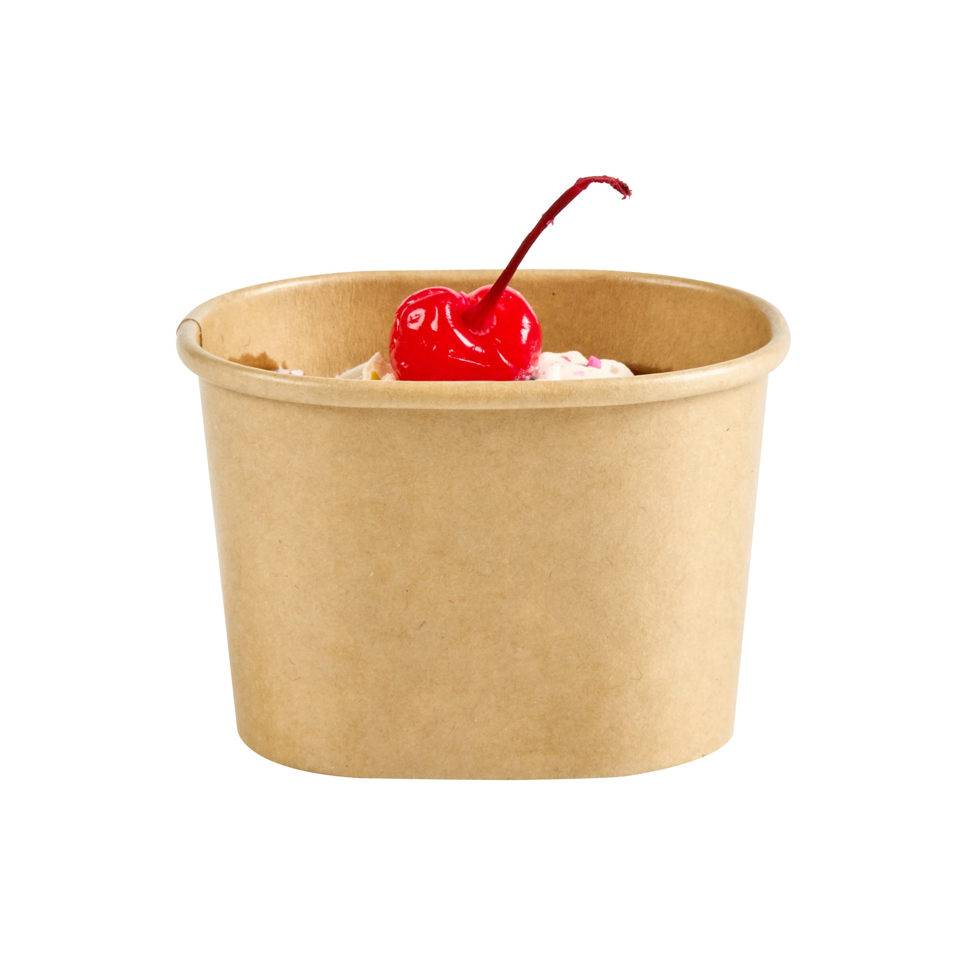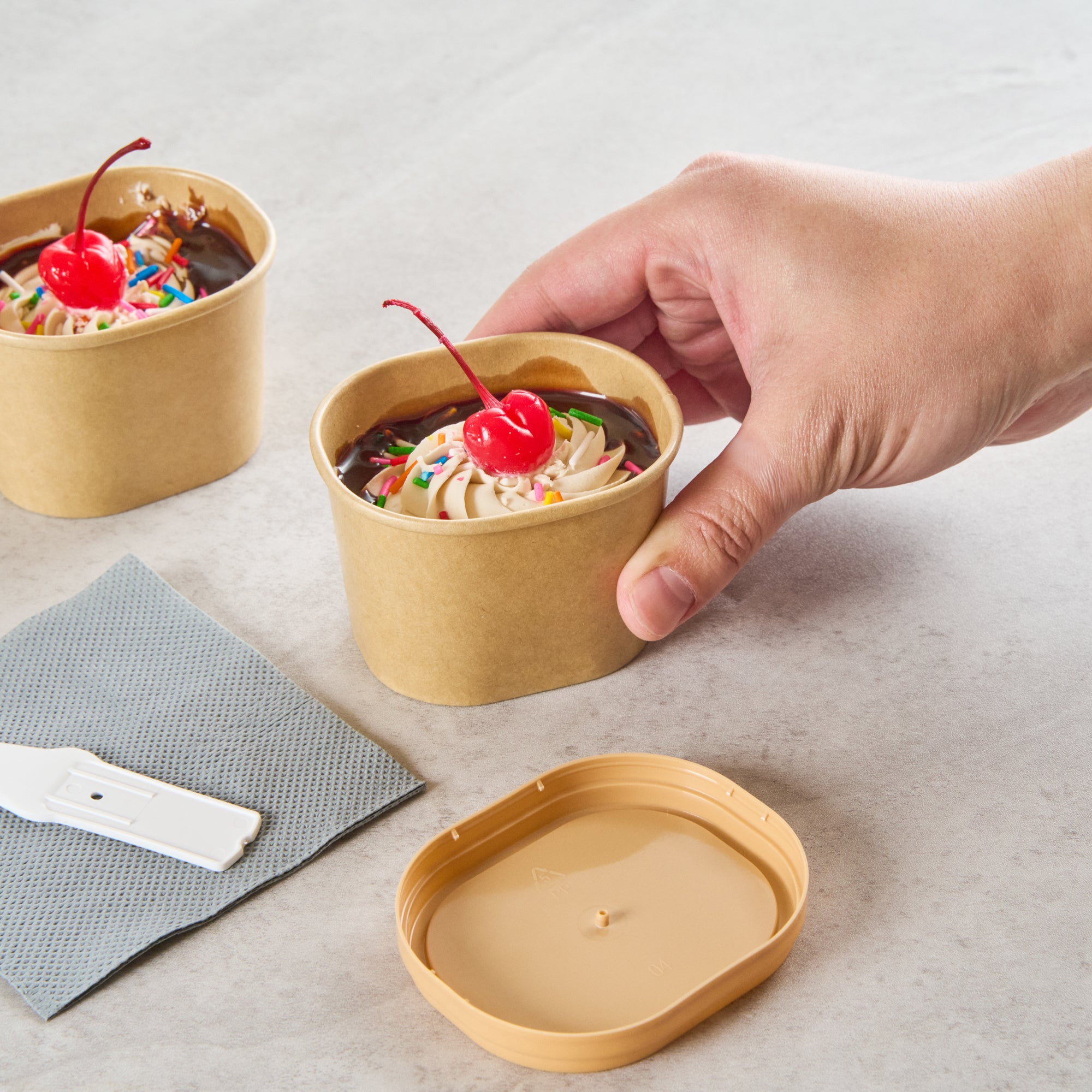 Showcase your creativity with desserts in our Coppetta 4-ounce Square Kraft Paper To Go Cups. These square ice cream cups feature a grease-resistant PE lining to prevent oil from seeping through, ensuring a neat and clean serving. Made from durable paper, these takeaway dessert cups are perfect for both hot and cold foods. With their recyclable convenience, these kraft paper cups provide an eco-friendly solution for serving and presenting food. The rolled rim design of these to go cups securely holds coordinating lids (SKU: RWA1741BR), making them ideal for on-the-go meals. The natural kraft finish adds a rustic charm to these disposable cups, making them a stylish choice for soups, frozen yogurts, or fresh fruit salads. These round ice cream cups are also freezer-safe, allowing you to refrigerate leftovers conveniently. Each cup holds a capacity of 4.3 ounces and measures 3.03 inches in length by 2.48 inches in width by 1.97 inches in height. Sold in a 50 count box.