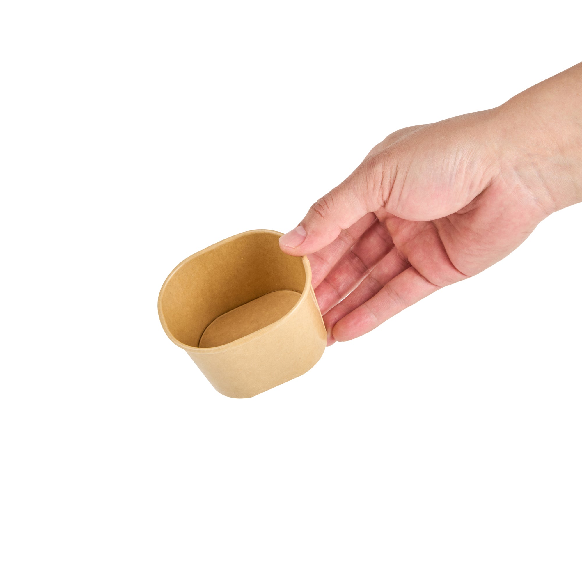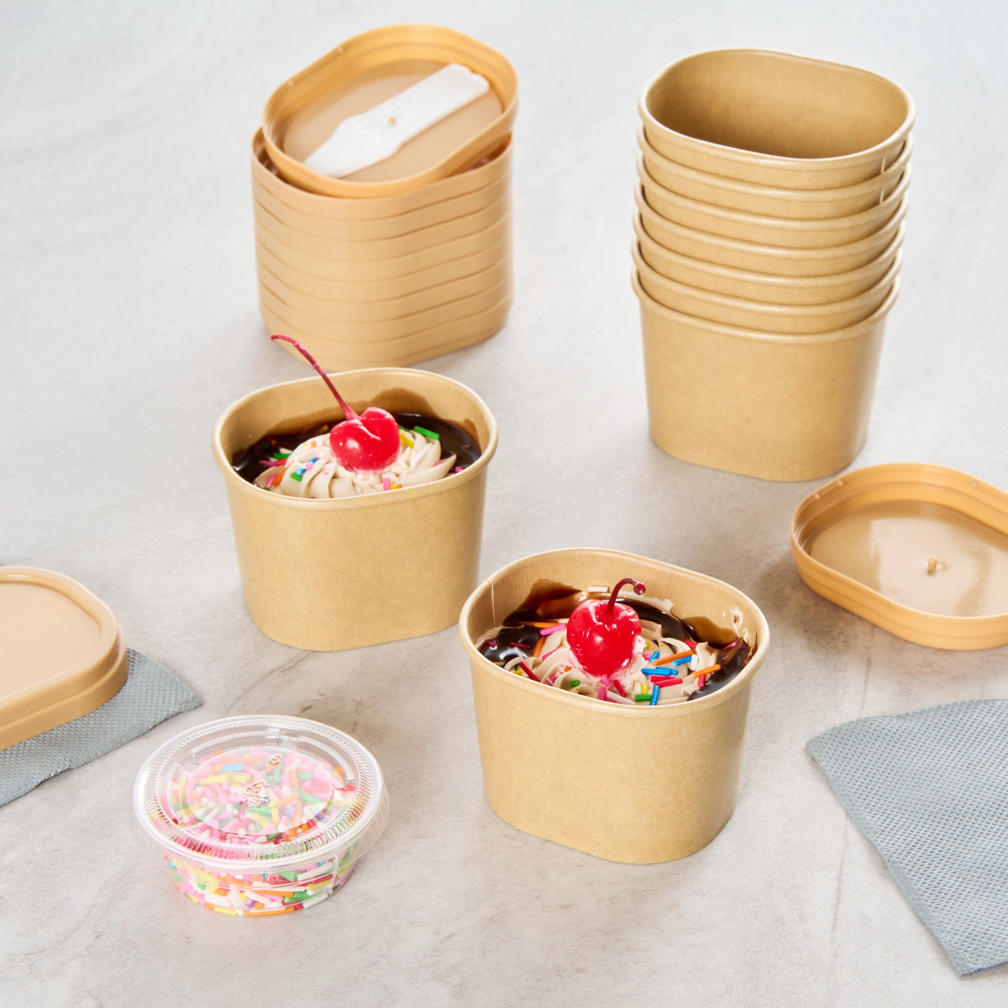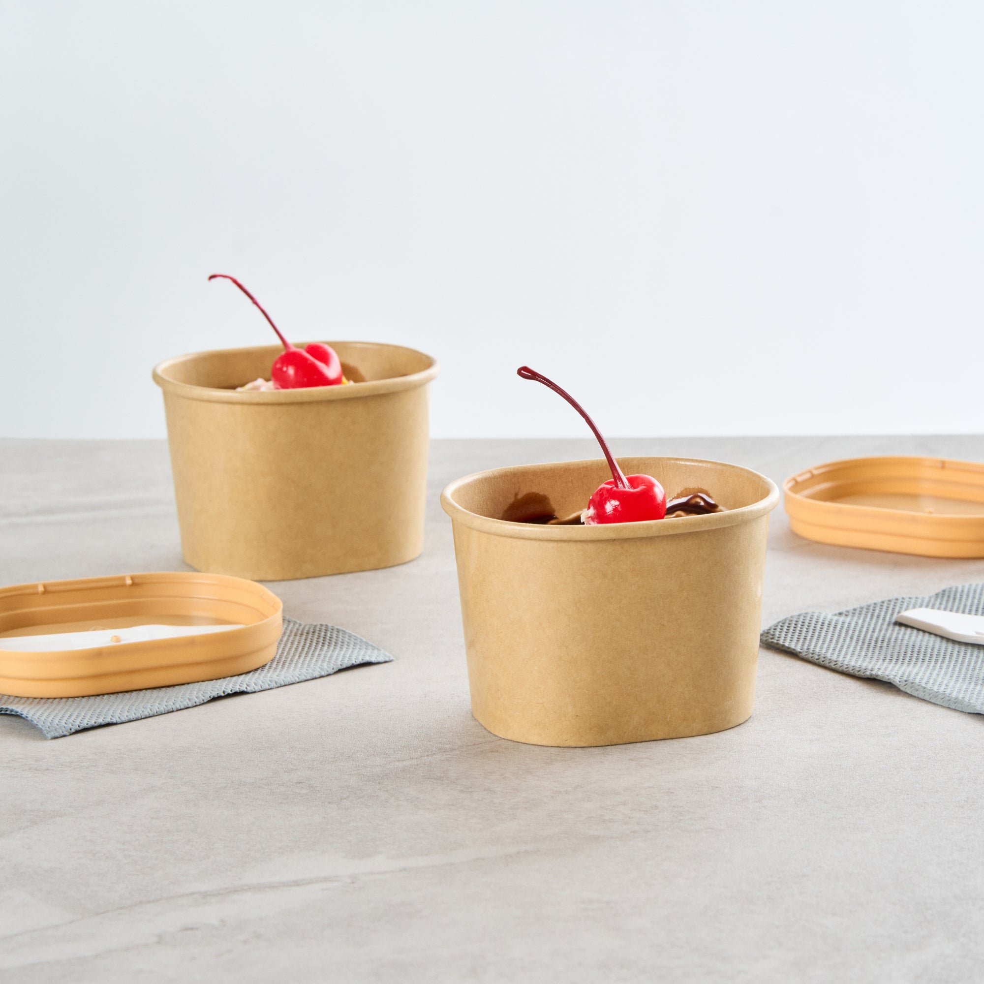 Showcase your creativity with desserts in our Coppetta 4-ounce Square Kraft Paper To Go Cups. These square ice cream cups feature a grease-resistant PE lining to prevent oil from seeping through, ensuring a neat and clean serving. Made from durable paper, these takeaway dessert cups are perfect for both hot and cold foods. With their recyclable convenience, these kraft paper cups provide an eco-friendly solution for serving and presenting food. The rolled rim design of these to go cups securely holds coordinating lids (SKU: RWA1741BR), making them ideal for on-the-go meals. The natural kraft finish adds a rustic charm to these disposable cups, making them a stylish choice for soups, frozen yogurts, or fresh fruit salads. These round ice cream cups are also freezer-safe, allowing you to refrigerate leftovers conveniently. Each cup holds a capacity of 4.3 ounces and measures 3.03 inches in length by 2.48 inches in width by 1.97 inches in height. Sold in a 50 count box.