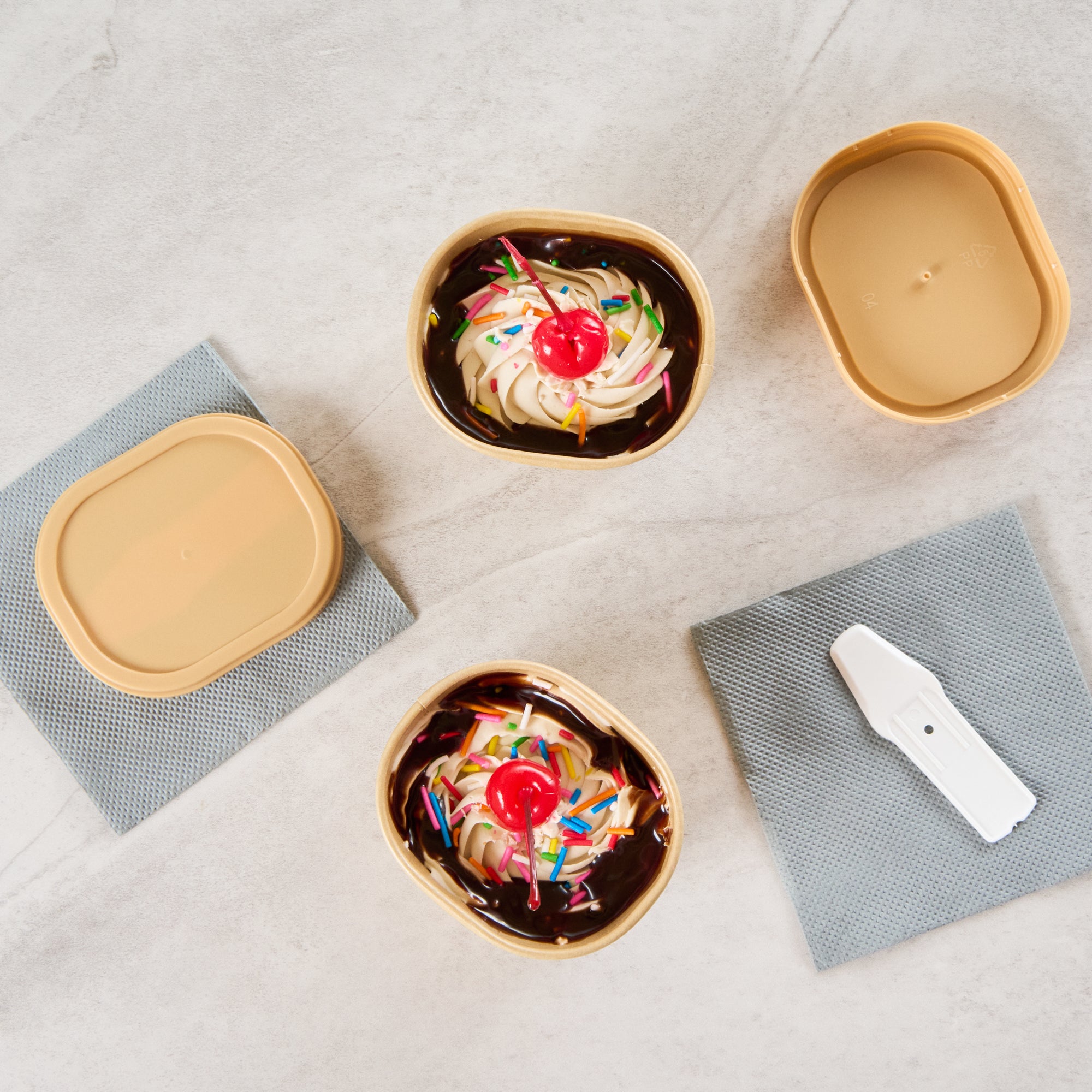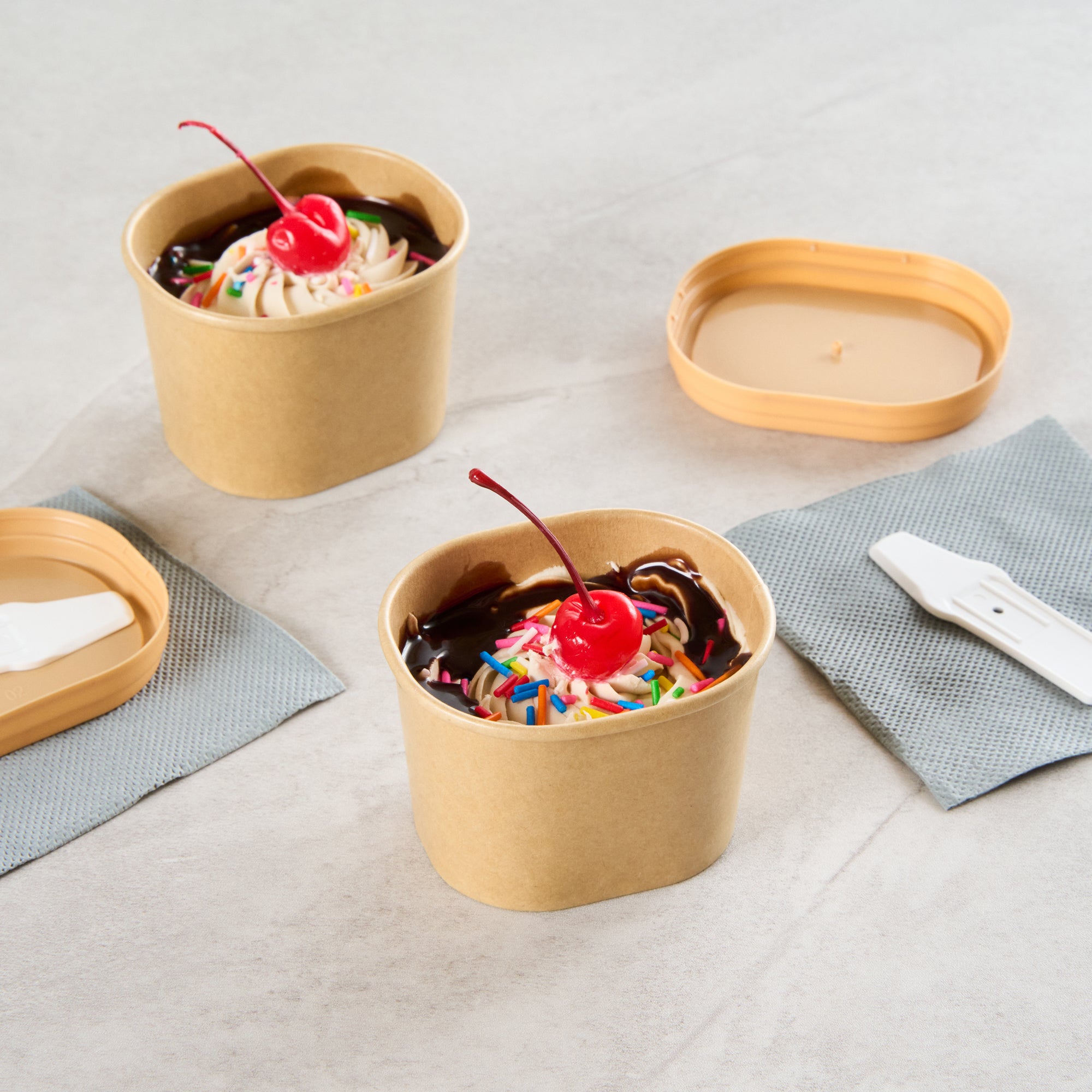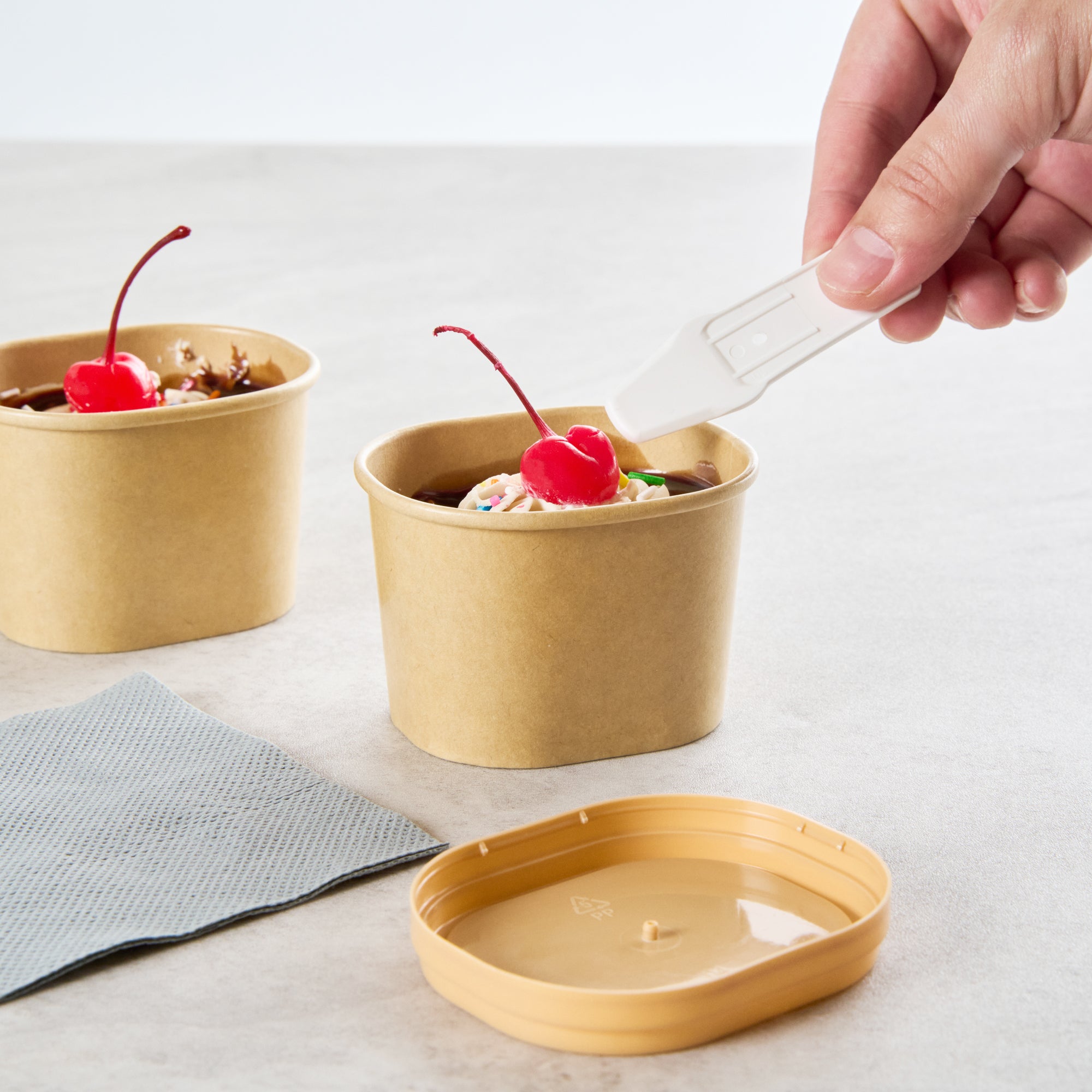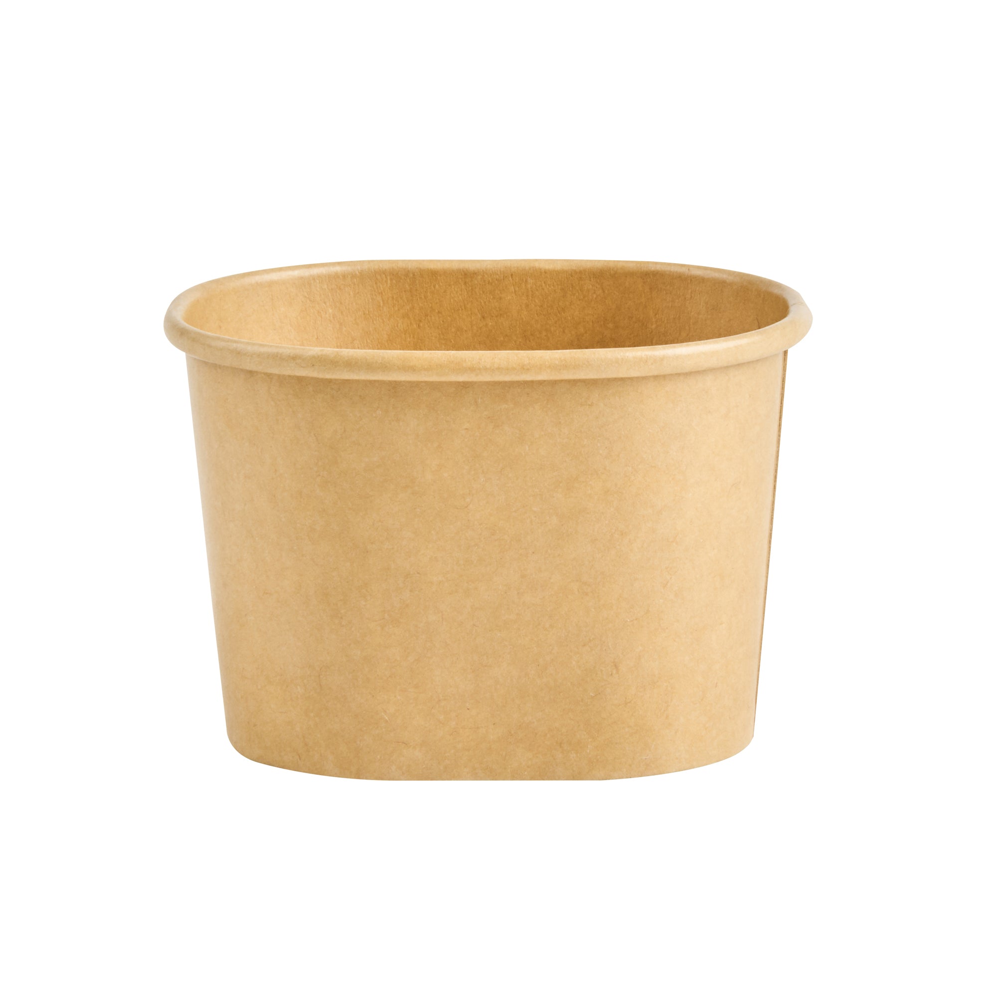 Showcase your creativity with desserts in our Coppetta 4-ounce Square Kraft Paper To Go Cups. These square ice cream cups feature a grease-resistant PE lining to prevent oil from seeping through, ensuring a neat and clean serving. Made from durable paper, these takeaway dessert cups are perfect for both hot and cold foods. With their recyclable convenience, these kraft paper cups provide an eco-friendly solution for serving and presenting food. The rolled rim design of these to go cups securely holds coordinating lids (SKU: RWA1741BR), making them ideal for on-the-go meals. The natural kraft finish adds a rustic charm to these disposable cups, making them a stylish choice for soups, frozen yogurts, or fresh fruit salads. These round ice cream cups are also freezer-safe, allowing you to refrigerate leftovers conveniently. Each cup holds a capacity of 4.3 ounces and measures 3.03 inches in length by 2.48 inches in width by 1.97 inches in height. Sold in a 50 count box.