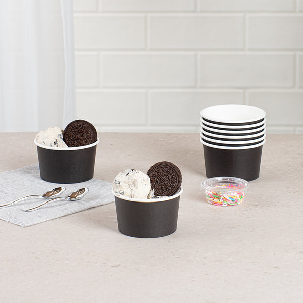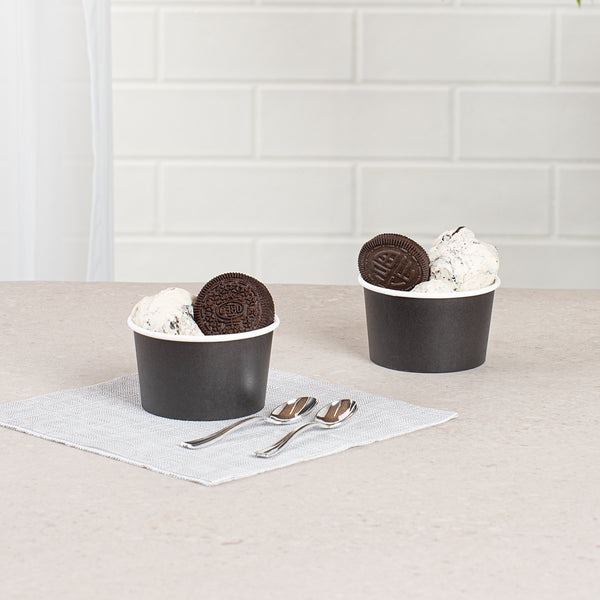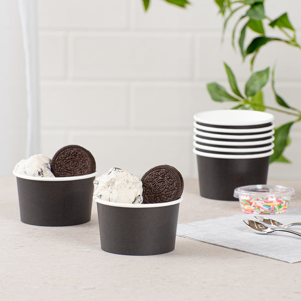 Great for serving hot or cold dishes! Crafted from thick paper, these dessert cups are durable and ideal for serving ice cream at a birthday party or warm chili at a cookoff.