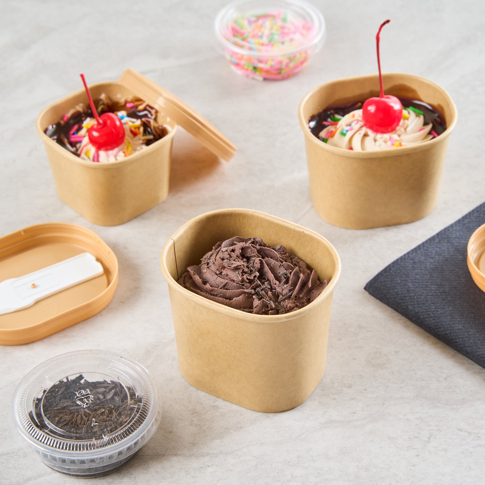 Elevate dessert moments with our Coppetta 5-ounce Square Kraft Paper To Go Cups. These square ice cream cups feature a grease-resistant PE lining to keep oil from seeping through for a neat food presentation. Made from durable paper, these takeaway dessert cups are ideal for serving both hot and cold foods. Designed with recyclability in mind, these kraft paper cups provide an eco-friendly option for your foodservice needs. A rolled rim ensures these to go cups securely hold coordinating lids (SKU: RWA1741BR) for convenient transport. Showcasing a natural kraft finish, these disposable cups add rustic charm to soups, frozen yogurts, or fresh fruit salads. Freezer-safe, these square ice cream cups allow for easy refrigeration of leftovers. With a capacity of 5.4 ounces, these kraft paper cups measure 3.03 inches in length by 2.48 inches in width by 2.36 inches in height. Sold in a 50 count box.