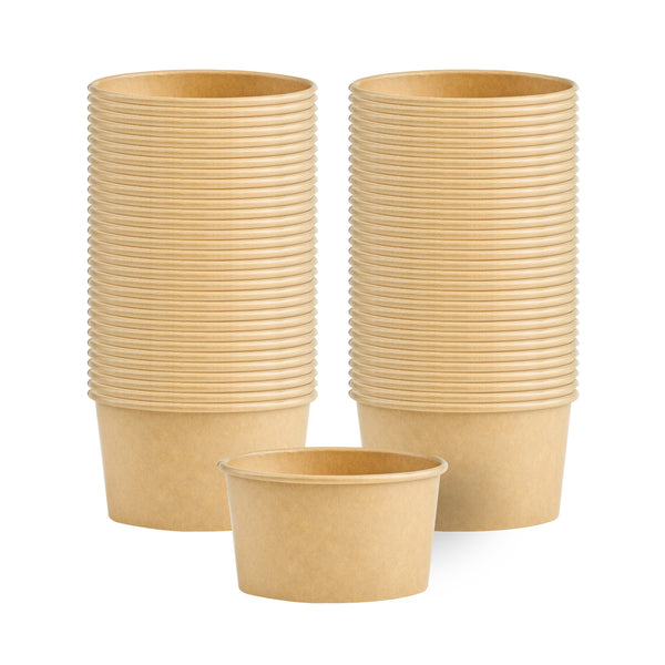 Our Coppetta 6-ounce Oval Kraft Paper To Go Cups are perfect for serving all your delicious creations with style. These oval ice cream cups feature a grease-resistant PE lining to keep oil from seeping through, ensuring a neat food presentation every time. Made from durable paper, these takeaway dessert cups are suitable for serving both hot and cold foods. For eco-friendly convenience, these kraft paper cups are recyclable, making them an ideal choice for environmentally conscious establishments. A rolled rim design on these to go cups securely holds coordinating lids (SKU: RWA1747BR), allowing you to take your food on-the-go without worry. The natural kraft finish of these disposable cups adds a rustic charm, perfect for serving soups, frozen yogurts, or fresh fruit salads. Freezer-safe, these round ice cream cups allow you to refrigerate any leftovers with ease. Each cup has a 6-ounce capacity and measures 3.86 inches in length by 2.95 inches in width by 2.13 inches in height. Sold in a 200 count box.