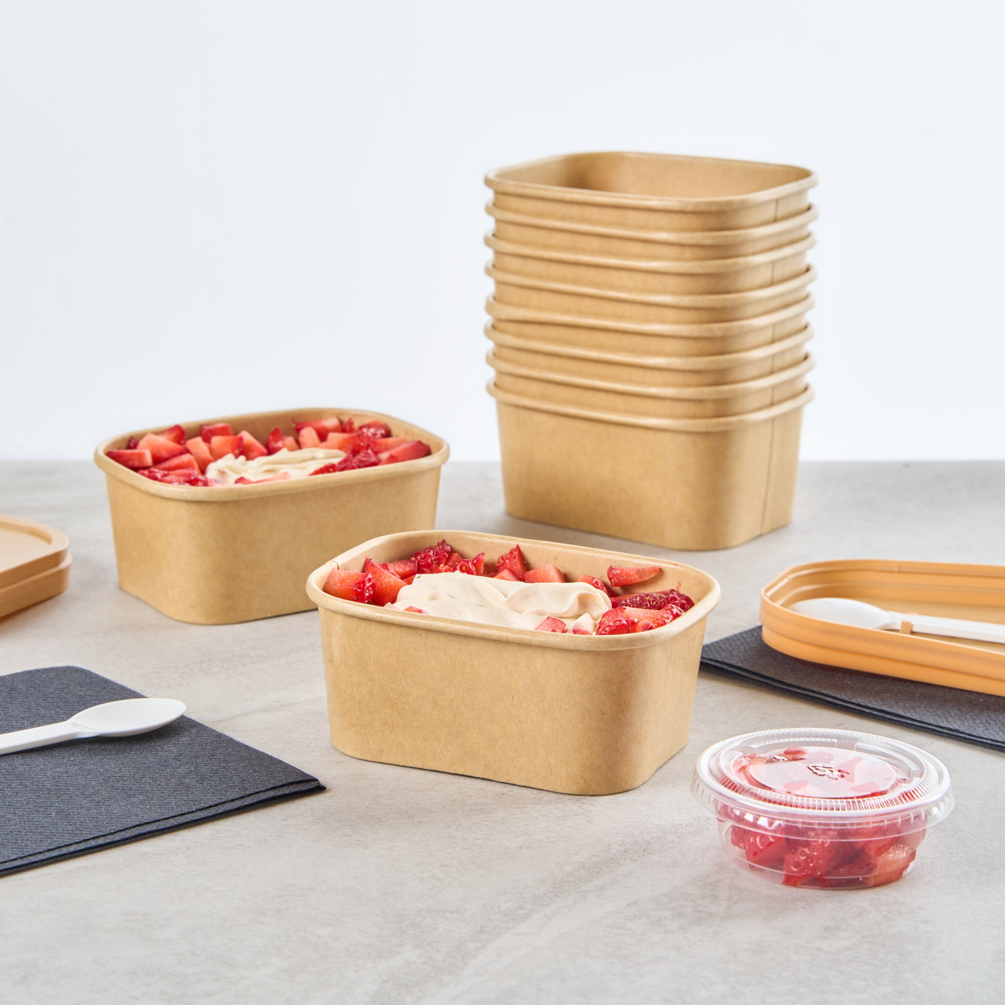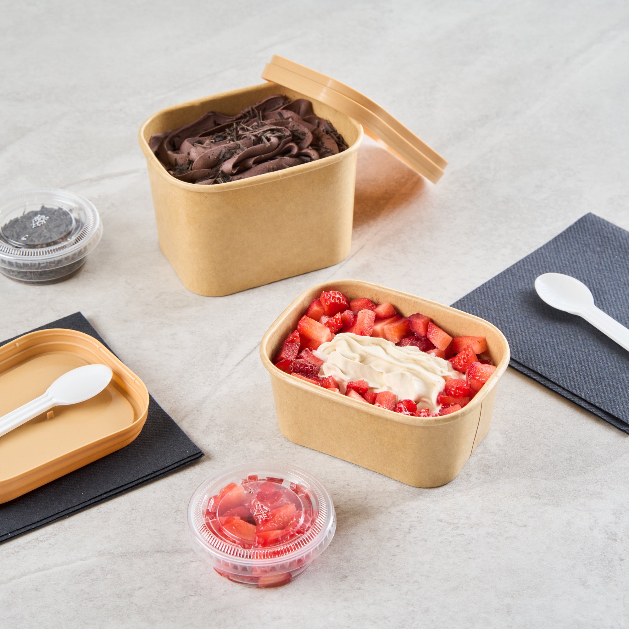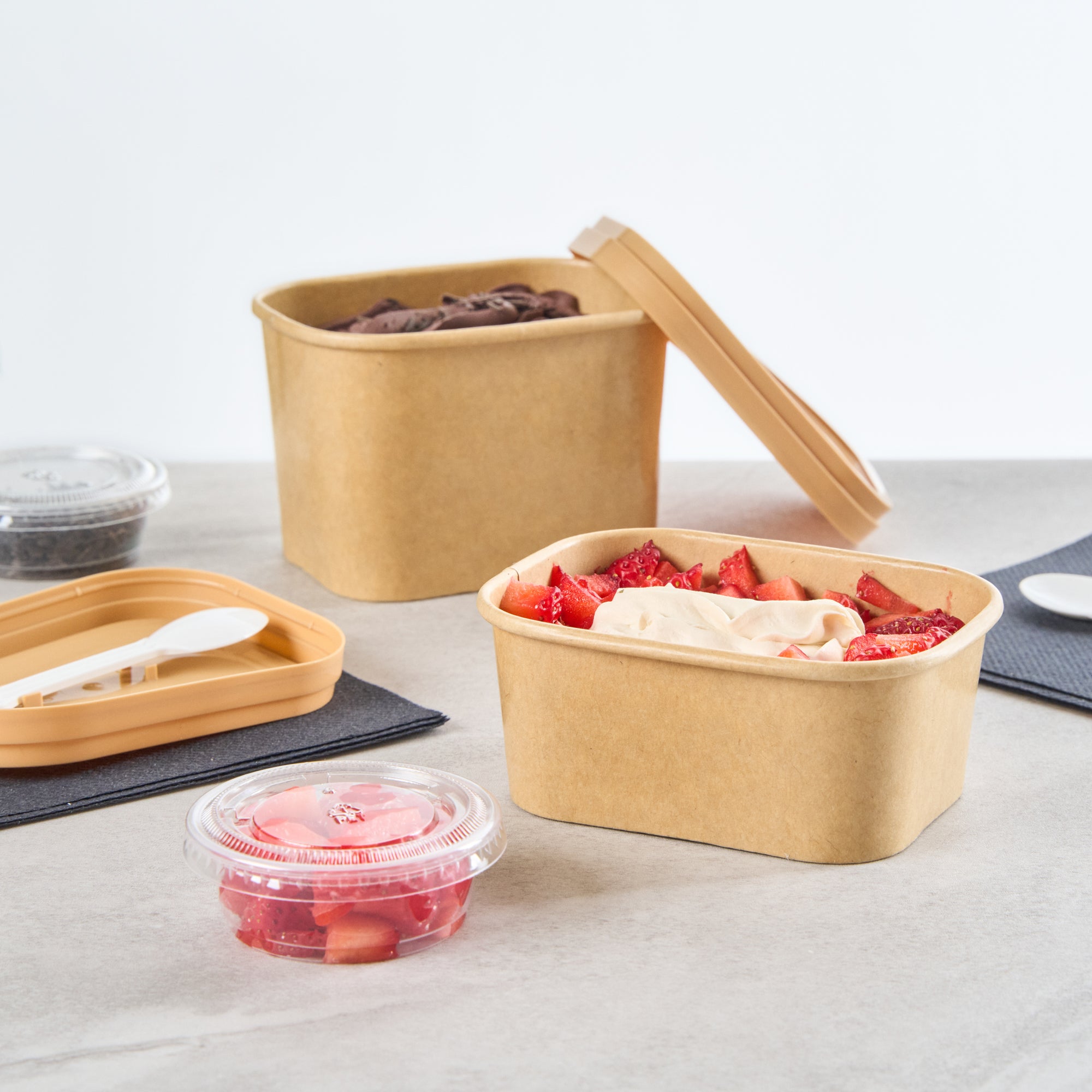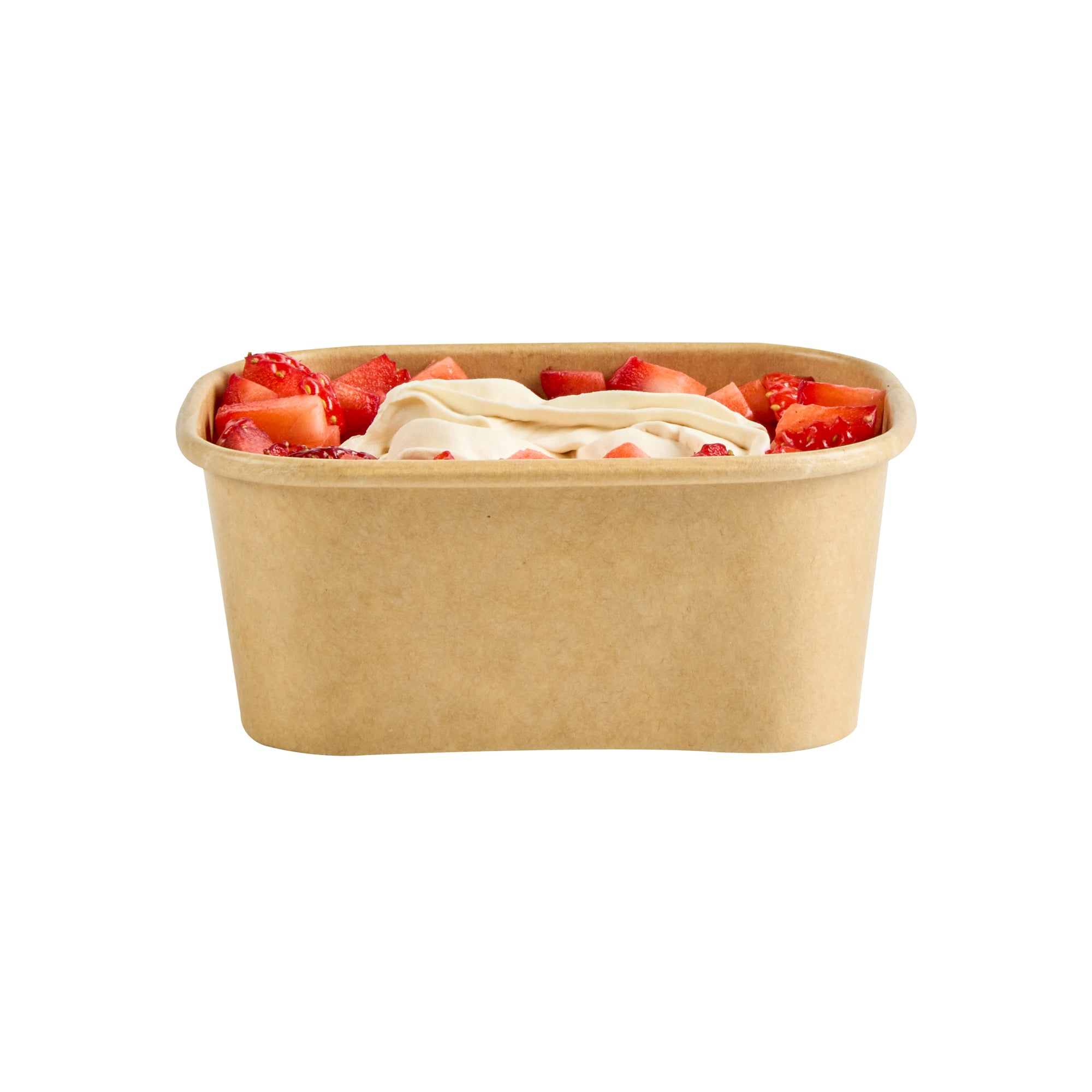 Serve stunning desserts in our Coppetta 7-ounce Square Kraft Paper To Go Cups. These square ice cream cups feature a grease-resistant PE lining that ensures a neat and tidy food presentation by preventing oil from seeping through. Made from durable paper, these takeaway dessert cups are perfect for both hot and cold foods. The recyclable convenience of these kraft paper cups makes them an eco-friendly choice for serving and presenting food. Equipped with a rolled rim, these to go cups securely hold coordinating lids (SKU: RWA1736W) for easy transportation. The natural kraft finish of these disposable cups adds a rustic charm, ideal for serving soups, frozen yogurts, or fresh fruit salads with style. Freezer-safe, these square ice cream cups allow you to refrigerate your leftovers without any hassle. Each kraft paper cup has a capacity of 7 ounces and measures 4.21 inches in length by 3.23 inches in width by 1.77 inches in height. Sold in a 50 count box.