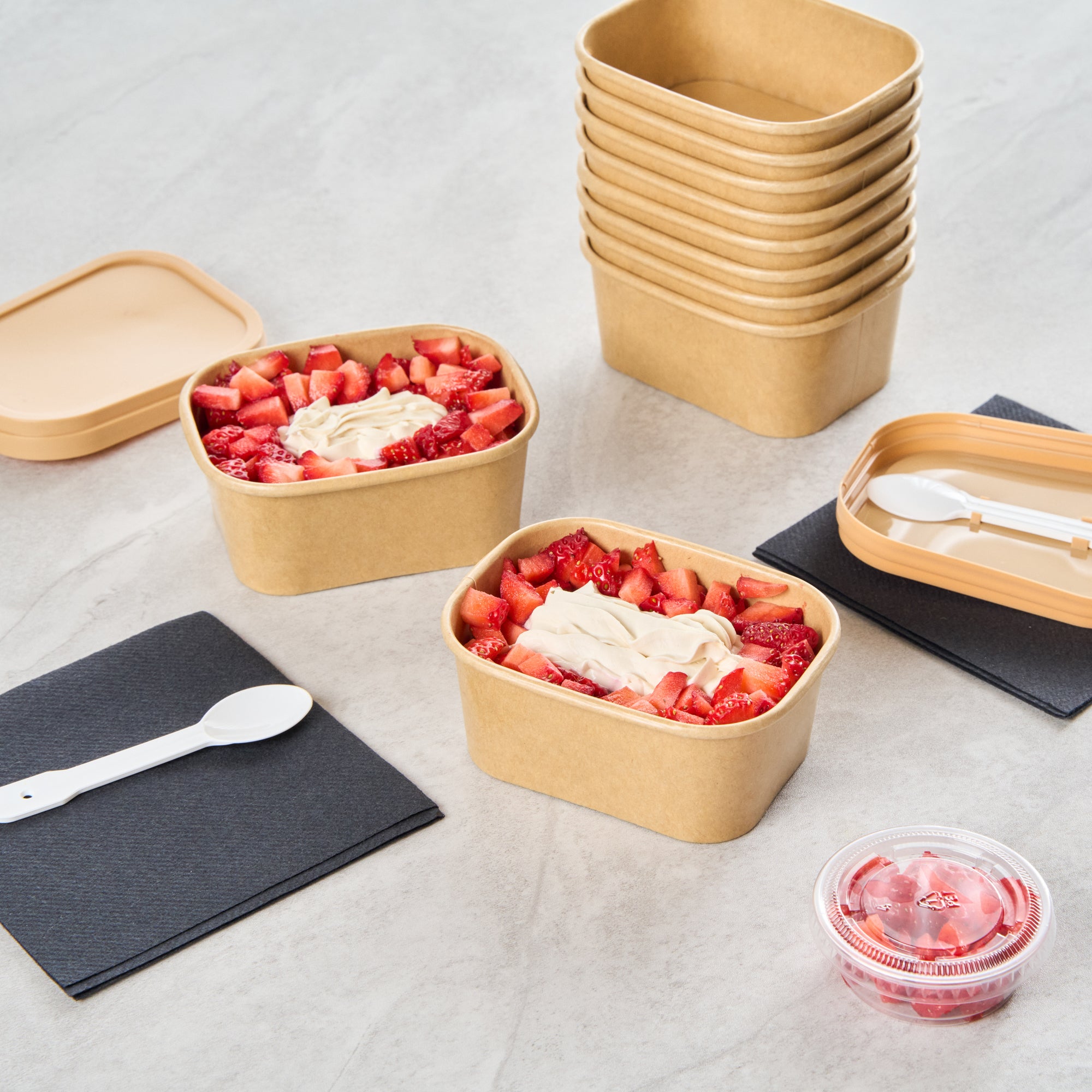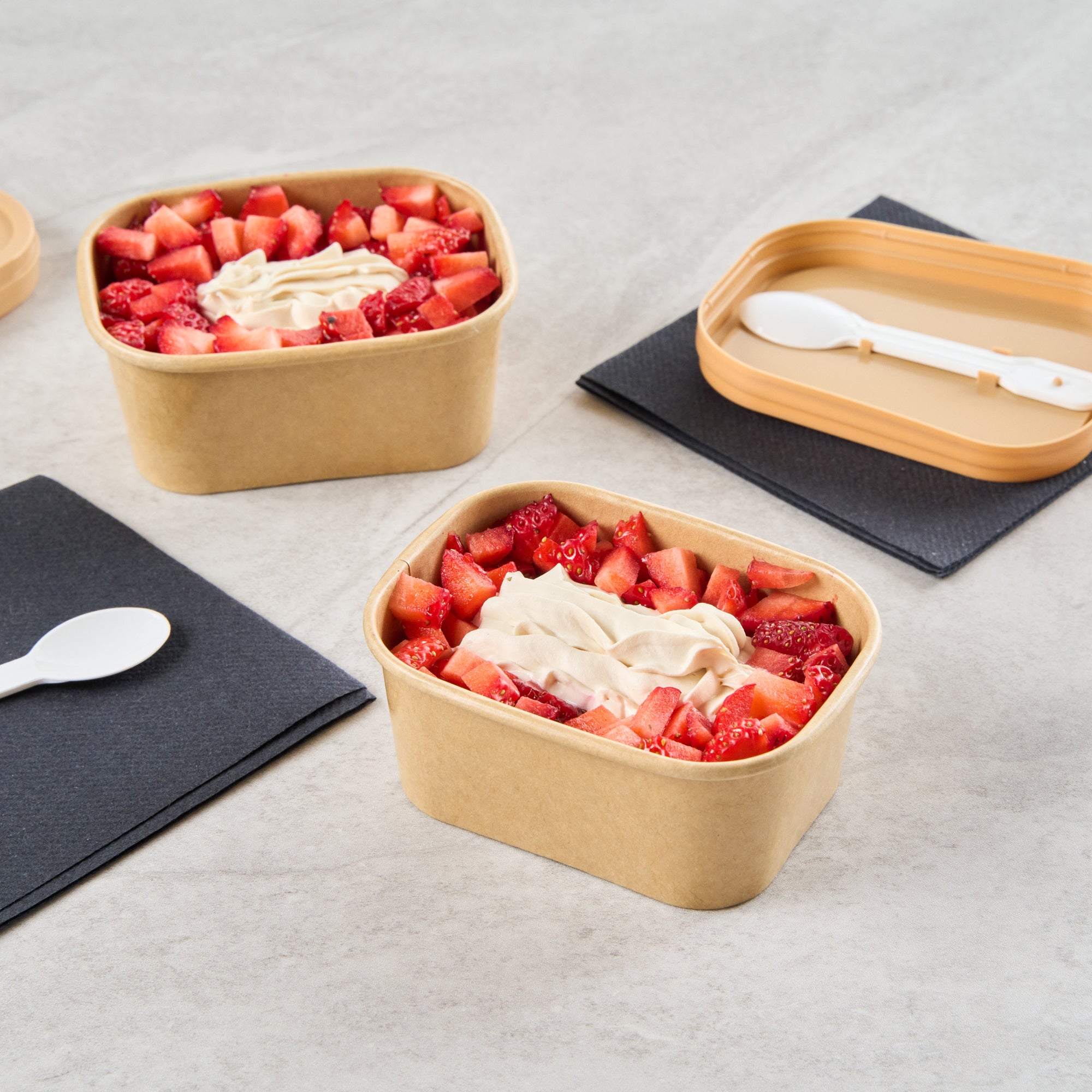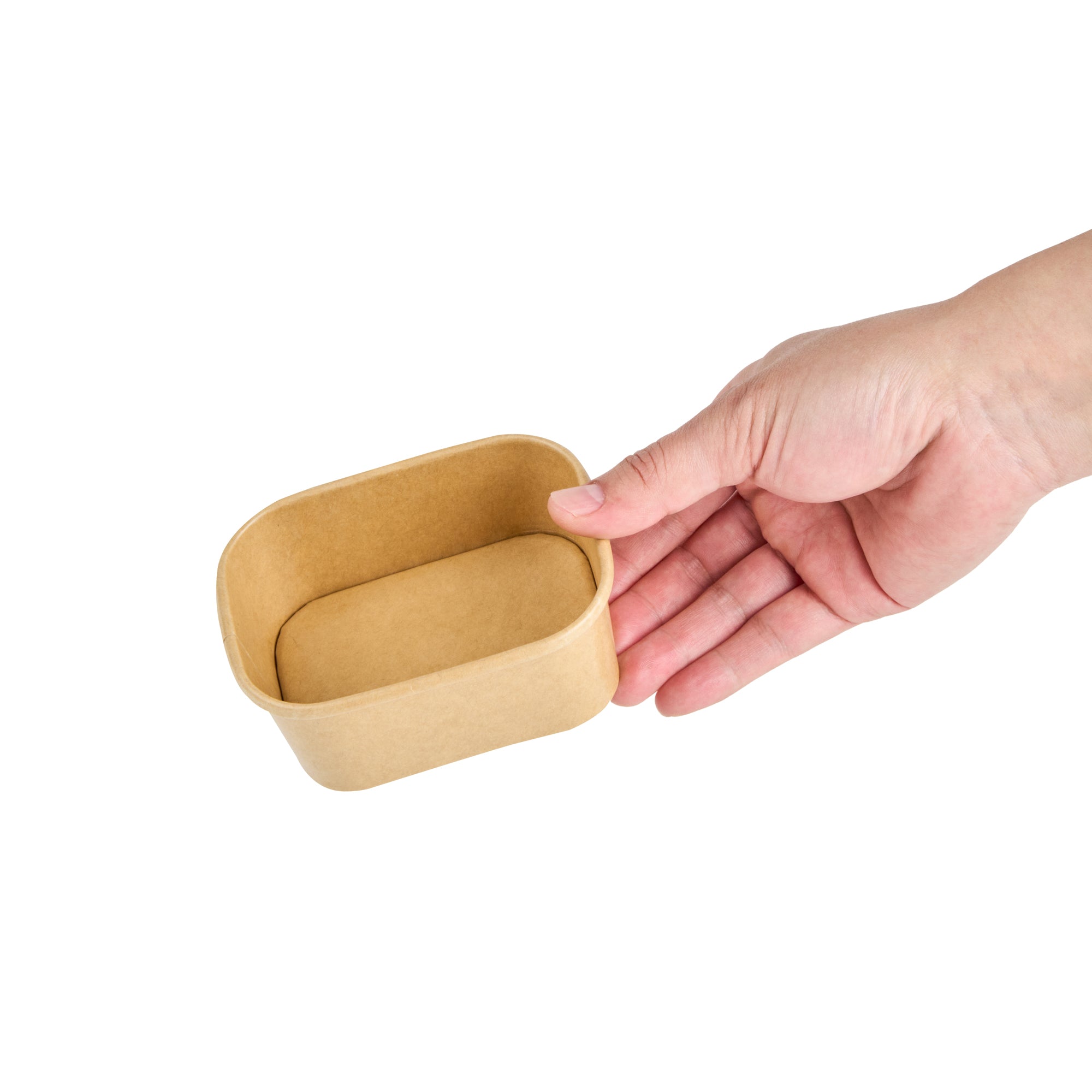 Serve stunning desserts in our Coppetta 7-ounce Square Kraft Paper To Go Cups. These square ice cream cups feature a grease-resistant PE lining that ensures a neat and tidy food presentation by preventing oil from seeping through. Made from durable paper, these takeaway dessert cups are perfect for both hot and cold foods. The recyclable convenience of these kraft paper cups makes them an eco-friendly choice for serving and presenting food. Equipped with a rolled rim, these to go cups securely hold coordinating lids (SKU: RWA1736W) for easy transportation. The natural kraft finish of these disposable cups adds a rustic charm, ideal for serving soups, frozen yogurts, or fresh fruit salads with style. Freezer-safe, these square ice cream cups allow you to refrigerate your leftovers without any hassle. Each kraft paper cup has a capacity of 7 ounces and measures 4.21 inches in length by 3.23 inches in width by 1.77 inches in height. Sold in a 50 count box.
