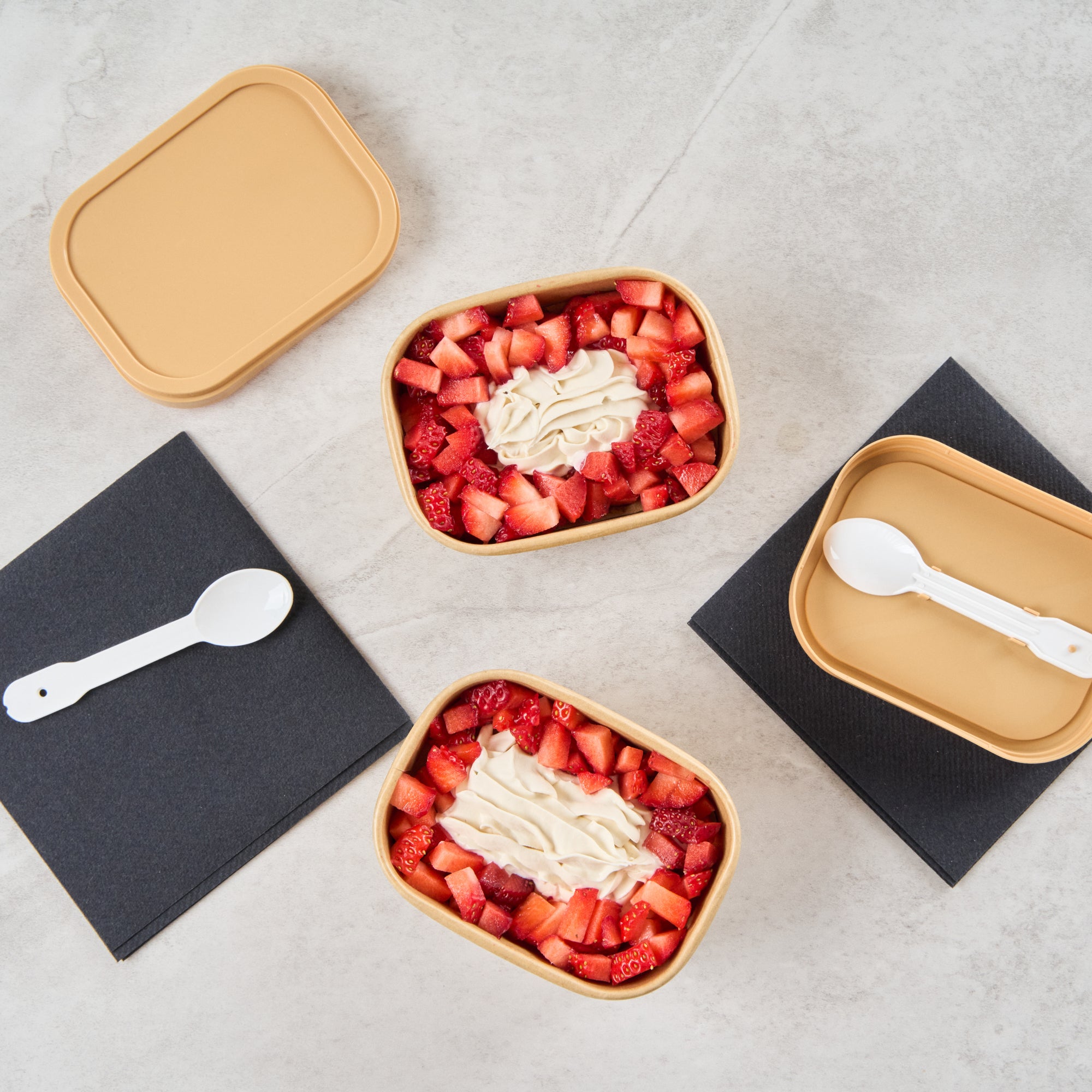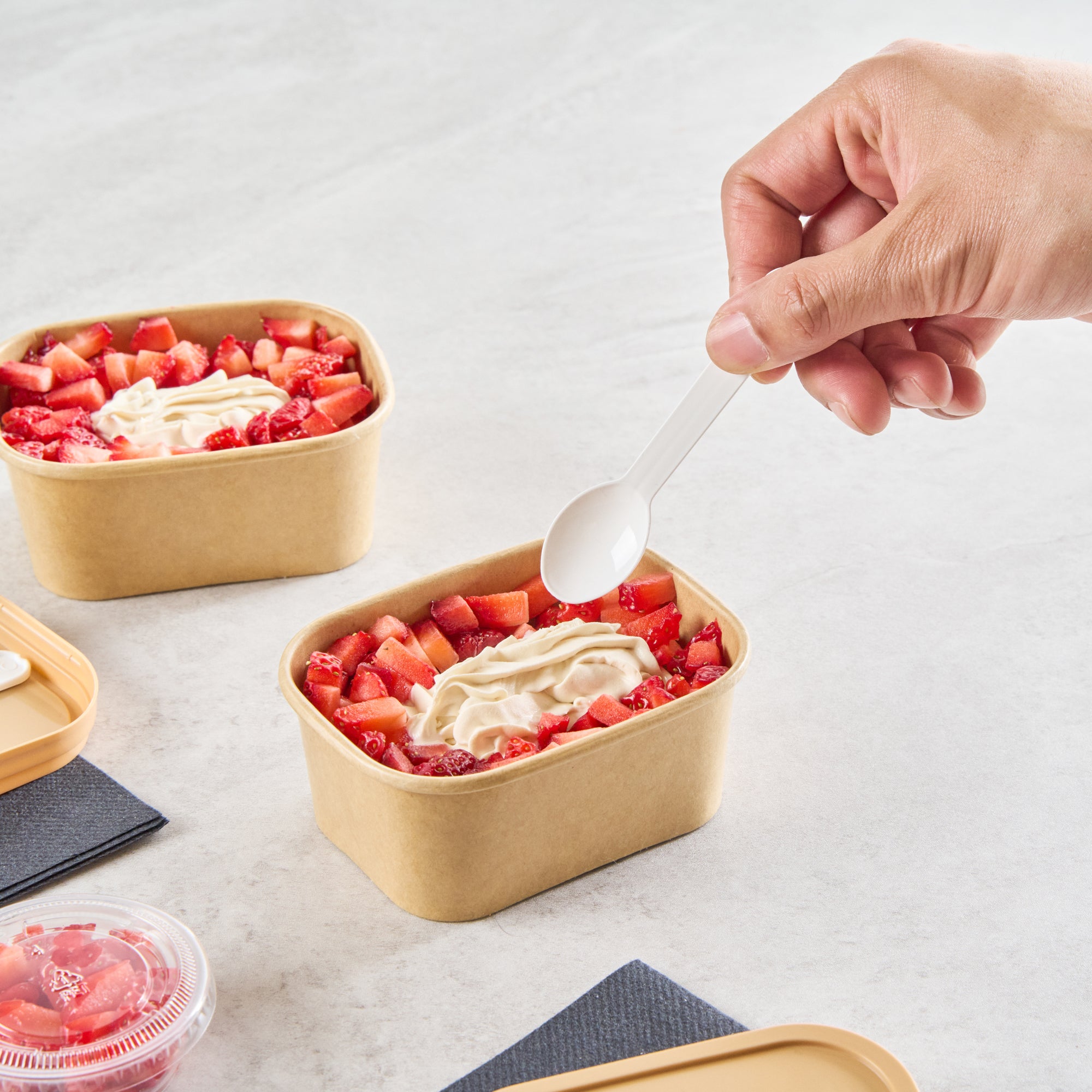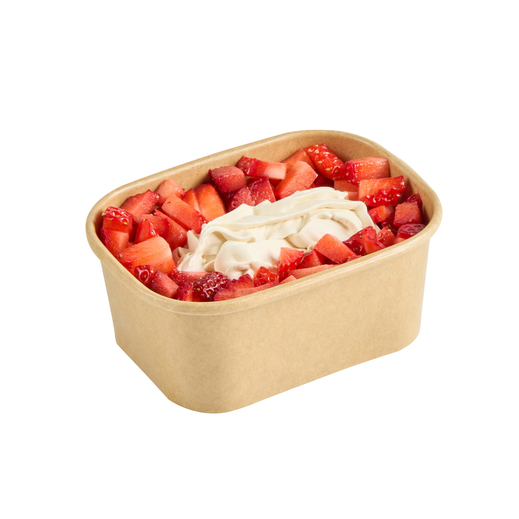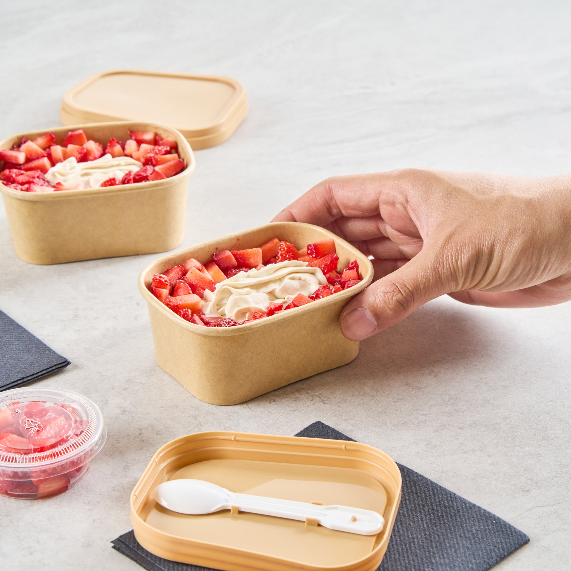 Serve stunning desserts in our Coppetta 7-ounce Square Kraft Paper To Go Cups. These square ice cream cups feature a grease-resistant PE lining that ensures a neat and tidy food presentation by preventing oil from seeping through. Made from durable paper, these takeaway dessert cups are perfect for both hot and cold foods. The recyclable convenience of these kraft paper cups makes them an eco-friendly choice for serving and presenting food. Equipped with a rolled rim, these to go cups securely hold coordinating lids (SKU: RWA1736W) for easy transportation. The natural kraft finish of these disposable cups adds a rustic charm, ideal for serving soups, frozen yogurts, or fresh fruit salads with style. Freezer-safe, these square ice cream cups allow you to refrigerate your leftovers without any hassle. Each kraft paper cup has a capacity of 7 ounces and measures 4.21 inches in length by 3.23 inches in width by 1.77 inches in height. Sold in a 50 count box.