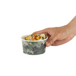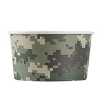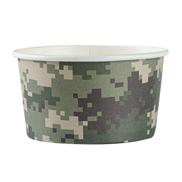 Unleash your taste buds as you enjoy ice cream using our Coppetta 8-ounce Round Camouflage Paper To Go Cups. The rolled rim of these takeaway dessert cups forms a snug seal with coordinating lids (SKU: RWA0292C-50) and makes your treats easily portable. Crafted from premium paper, these round ice cream cups are suitable for serving various hot and cold food items. The grease-resistant PE lining of these frozen yogurt paper cups prevents oil or grease from soaking through, assuring a clean and delicious indulgence. With a camouflage print, these premium paper frozen dessert cups capture customers' attention and make their experience memorable. To store your leftovers, these 8-ounce cups are freezer-safe and let you refrigerate them. These disposable dessert cups are recyclable and help reduce your carbon footprint. Measuring 3.7 inches in diameter by 2.2 inches tall, these cups for ice cream take up minimal space while holding 8 ounces of your favorite dessert. Sold in a 50 count box. Lids are available and sold separately.