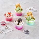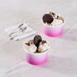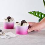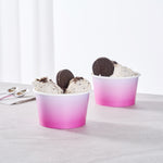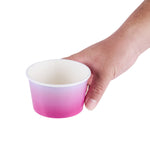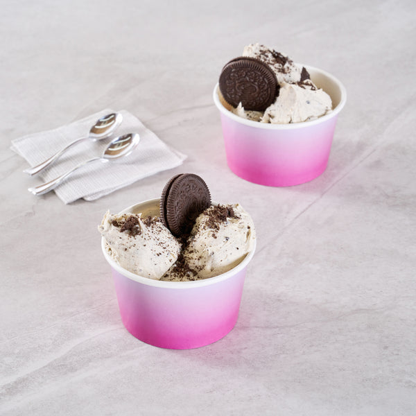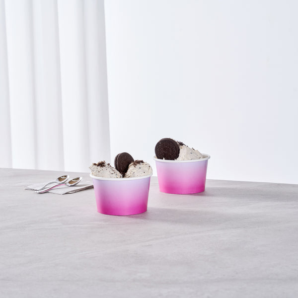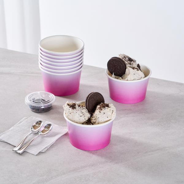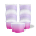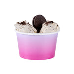 Elevate every bite of your snacks with our Coppetta 8-ounce Round Purple And Blue Ombre Paper To Go Cups. These takeaway dessert cups feature a grease-resistant PE lining to keep oil from seeping through for a neat food presentation. Constructed from durable paper, these frozen yogurt paper cups are suitable for serving both hot and cold foods. For eco-friendly convenience, these disposable cups are recyclable, making them a great choice for environmentally conscious establishments. Designed with a rolled rim, these to go cups securely hold coordinating lids (SKU: RWP1769W) for easy transport. The stylish purple and blue ombre design gives these premium paper frozen dessert cups an upscale appearance, perfect for enhancing your food presentation. These round ice cream cups are also freezer-safe, allowing you to store leftovers without any hassle. Measuring 3.82 inches in diameter by 2.28 inches in height, these disposable cups have an 8-ounce capacity to perfectly portion your offerings. Sold in a 200 count box.