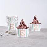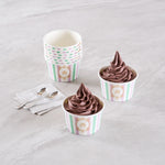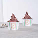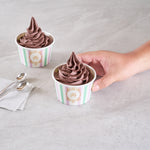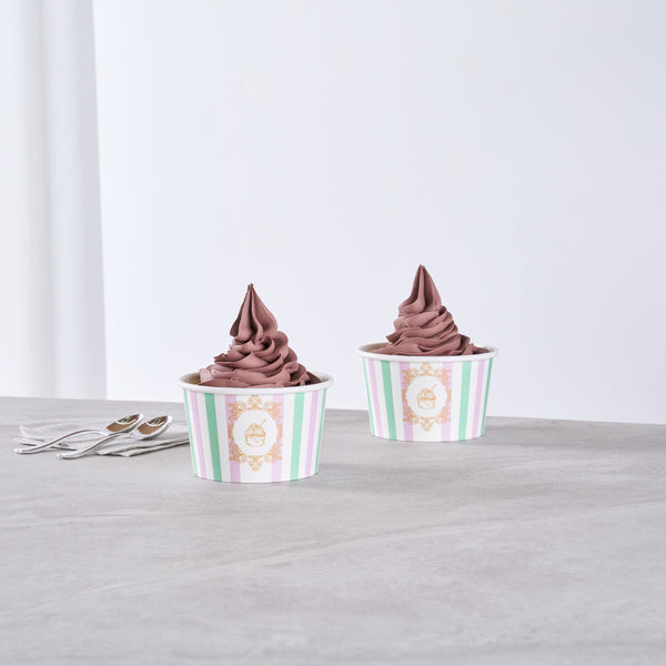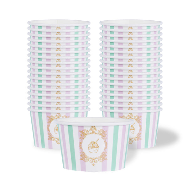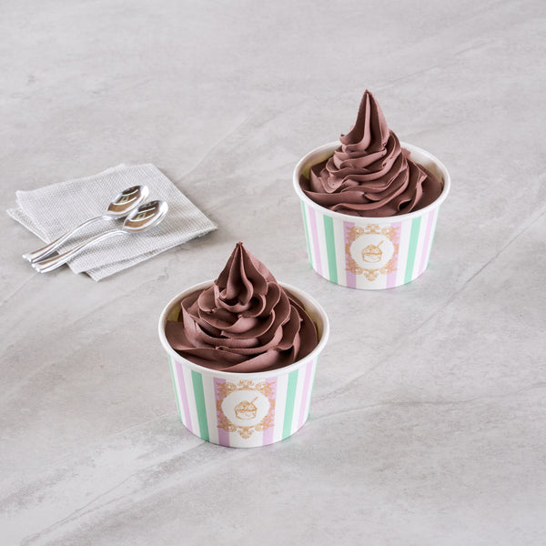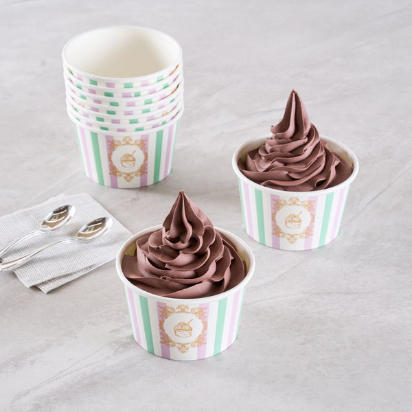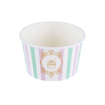 Elevate your food presentation with our Coppetta 8-ounce Round Purple And Blue Stripe Paper To Go Cups, perfect for showcasing desserts in style. These takeaway dessert cups feature a grease-resistant PE lining that keeps oil from seeping through, ensuring a neat and tidy display. Made from durable paper, these disposable cups are ideal for serving both hot and cold foods, accommodating a variety of menu items. The recyclable convenience of these frozen yogurt paper cups provides an eco-friendly option for your business, making them a sustainable choice. With a rolled rim, these round ice cream cups securely hold coordinating lids (SKU: RWP1769W), allowing you to confidently take your offerings on-the-go. The vibrant purple and blue stripe design gives these to go cups an upscale appearance, enhancing the visual appeal of your food presentation. These freezer-safe paper cups are perfect for refrigerating leftovers, offering practicality and style. Measuring 3.82 inches in diameter by 2.28 inches in height, these 8-ounce cups are an excellent size for serving delectable treats. Sold in a 200 count box.
