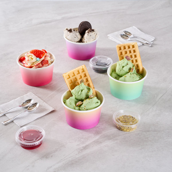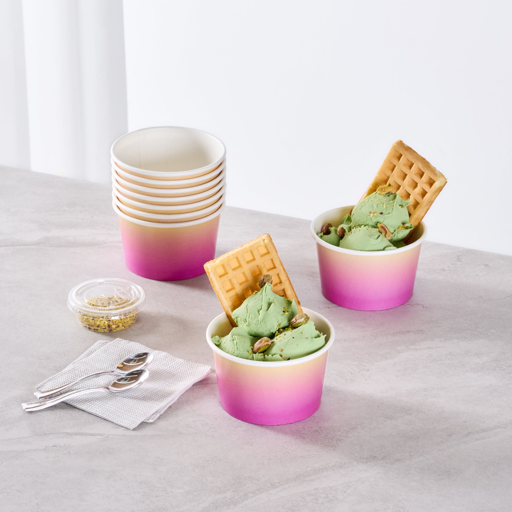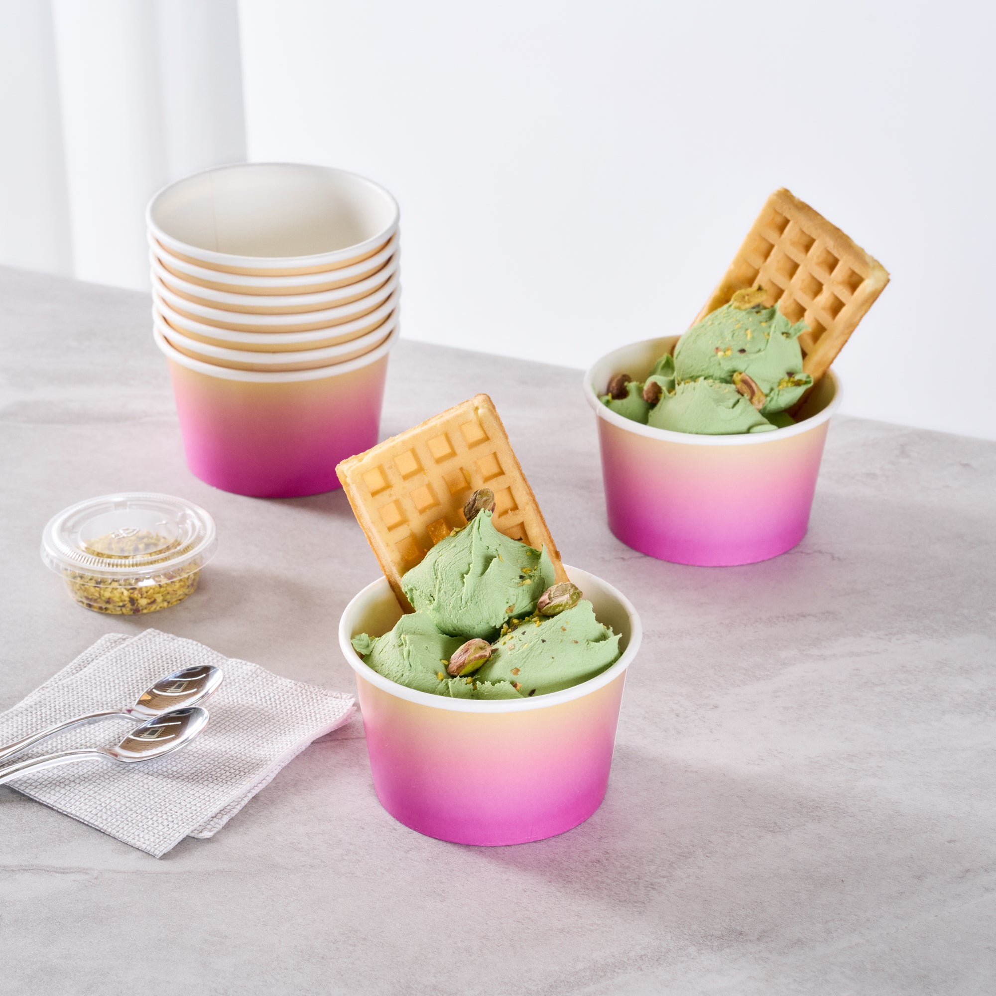 Keep desserts and snacks delightfully mess-free with these versatile cups. Coppetta Leak-Resistant Ice Cream Cups feature a waterproof coating that prevents leaks, making them ideal for serving ice cream and other treats without any mess. The hot food friendly design allows these cups to also serve as reliable soup cups, holding soups and stews with ease. With an 8-ounce capacity, these cups offer the perfect portion size for customer satisfaction. The grease-resistant surface supports oily snacks and cakes, ensuring a clean and appetizing presentation. Constructed from durable paper, these 8 oz paper cups are both recyclable and disposable, simplifying cleanup and supporting eco-friendly practices in foodservice operations. Measuring 3.75 inches in diameter and 2.25 inches in height, they are suitable for both hot and cold items, expanding menu options for takeout and delivery services. Each order includes 200 Coppetta Leak-Resistant Ice Cream Cups.