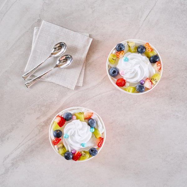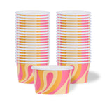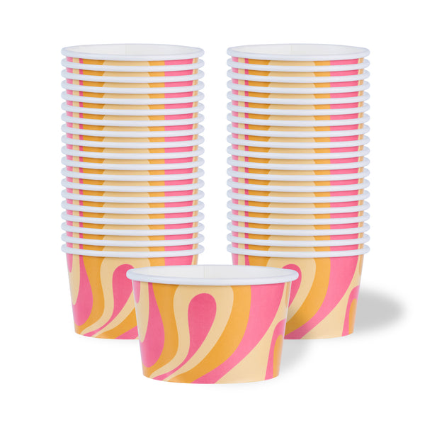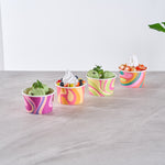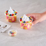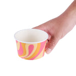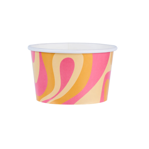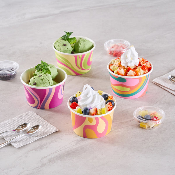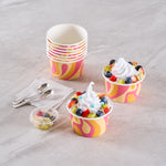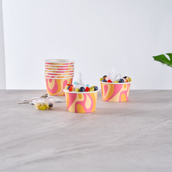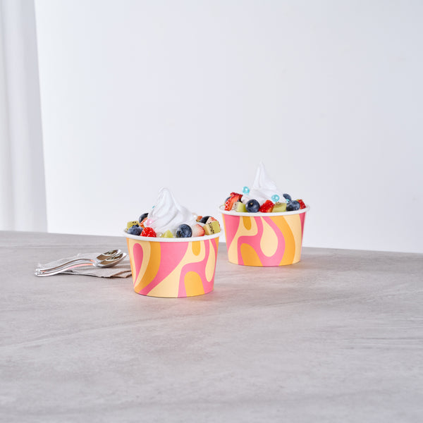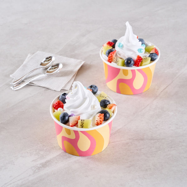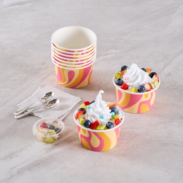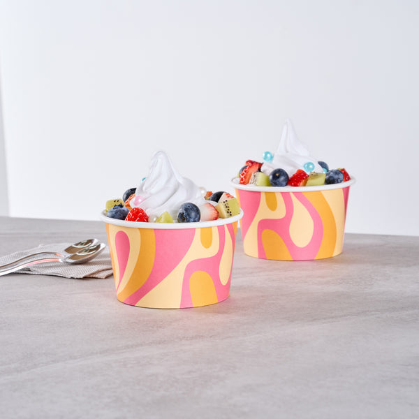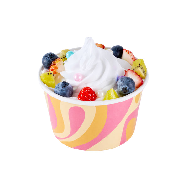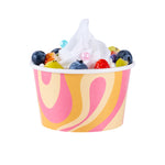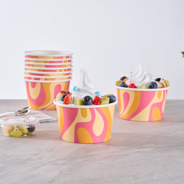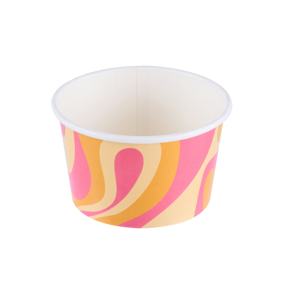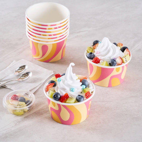 Our Coppetta 8-ounce Round Tropical Twist Paper To Go Cups are the perfect solution for serving your delectable treats with style and practicality. These round ice cream cups feature a grease-resistant PE lining, ensuring that oil doesn't seep through and maintaining a tidy food presentation. Made from durable paper, these takeaway dessert cups are versatile enough to serve both hot and cold foods efficiently. The recyclable nature of these frozen yogurt paper cups offers an eco-friendly option for your foodservice needs. With a rolled rim, these to go cups securely hold coordinating lids (SKU: RWP1769W), making them ideal for transporting food on-the-go. The tropical twist design of these disposable cups adds an upscale appearance to your frozen dessert offerings. As freezer-safe containers, these round ice cream cups allow you to conveniently refrigerate leftovers without worry. Measuring 3.82 inches in diameter by 2.28 inches in height, these cups boast an 8-ounce capacity to perfectly portion your servings. Sold in a 200 count box.