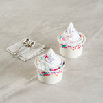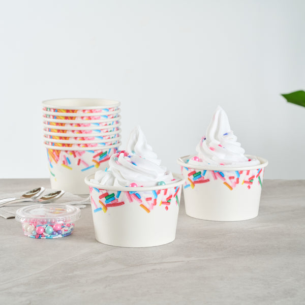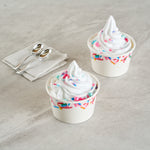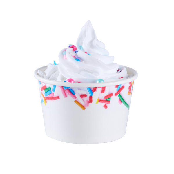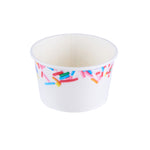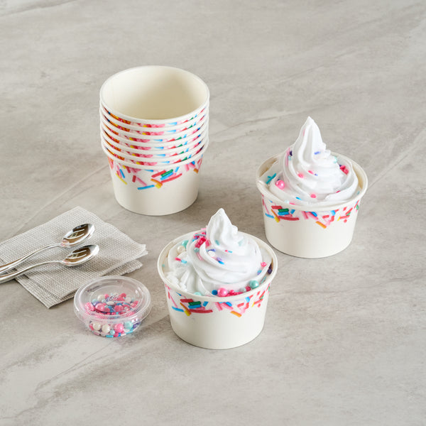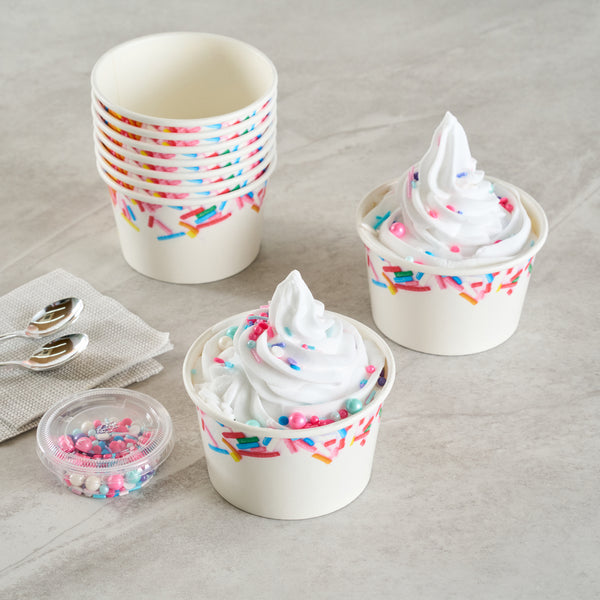 Enhance dessert presentation with festive sprinkle designs. The Coppetta Leak-Resistant Ice Cream Cup features a sturdy double-coated design that prevents liquid leakage, ensuring your ice cream cup stays intact even with the messiest toppings. With an 8-ounce capacity, it's the perfect frozen yogurt cup for serving delightful portions of ice cream or frozen yogurt. Its multi-purpose use supports both hot and cold dishes, making this disposable dessert container ideal for serving macaroni and cheese or a comforting bowl of soup. The grease-resistant coating is perfect for snacks and cakes, preventing any unsightly stains while maintaining its structural integrity. Measuring 3.82 inches in diameter and constructed from durable paper, these cups offer reliable containment and are freezer-safe for added convenience. Elevate your service with these versatile and visually appealing cups designed for both dine-in and takeout scenarios. Each order includes 200 Coppetta Leak-Resistant Ice Cream Cups.