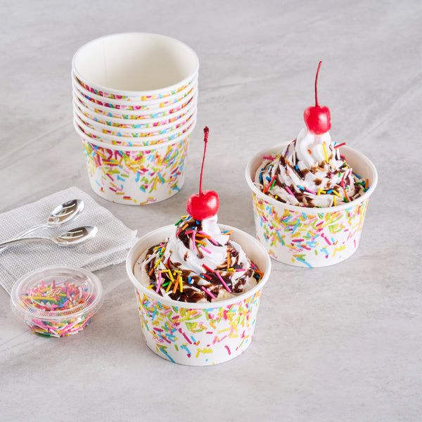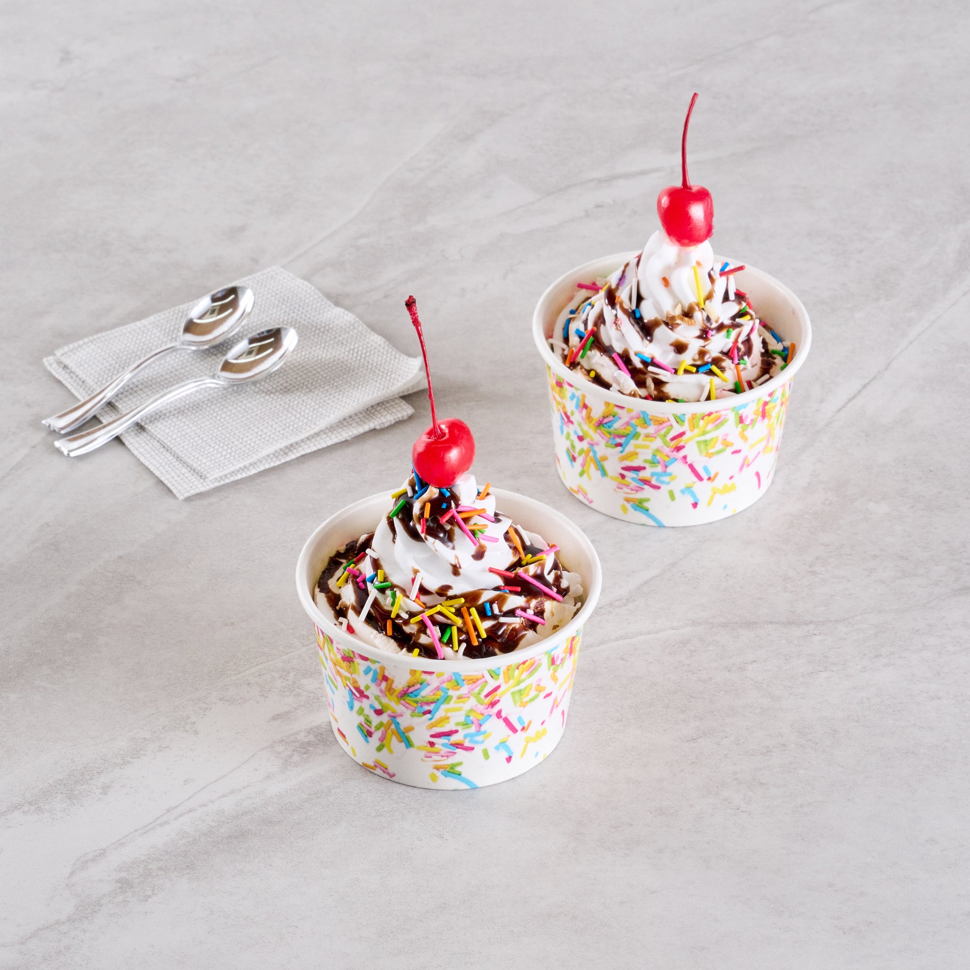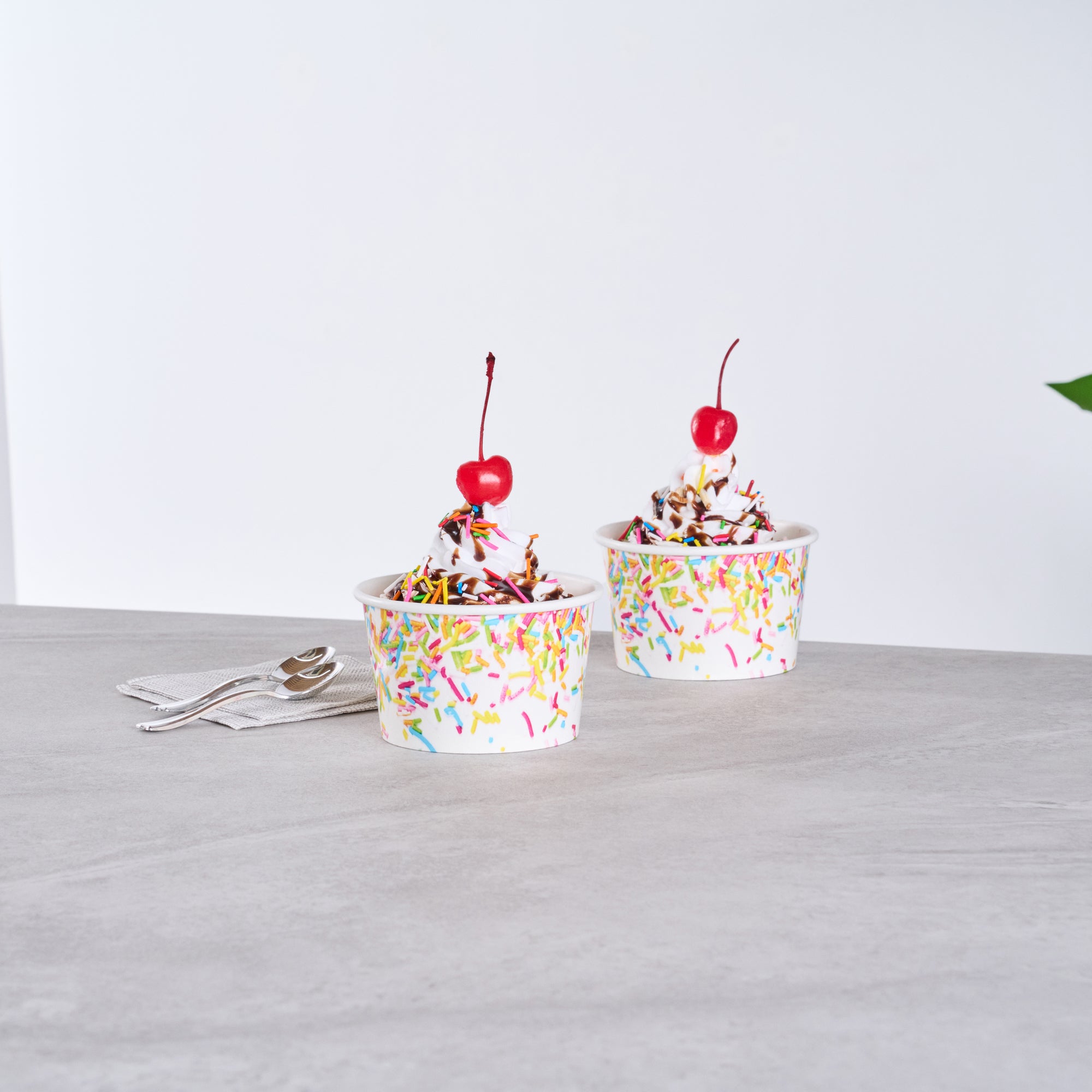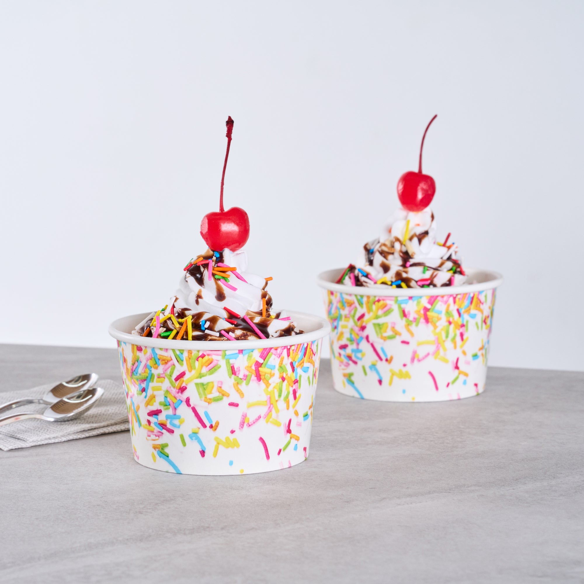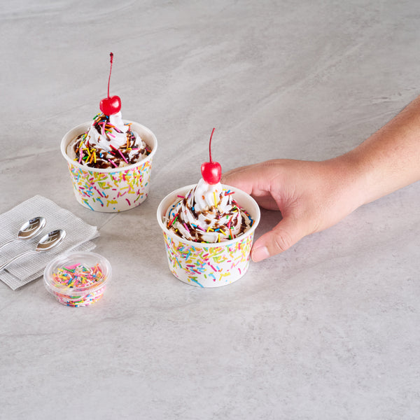 Our Coppetta 8-ounce Round White Paper To Go Cups are the perfect solution for stylish and sustainable foodservice. Designed with grease-resistant PE lining, these takeaway dessert cups ensure a neat food presentation by preventing oil from seeping through. Crafted from durable paper, these to go cups are suitable for serving both hot and cold foods, making them versatile for any menu item. The recyclable convenience of these disposable cups provides an eco-friendly option for serving and presenting food. Featuring a rolled rim, these frozen yogurt paper cups securely hold coordinating lids (SKU: RWP1769W) for easy transportation of your culinary creations. Adorned with party sprinkles, these premium paper frozen dessert cups elevate your food presentation with an upscale appearance. Freezer-safe, these round ice cream cups allow you to refrigerate leftovers without compromising quality. With a capacity of 8 ounces, these to go cups measure 3.82 inches in diameter by 2.28 inches in height, making them perfect for a variety of servings. Sold in a 200 count box.
