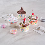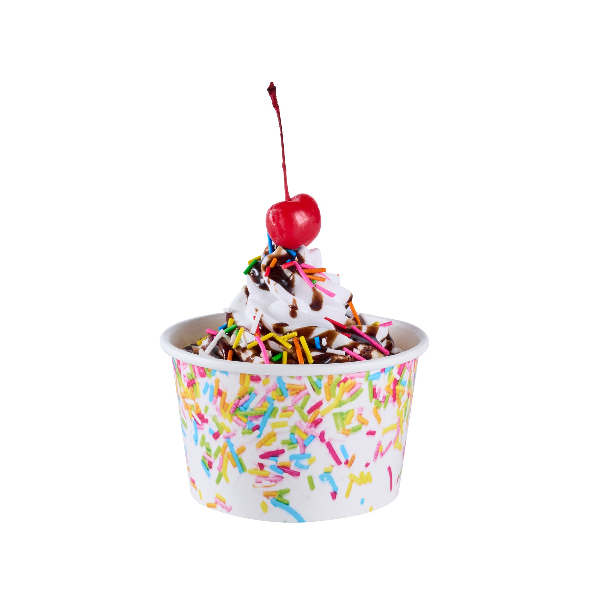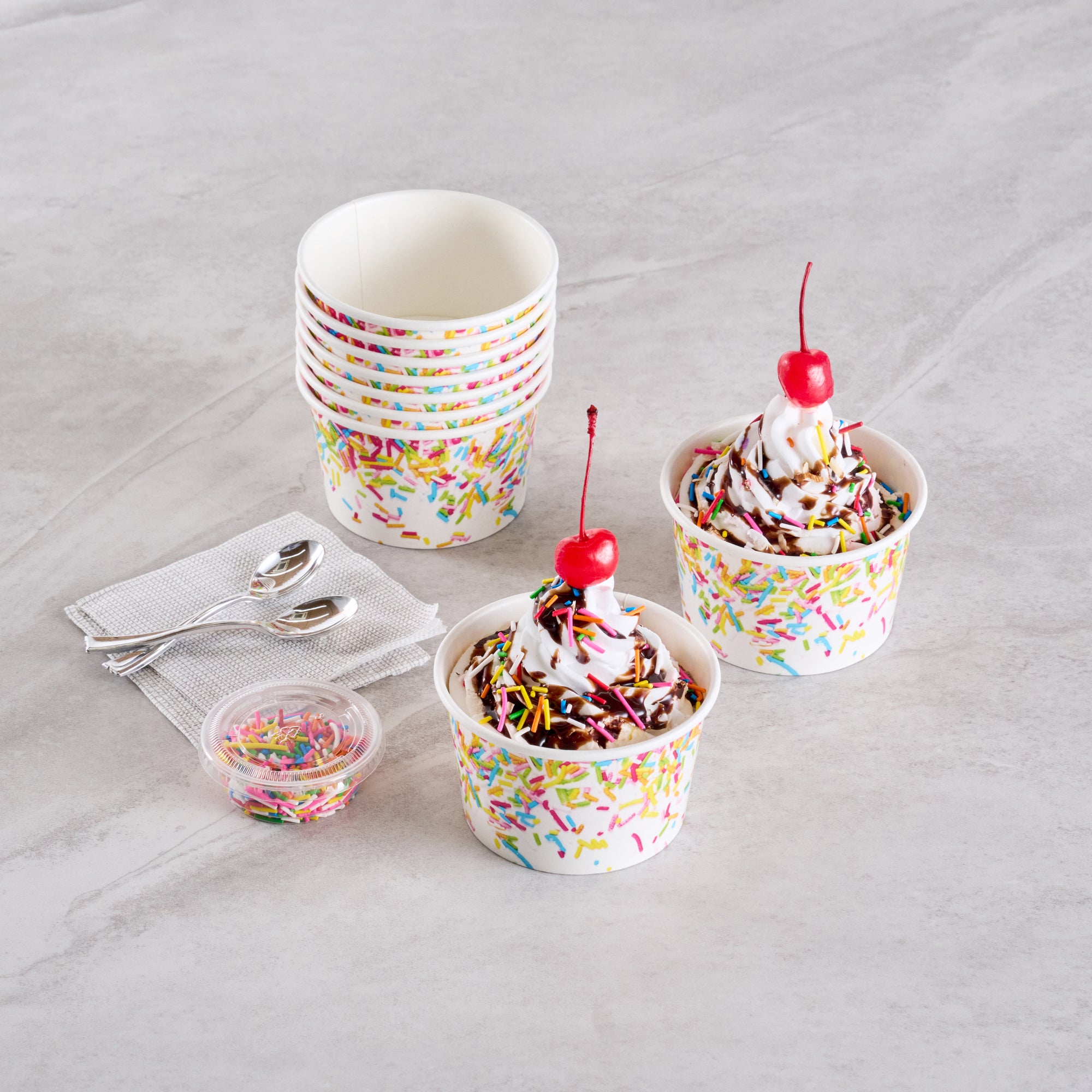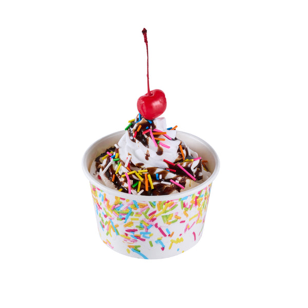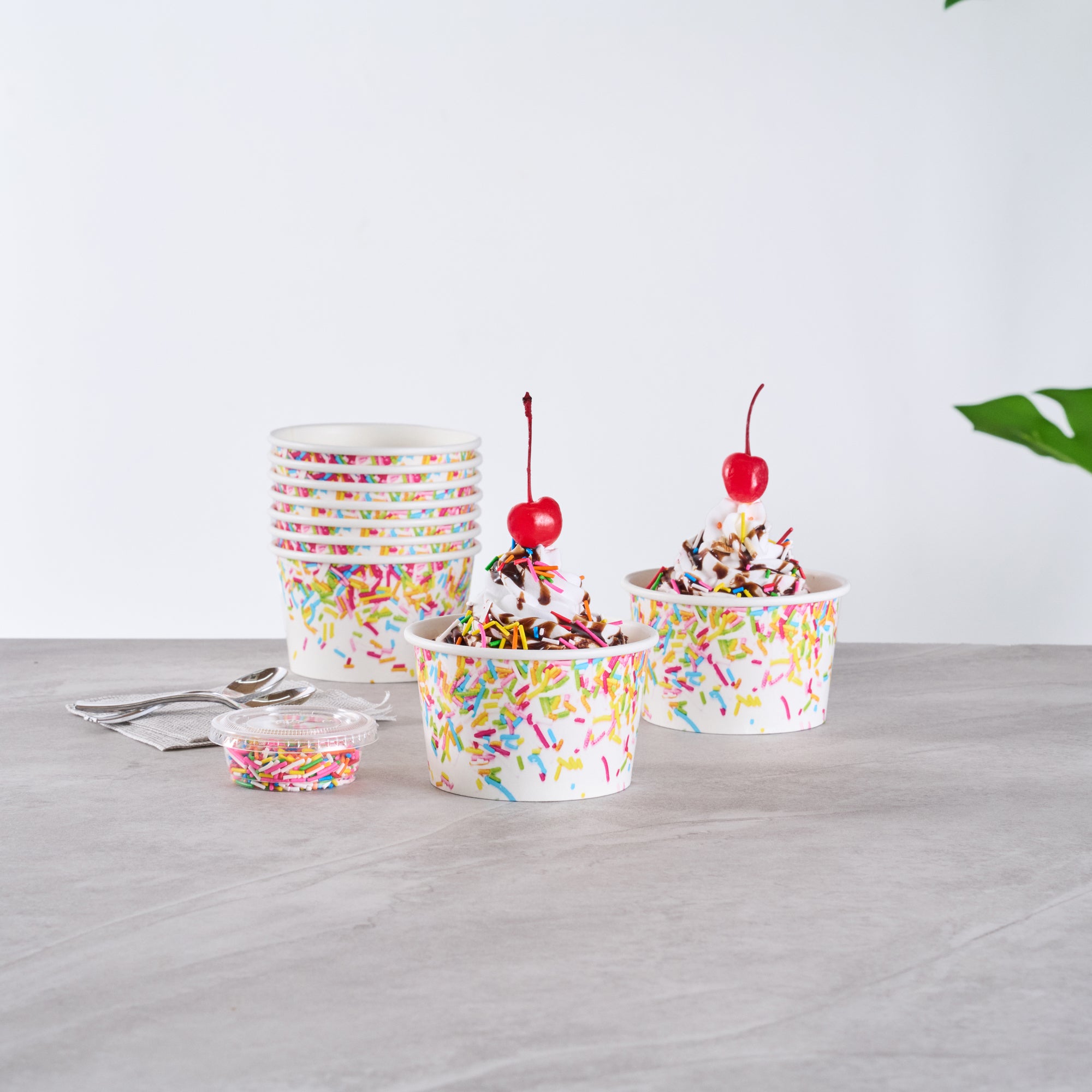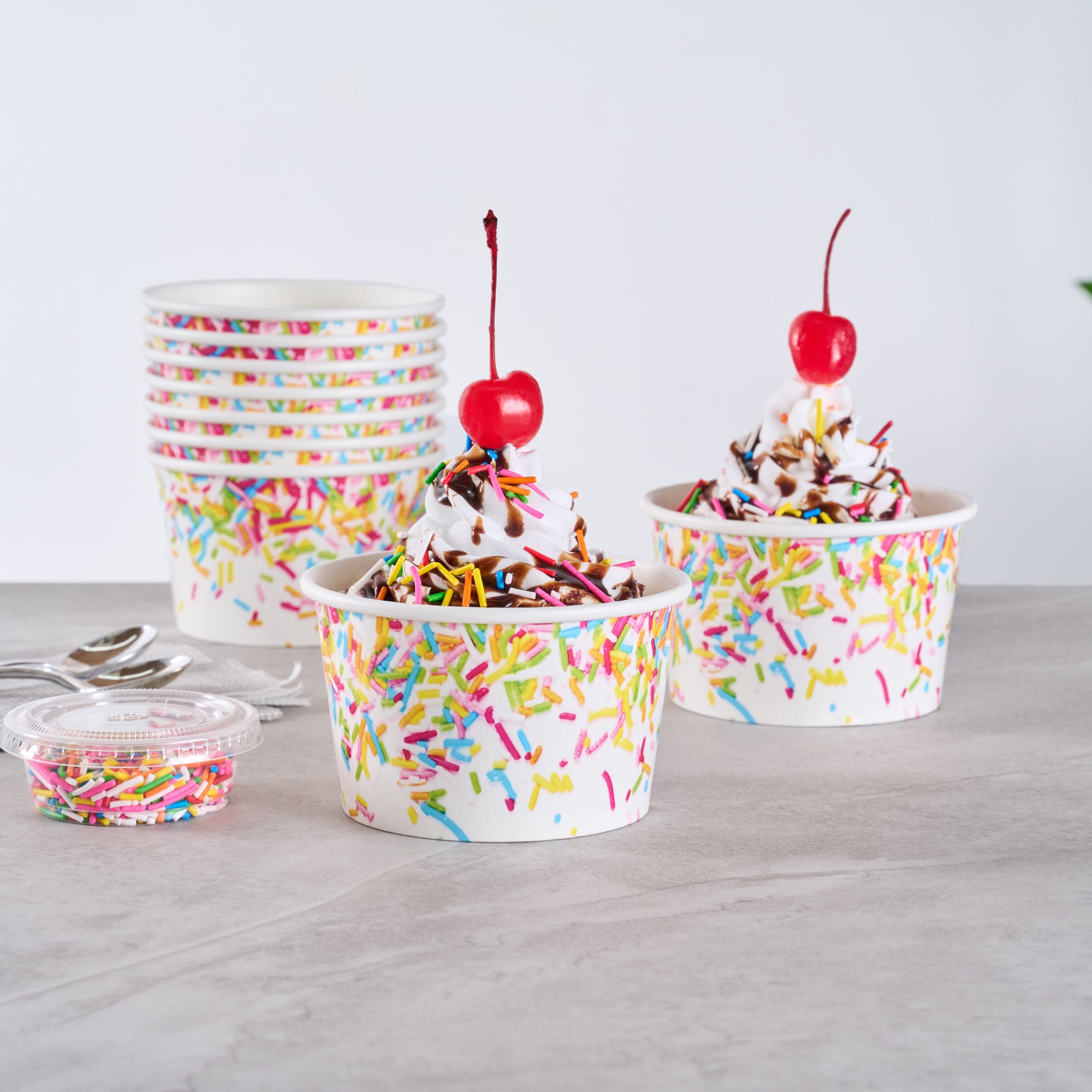 Our Coppetta 8-ounce Round White Paper To Go Cups are the perfect solution for stylish and sustainable foodservice. Designed with grease-resistant PE lining, these takeaway dessert cups ensure a neat food presentation by preventing oil from seeping through. Crafted from durable paper, these to go cups are suitable for serving both hot and cold foods, making them versatile for any menu item. The recyclable convenience of these disposable cups provides an eco-friendly option for serving and presenting food. Featuring a rolled rim, these frozen yogurt paper cups securely hold coordinating lids (SKU: RWP1769W) for easy transportation of your culinary creations. Adorned with party sprinkles, these premium paper frozen dessert cups elevate your food presentation with an upscale appearance. Freezer-safe, these round ice cream cups allow you to refrigerate leftovers without compromising quality. With a capacity of 8 ounces, these to go cups measure 3.82 inches in diameter by 2.28 inches in height, making them perfect for a variety of servings. Sold in a 200 count box.
