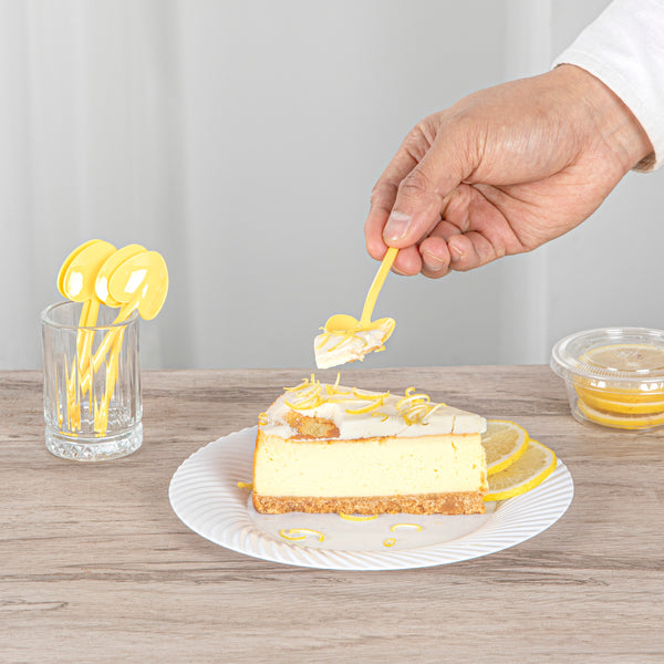 Infuse a vibrant burst of color into your sweet treats and delectable desserts with our Coppetta Baby Yellow Plastic Love Shovel Spoons. Featuring an eye-catching yellow finish, these recyclable sundae spoons will make your cups of perfectly swirled frozen yogurt and freshly scooped ice cream stand out. These spoons have a stylish shovel-shaped head that makes it easy to scoop up frozen and creamy desserts. The strong and sturdy handle of these heart shovel spoons do not bend or break while scooping ice creams from ice cream bowls. With these disposable dessert spoons, cleaning up after events is a breeze. Measuring 3.5 inches long by 1.25 inches wide, these gelato spoons perfectly brighten any table decor with their vibrant baby yellow finish. Shipped in a 500 count box.