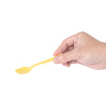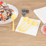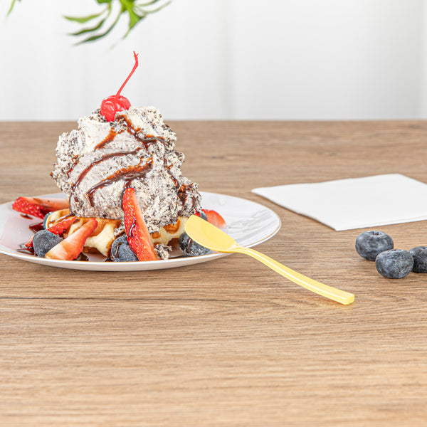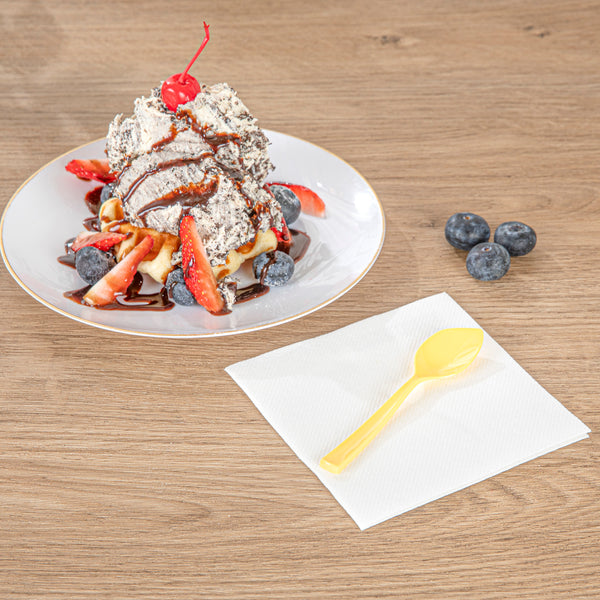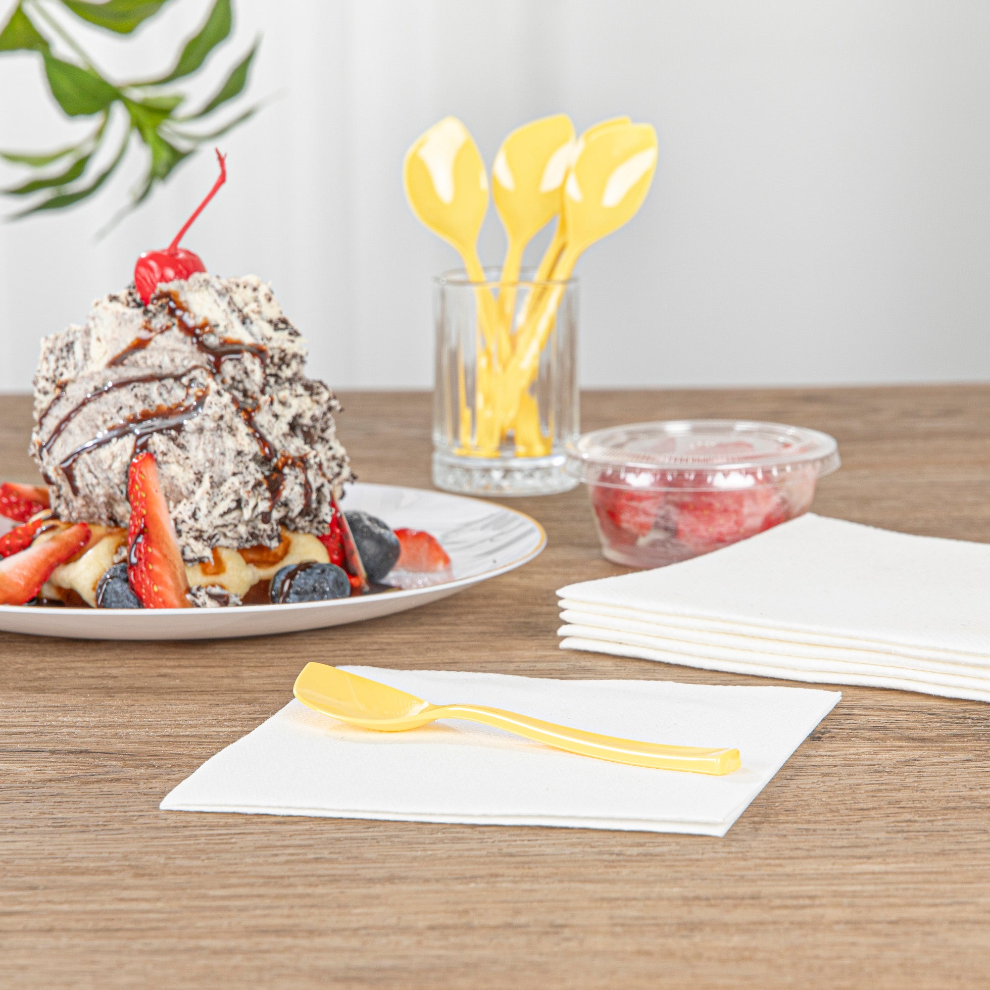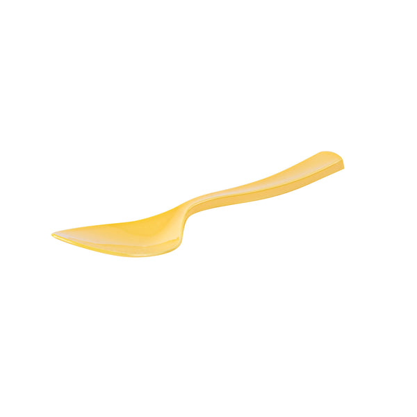 Bring a delightful pop of color to your frozen treats with our Coppetta Baby Yellow Plastic Petal Spoons. Made from premium plastic, these plastic petal spoons don't bend or break easily. The strong and sturdy handles of these disposable spoons make it easy to dig into tightly packed scoops of gelato or towering mounds of icy sorbet. These frozen yogurt spoons have a unique angled shape that ensures that your customers can scoop up every last delicious morsel. Featuring a sunny yellow finish, these plastic spoons look great inside big bowls of hand-scooped ice cream and cups of freshly swirled frozen yogurt. Each dessert spoon measures 4.5 inches in length by 1 inch in width, making them ideal for serving alongside all types of frozen treats and delectable desserts. Shipped in a 100 count box.
