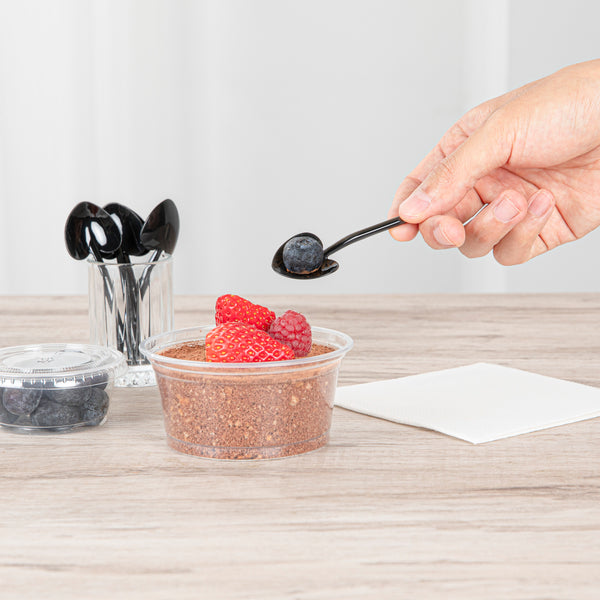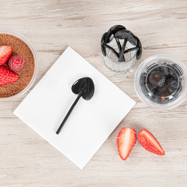 Elevate your fro-yo experience with our Coppetta Black Plastic Love Shovel Spoons. These charming dessert spoons are shaped like tiny hearts for a delightfully charming way to enjoy any frozen or creamy dessert. Ideal for serving samples, these disposable spoons are perfect for Valentine's Day, wedding receptions, or romantic banquets. Constructed from recyclable plastics, these shovel spoons help reduce your carbon footprint. The long and sturdy handle of these mini-tasting spoons makes them convenient to hold and scoop desserts or appetizers from deep bowls. These small ice cream spoons come in a stylish black finish and measure 3.5 inches in length by 1.25 inches in width. Sold in a 500 count box.