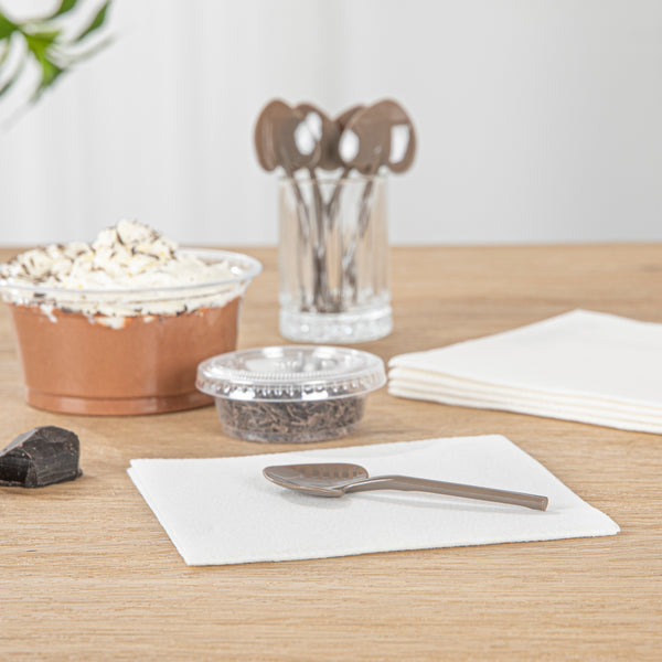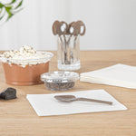 Make your customers' frozen yogurt experience special with our Coppetta Fashion Gray Plastic Love Shovel Spoons. Featuring an enticing shovel-shaped design, these mini dessert spoons are perfect for scooping up big bites of ice cream sundaes and heaping spoonfuls of swirled frozen yogurt. These recyclable heart-shaped spoons have strong and sturdy plastic construction that makes it easy to dig into big bowls of hand-churned ice cream and effortlessly scoop them up. The long handle of these ice cream spoons is designed to be easy to grip and comfortable for customers to hold. Plus, the ultra-stylish gray finish of these dessert spoons makes them perfect additions to trendy ice cream parlors and fro-yo hot spots. These heart-shaped shovel spoons measure 3.5 inches in length by 1.25 inches in width. Sold in a 500 count box.