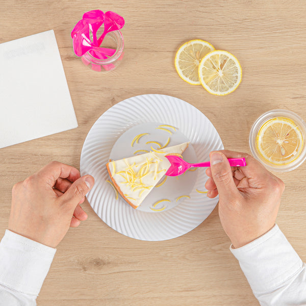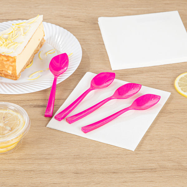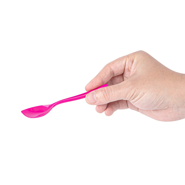 Add a pop of color to your delectable desserts with our Coppetta Magenta Plastic Petal Spoons. These frozen yogurt spoons are crafted from high-quality plastic and won't bend or break under the weight of heavy scoops. With a sleek pointed tip, these disposable spoons effortlessly pierces through frozen mounds of gelato and packed scoops of sorbet. These cake spoons have strong and sturdy handles that expertly manage heavy bites of desserts. Designed in a bubbly hot pink color, these plastic spoons are a perfect addition to popular ice cream parlors and trendy frozen yogurt shops. These dessert spoons measure 4.5 inches by 1 inch in width. Shipped In a 500 count box.
